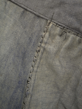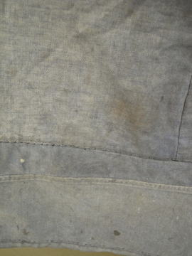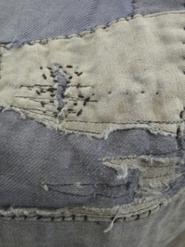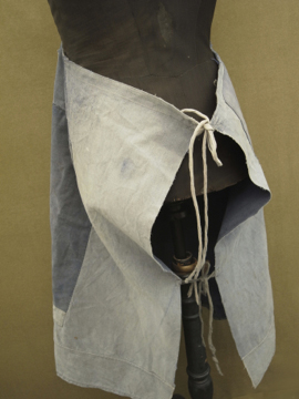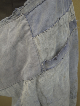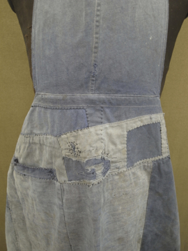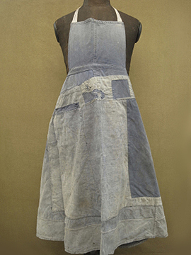 1930年から1950年代頃につくられたブルー・エプロン。コットン素材です。色の濃淡が美しいパッチされた直しが面白い品です。直しは手縫いとミシン縫いの部分があります。ポケットが一つ。直しながら大切に使われてきた品です。汚れ、スレ、穴等のかなりの使用感がありますので、古いものに慣れた方にお勧めいたします。