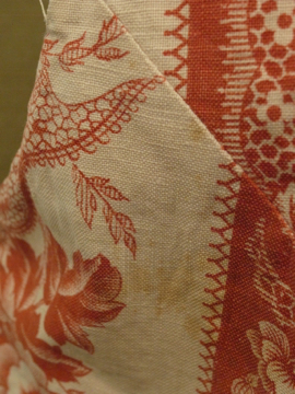 1920年から1930年代頃につくられた大胆な花柄プリントのコットン地に綿を挟んだキルティングの女性用ジレ。プリントのくすんだ赤と生地の色が美しいです。詰まった首、裾に向かって広がるシルエット。裾周りが115cmと大きく、やせた人が着ると後ろがはねます。アームホール周りはきつく48cm程です。小さな赤いガラス製の綺麗なボタンが使われています。ボタンホールは手縫い。裏には全体に綿を留める糸が出ており、一部ほつれがありますが着用には問題ないです。裏地の肩あたりに傷みがありますが、表地の状態は良好です。シミが少しあります。