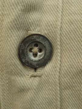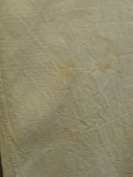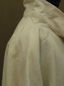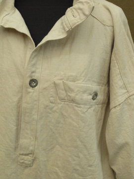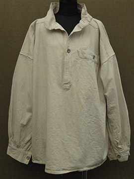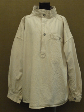 1950年代頃までにつくられたプルオーバートップ。程よく柔らかくなったコットン素材で着やすいです。高さのある襟、肩に入ったY字のヨーク、胸に大きなポケット。ボタンはメタル製。広い身幅で短い丈のシルエットが独特です。ボタンに多少のサビ、全体的に薄い汚れやシミがありますが、破れ等の大きなダメージはありません。