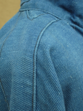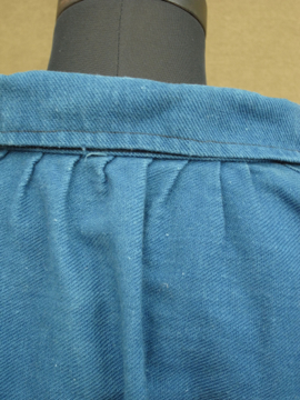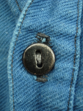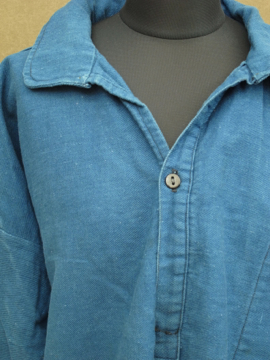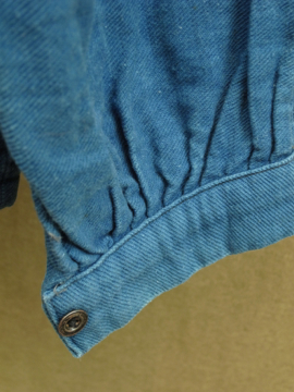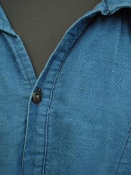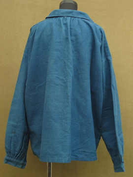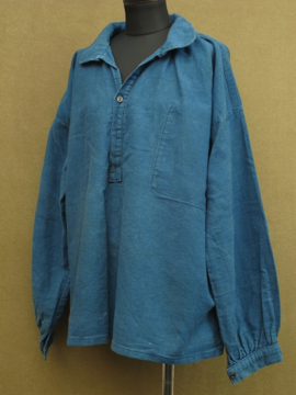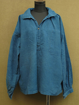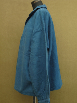 インディゴ染めコットンツイルのプルオーバー。1940年から1950年代頃につくられたものだと思います。美しい色でソフトな生地感の良い素材です。フロントに1つボタン、肩にY字のヨーク、内ポケット付き。肩幅や身幅が広く、肩を落として着るシルエットが綺麗です。フロントのボタンは黒いラッカー塗り、袖口には小さなメタルボタンがついています。シンプルですがこのような良い生地でこの形は珍しいです。