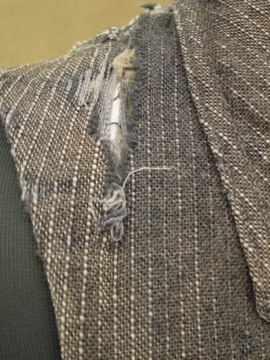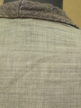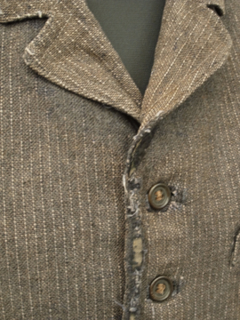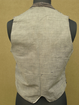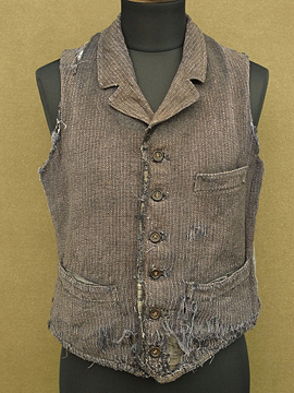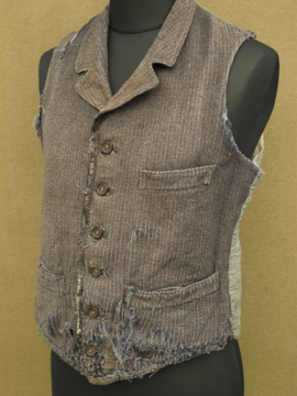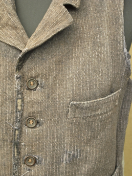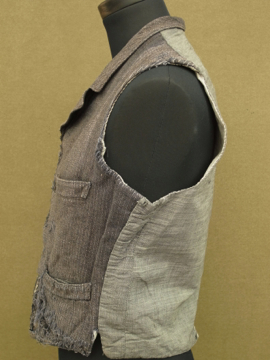 1930年代頃につくられたストライプ・ベスト。フロントはウールとコットンが使われたストライプ織の布地、バックはごま塩シャンブレーの良い布地が使われています。元々子供用だったようですが、細身の女性が着用できるサイズです。フロントのウール地部分を中心に、大きな裂けや穴、擦れなどかなりの使用感があります。かなり古く良い雰囲気がありますので、ダメージを気にされない方にお勧めです。