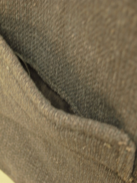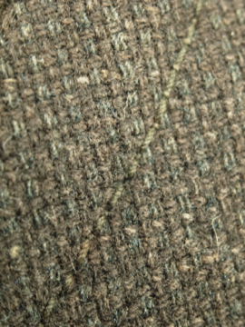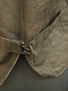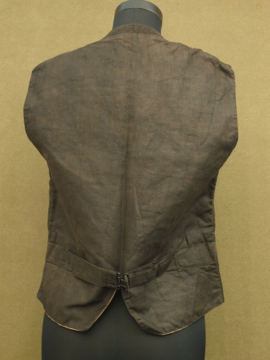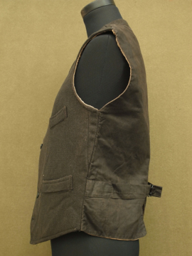 20世紀初期頃につくられたウール・ジレ。肌触りの良いオリーブと茶の美しい布地です。襟が特徴的で珍しい品、フロントは6つのボタン留め、3つのポケット。ボタンは3つなくなっています。ボタンホールは手縫い。バックのストラップで多少の身幅調節ができます。多少のスレや裏地にシミがありますが、状態はとても良いです。男性のSサイズくらいです。