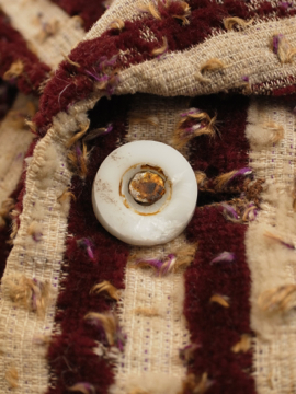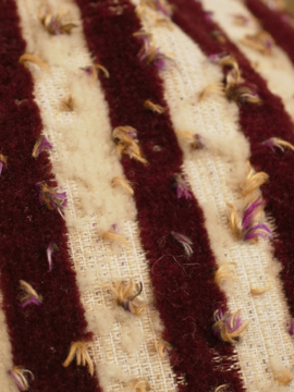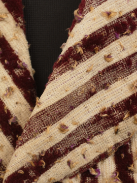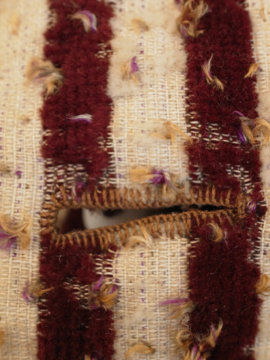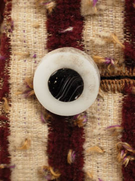 19世紀につくられたパープルのストライプ柄ジレ。前身頃のベルベットに糸が出た凝った布地はクラッシュド・アーモンドがかかったカシスのケーキを思わせます。ボタンもとても美しいガラスのタンが使われていますがダメージが多くほとんどが欠けており、下の3つはボーン製ボタンに付け替わっています。脇、裾、襟、肩を中心に起毛した毛が抜けてフラットになっています。後ろ身頃には中央に裾から上部まで縫われた直し等の大きな直しが多数、ストラップ周りに裏地の白い部分が見える穴が数カ所あります。
