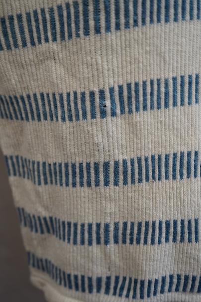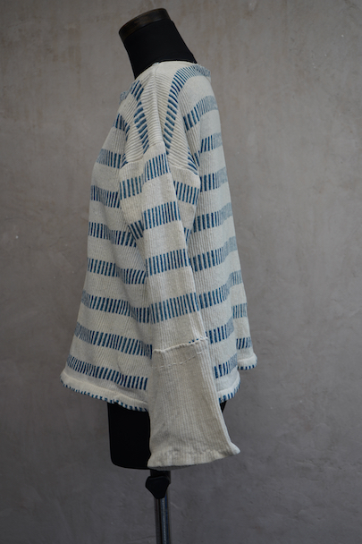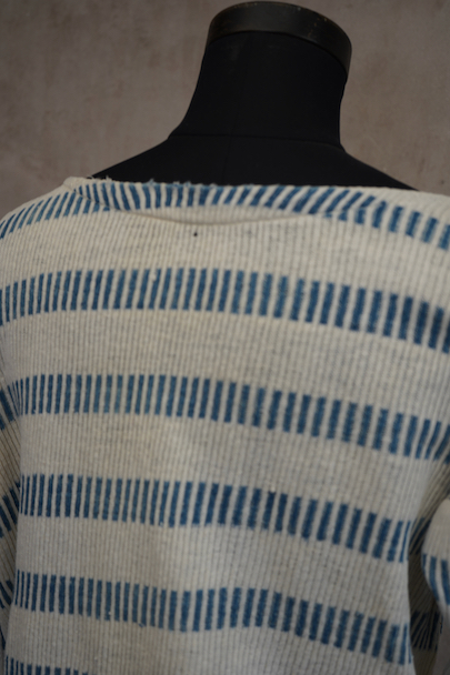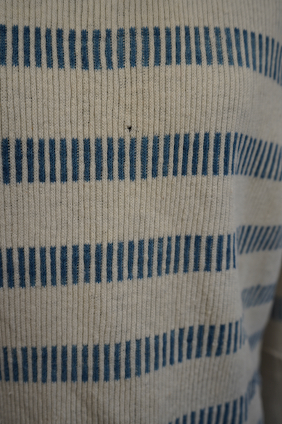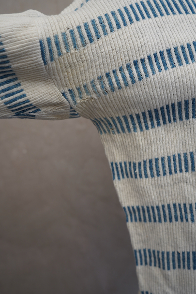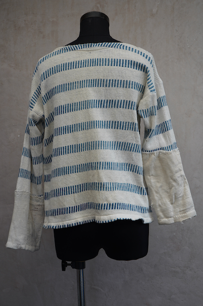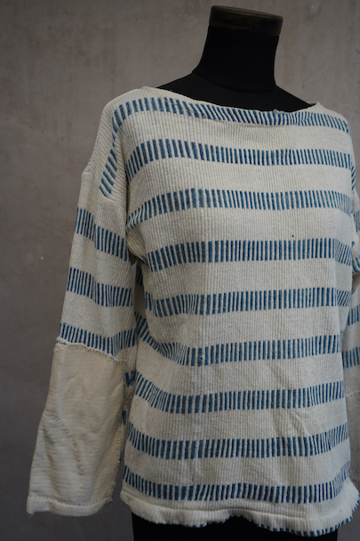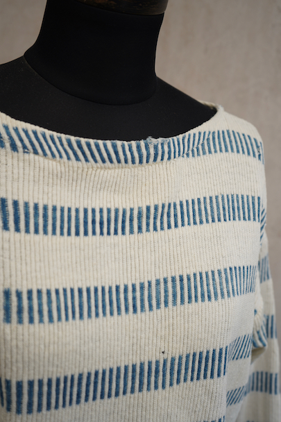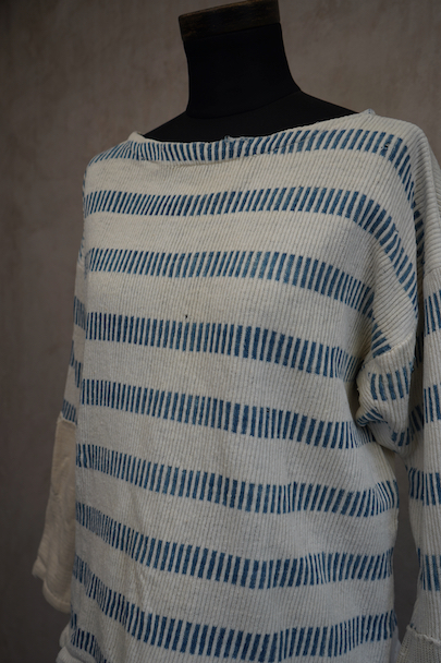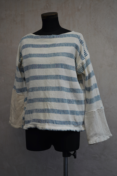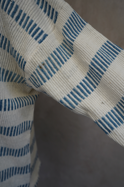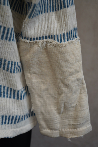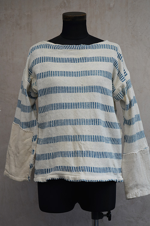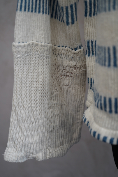 1930年代頃につくられた コットン・ニット・トップ。インディゴと白の破線ストライプ、この編み柄のものは希少です。両袖に布が接がれた直しがされ、左右の袖丈が違iいます。その他にも左右の肩幅も少し違うなど、歪な形をしています。小さい穴、薄くなった部分があります。ダメージを気にされない方、直しながらご愛用いただける方にお勧めします。ニットですが伸縮性はほとんどありません。