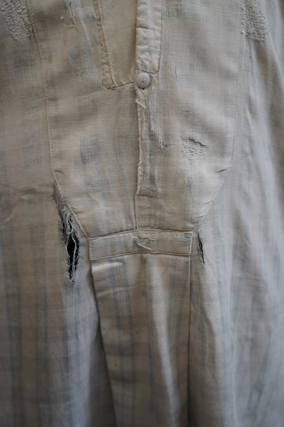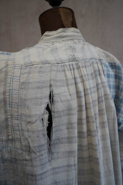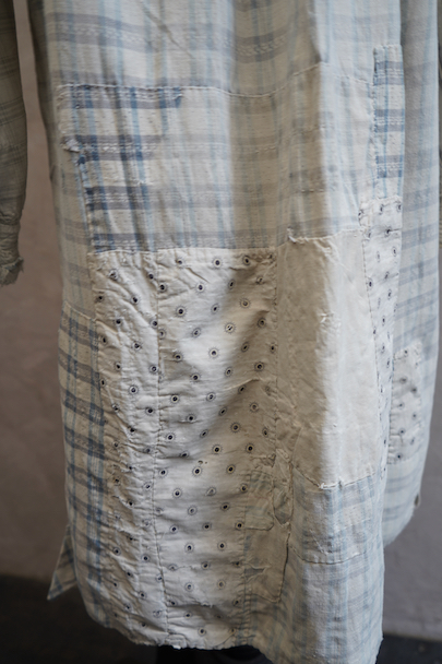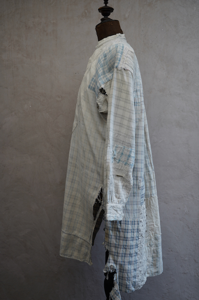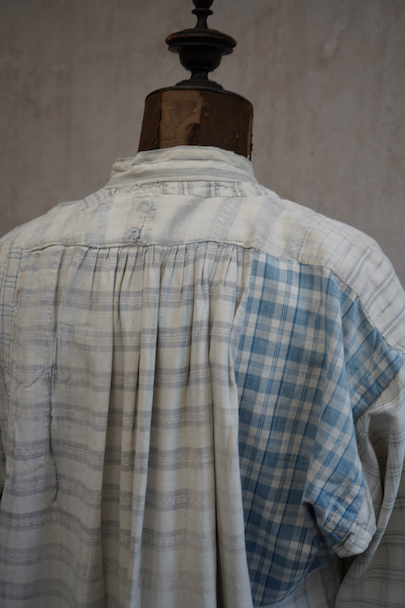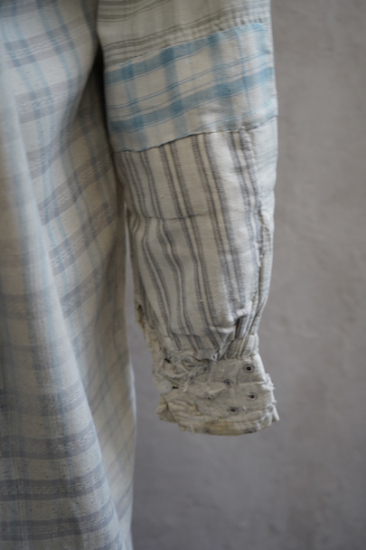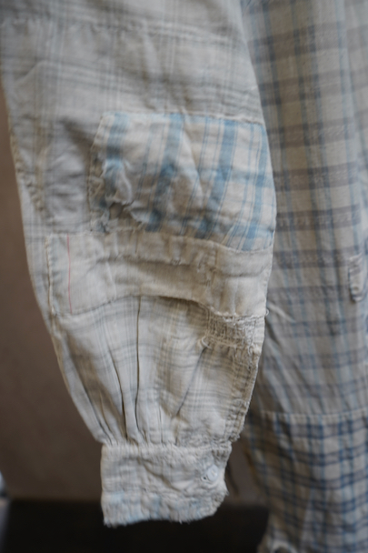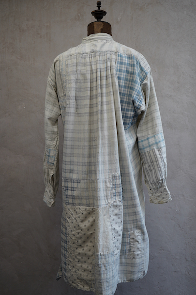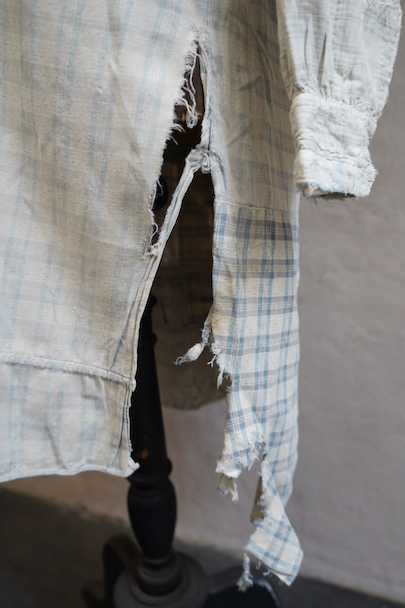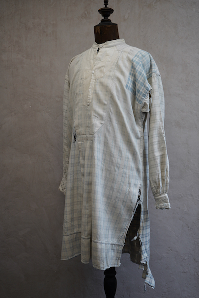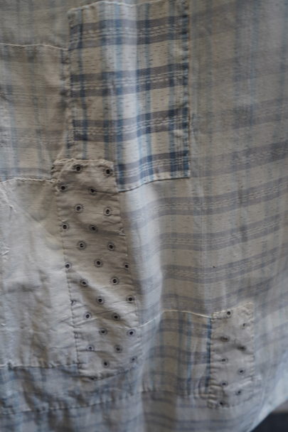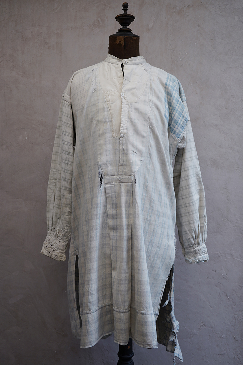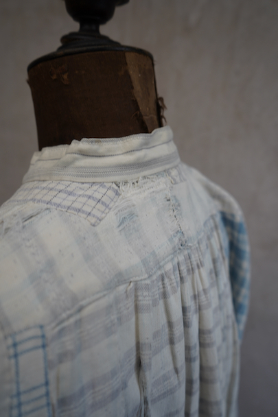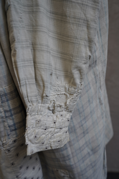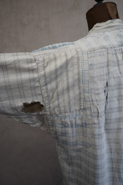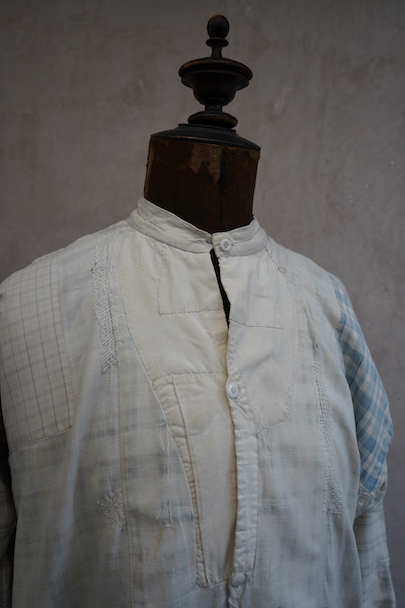 使い込まれ、様々な布を当てられ補修を繰り返しながら着られてきたことが伺えるシャツ。1930年代頃までのものだと思います。元々は白地にグレー・チェック柄の布地です。そこに色の入ったチェックや柄物の別布でパッチワークされた様子はとても味わいがあります。プルオーバー・タイプ。全体的に裂けや穴、布地が弱っている部分があります。