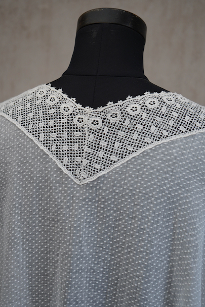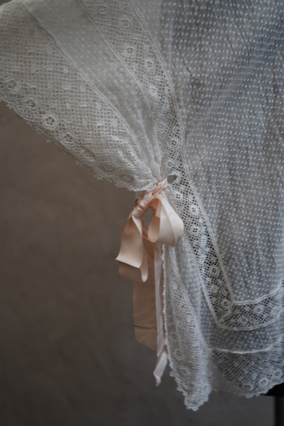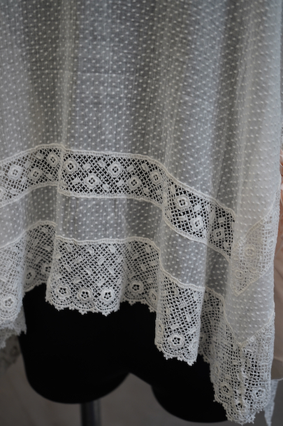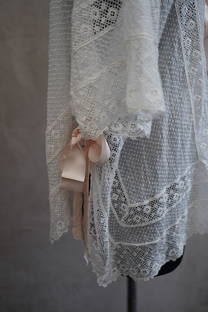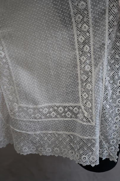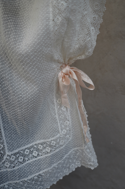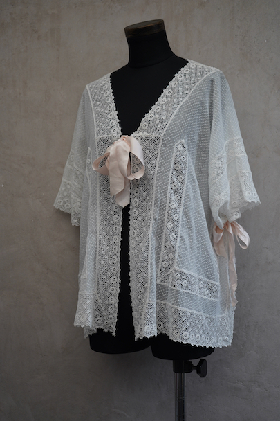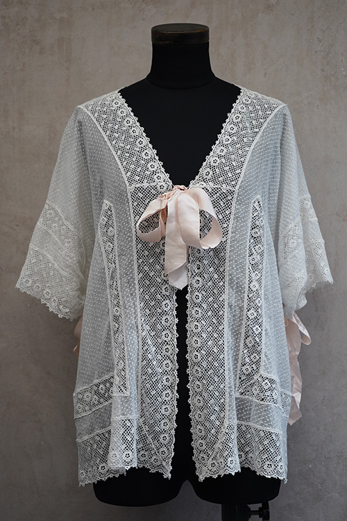 1920年代から1930年代頃につくられたレースブラウス。フロントとサイドをピンクのシルクリボンで留める可愛らしいデザインです。コットン素材で、透け感のあるドットの布地や花柄レース使いも良いです。フロントは上部のリボンで留めるだけなので、フリーサイズでご着用いただけると思います。状態は良いです。