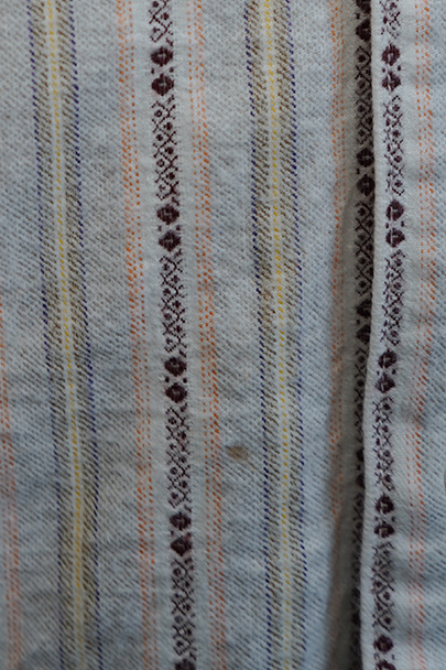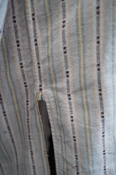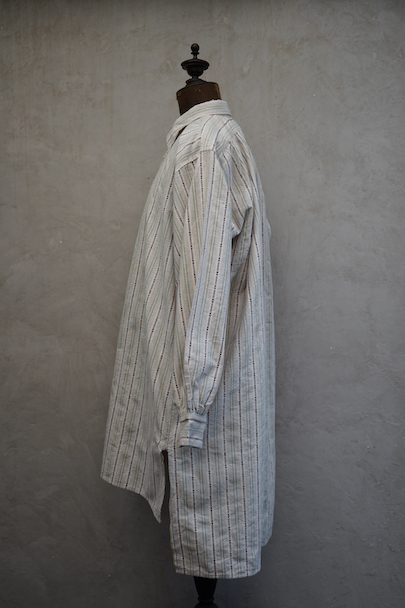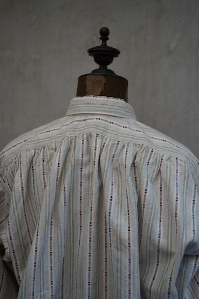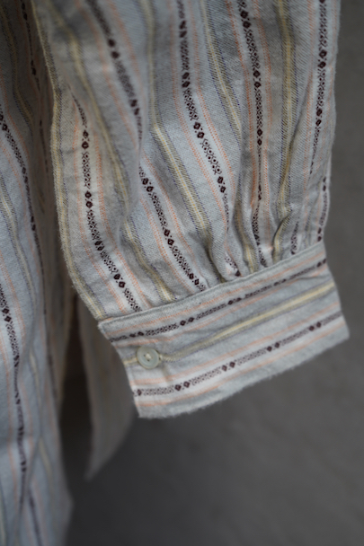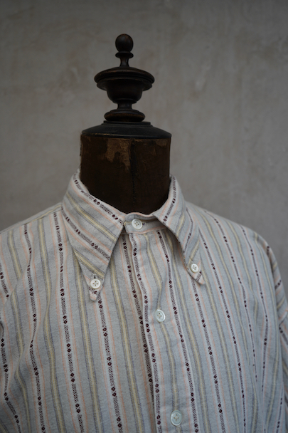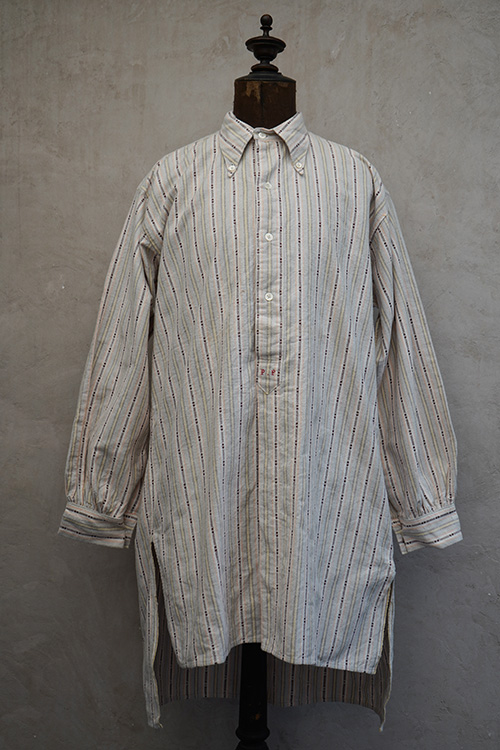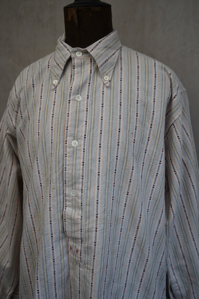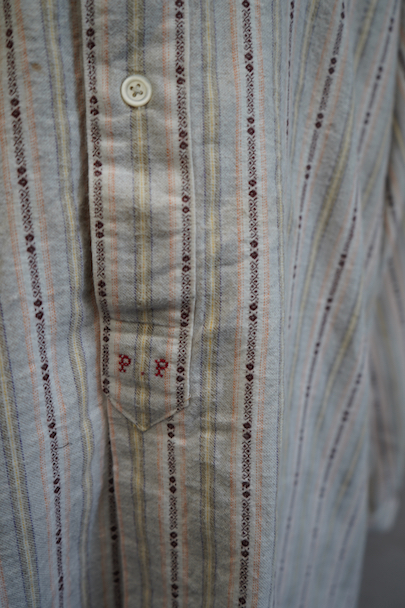 1930年代頃につくられたストライプ・シャツ。デッドストックを一度洗濯しています。細かい柄の入った良いストライプ織りのコットン生地が使用されています。淡い黄色やオレンジの糸も使用され、若干起毛して柔らかな雰囲気です。襟はボタンダウン、ボタンはシェル製、ボタンホールは手縫いです。前立て下に"P.P"と赤いイニシャル刺繍があります。わかりにくいですが、小さなシミがあります。状態は良いです。希少な大きめサイズのシャツです。