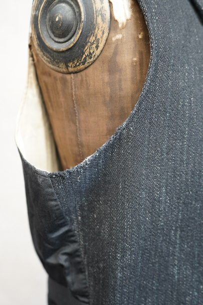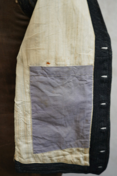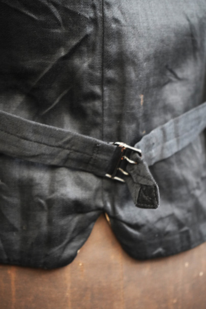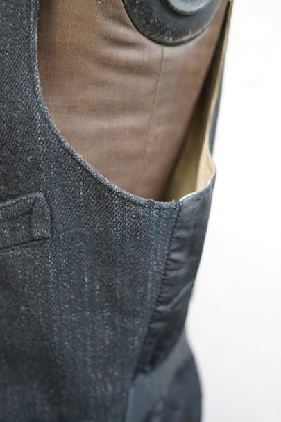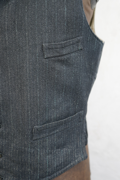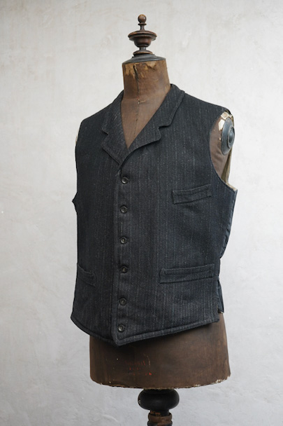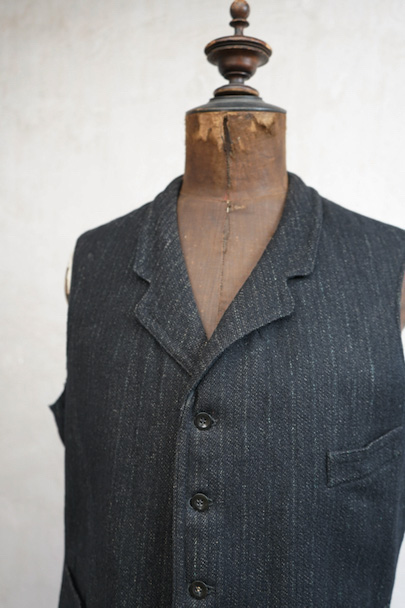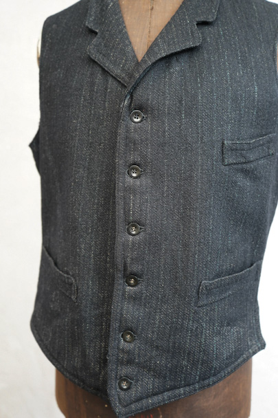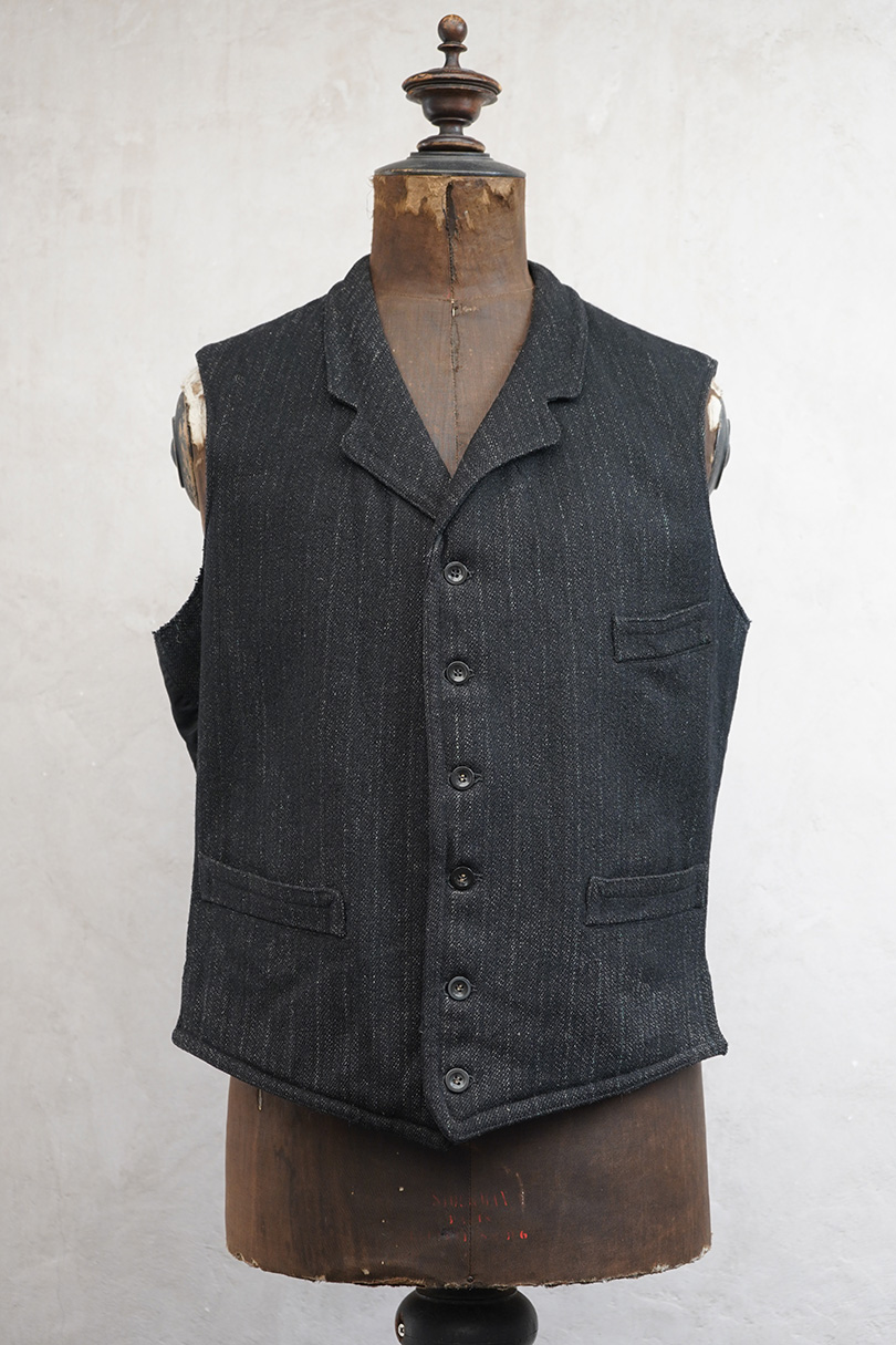 1930年代頃までにつくられたジレ。襟のついたフロントはごま塩ストライプのウール素材、後ろ身頃は少し光沢のある黒い布地、裏地はベージュのストライプです。バックシンチで身幅の調節ができます。フロントに3つのポケット、後付けされたような内ポケットがあります。裏地にシミが多くあります。表地はアームホールに擦れたダメージがあります。裾や前立てにも多少の擦れ、その他、小さい穴があります。