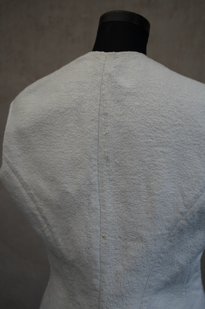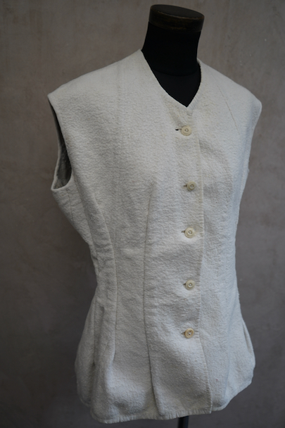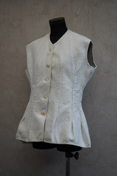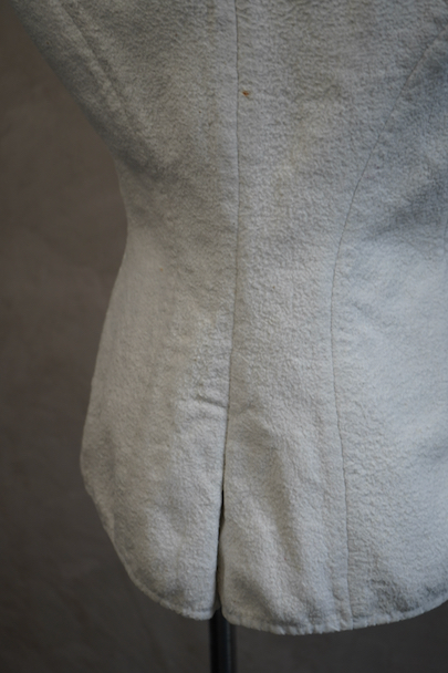 20世紀初期までにつくられたスリーブレス・トップ。起毛した中厚手のコットン素材で、手縫いで丁寧につくられています。細かく切り替えが入り、身体のラインに沿った立体的なつくりです。バックの裾が長めで、シェイプされたウエストから裾に向かって広がるシルエットが綺麗です。ボタンはガラス製で一番下のみボーン製です。ガラスボタンには所々欠けが見られます。バック上部に手縫いの直し痕がありますが、起毛で目立ちにくいです。小さな染みや糸のほつれがありますが、使用に問題ない程度のものです。古く良い雰囲気を持った良い品です。