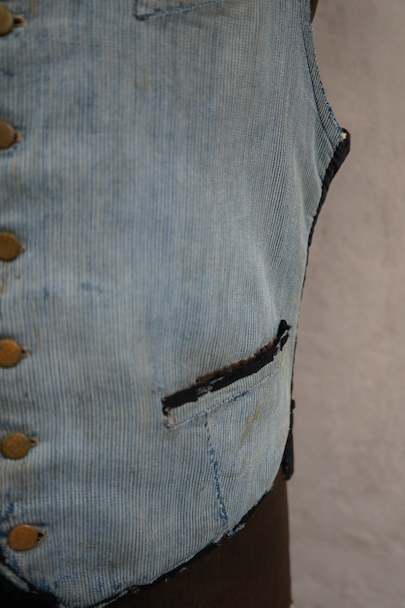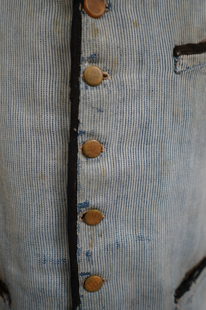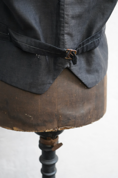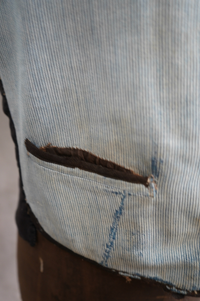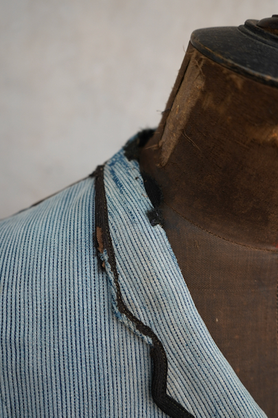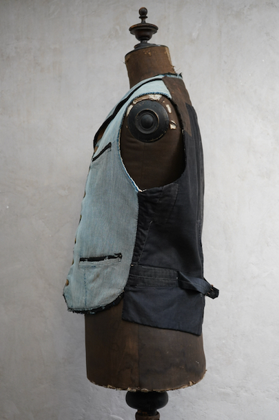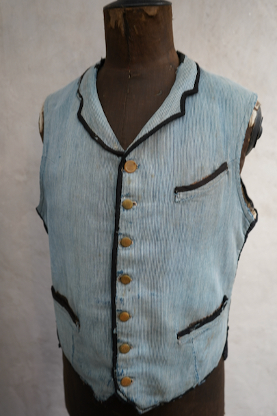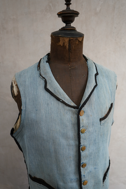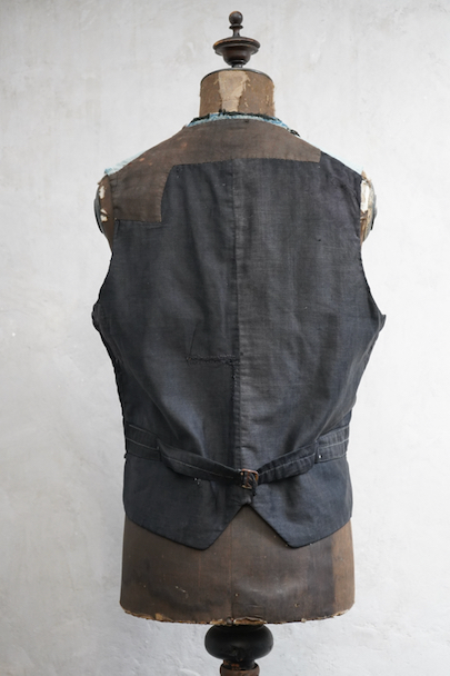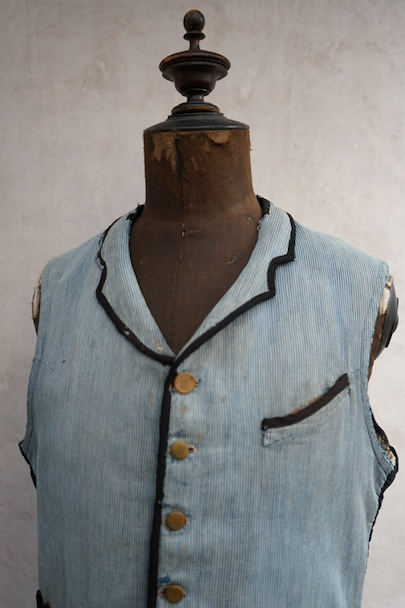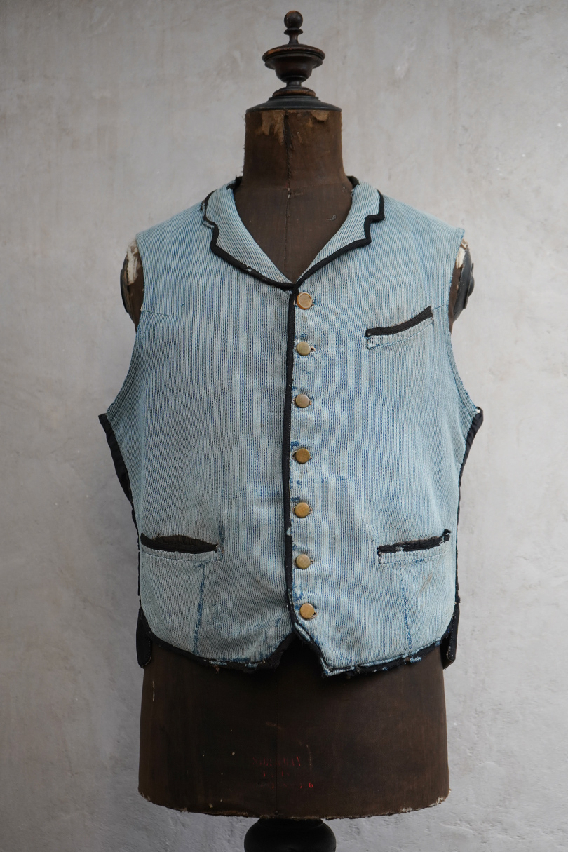 20世紀初期頃につくられたインディゴのコットン・ピケの布地が前身頃に使われたジレ。とても珍しい布地です。小さい襟、左胸についた傾斜のついた小さなポケット、襟、前立て、ポケットはバイピング。バックは布が接いだ直しがされています。バックシンチで身幅の調節ができます。パイピングの劣化や擦れ、直し痕、裏地の破れなど、使用感が多いです。 トップのボタンがつけ替わっています。