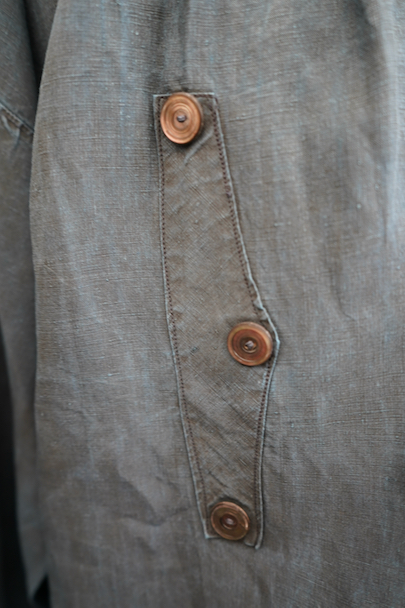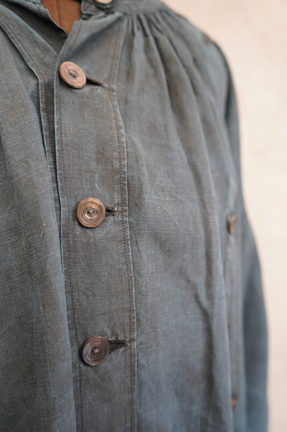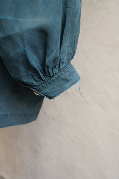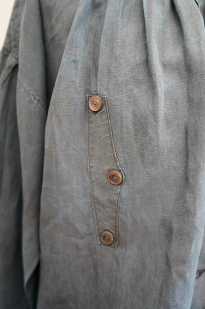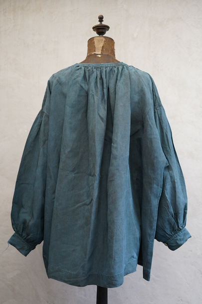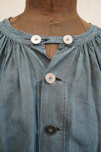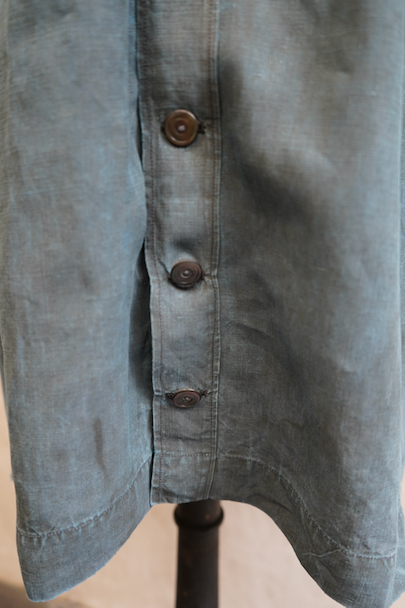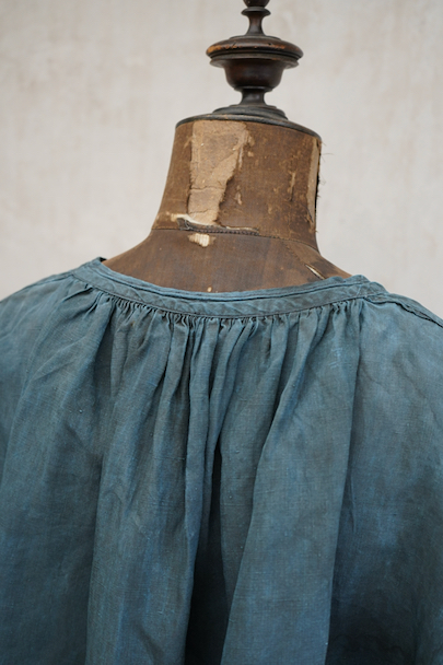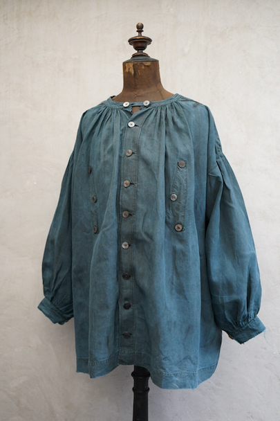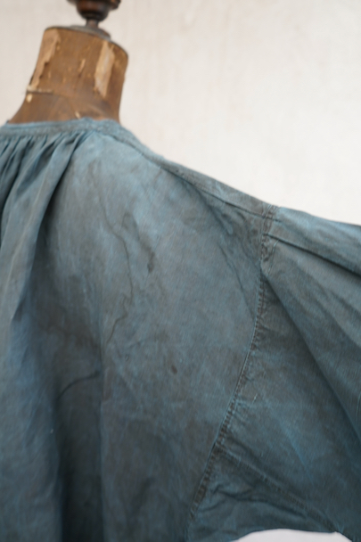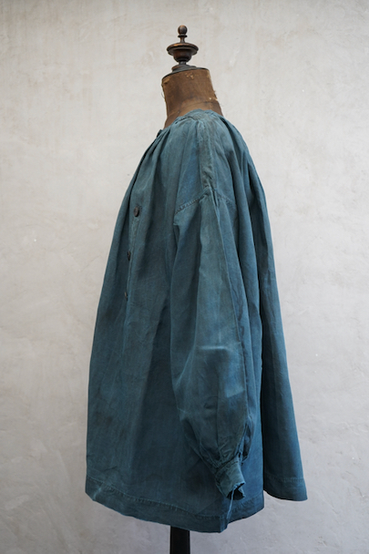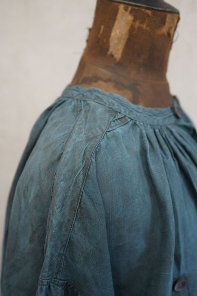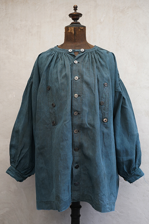 20世紀初期頃につくられたインディゴ染めリネンスモック。主に家畜商などが着用したワークウェアです。薄手で目の詰まったインディゴ染めリネン地はハリと柔らかさを感じさせる良い質感です。ネックまわりや袖口に細かいギャザー、肩にヨーク、手縫いの素朴なボタンホールに滑らかな質感の黒蝶貝ボタン 、フロント・トップのボタン留めストラップなど、ディテールが良いです。両胸についているのはポケットではなく飾りです。短めの丈でフロントが全開するので使いやすいです。袖口や裾などに擦り切れ、全体的に小さい穴や小さい直し痕、シミ、肩から袖にかけて色むらがあるなど、経年の傷みがあります。古いものに慣れている方やダメージを気にされない方にお勧めいたします。採寸は平置きで広げずに計測しています。