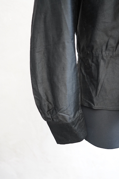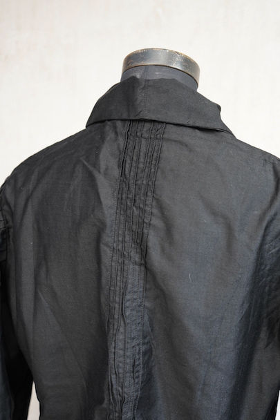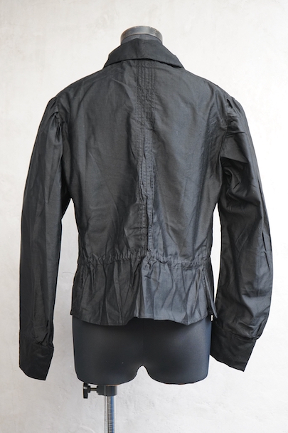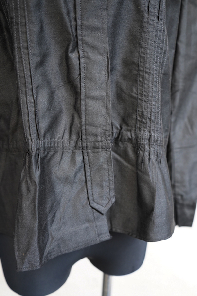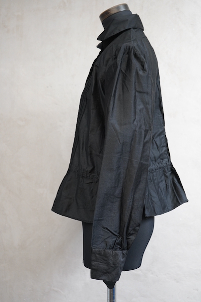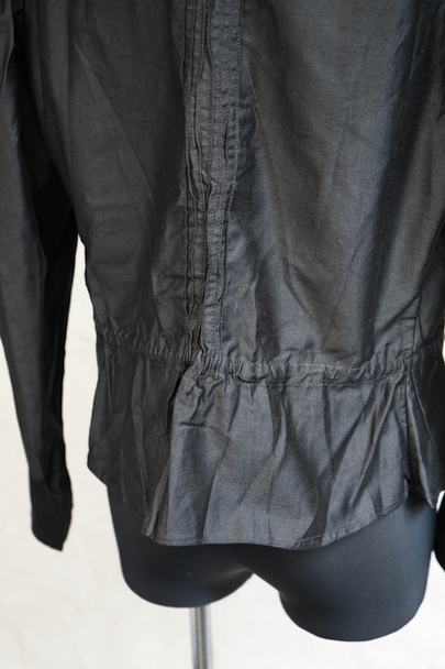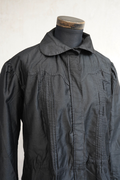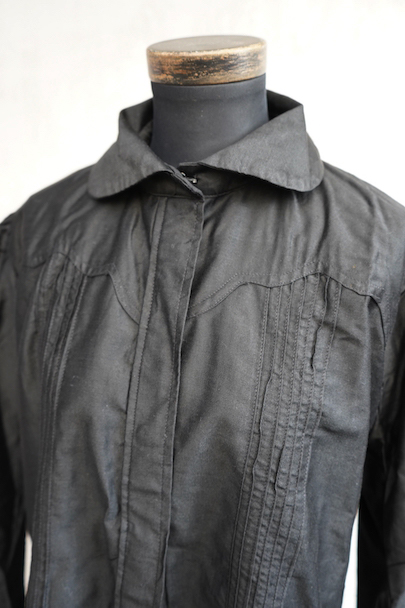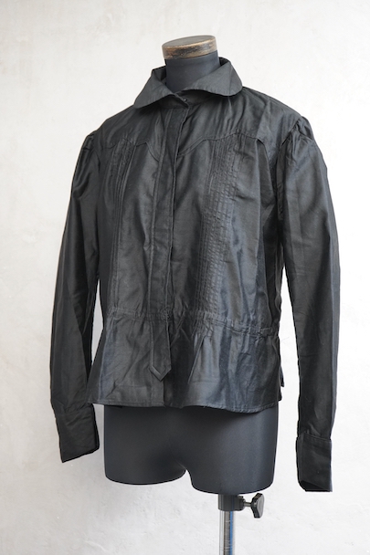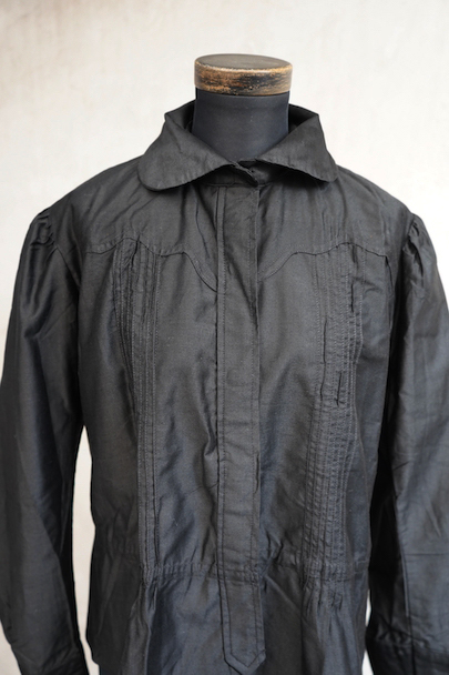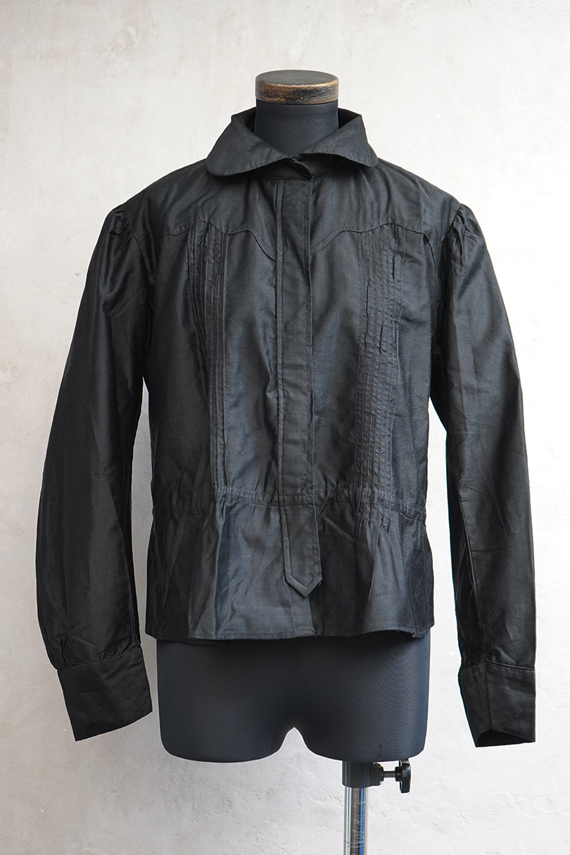 1930年代頃につくられたブラック・ブラウス。薄手で軽く光沢が美しいコットン素材の布地です。波型ヨークの下にピンタック、フロントは比翼仕立てで、ガラスボタンで留める仕様、ネックとウエスト部分にはホックがついています。糸のほつれ、小さな擦れ等はありますが、未使用品のようで状態は良いです。