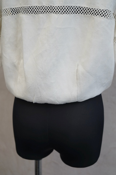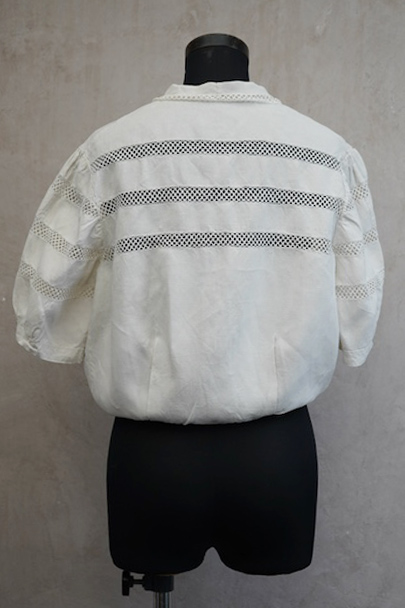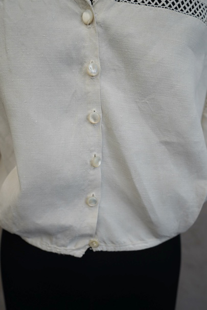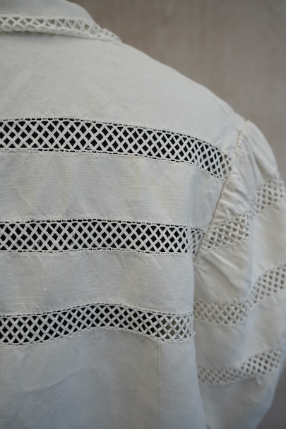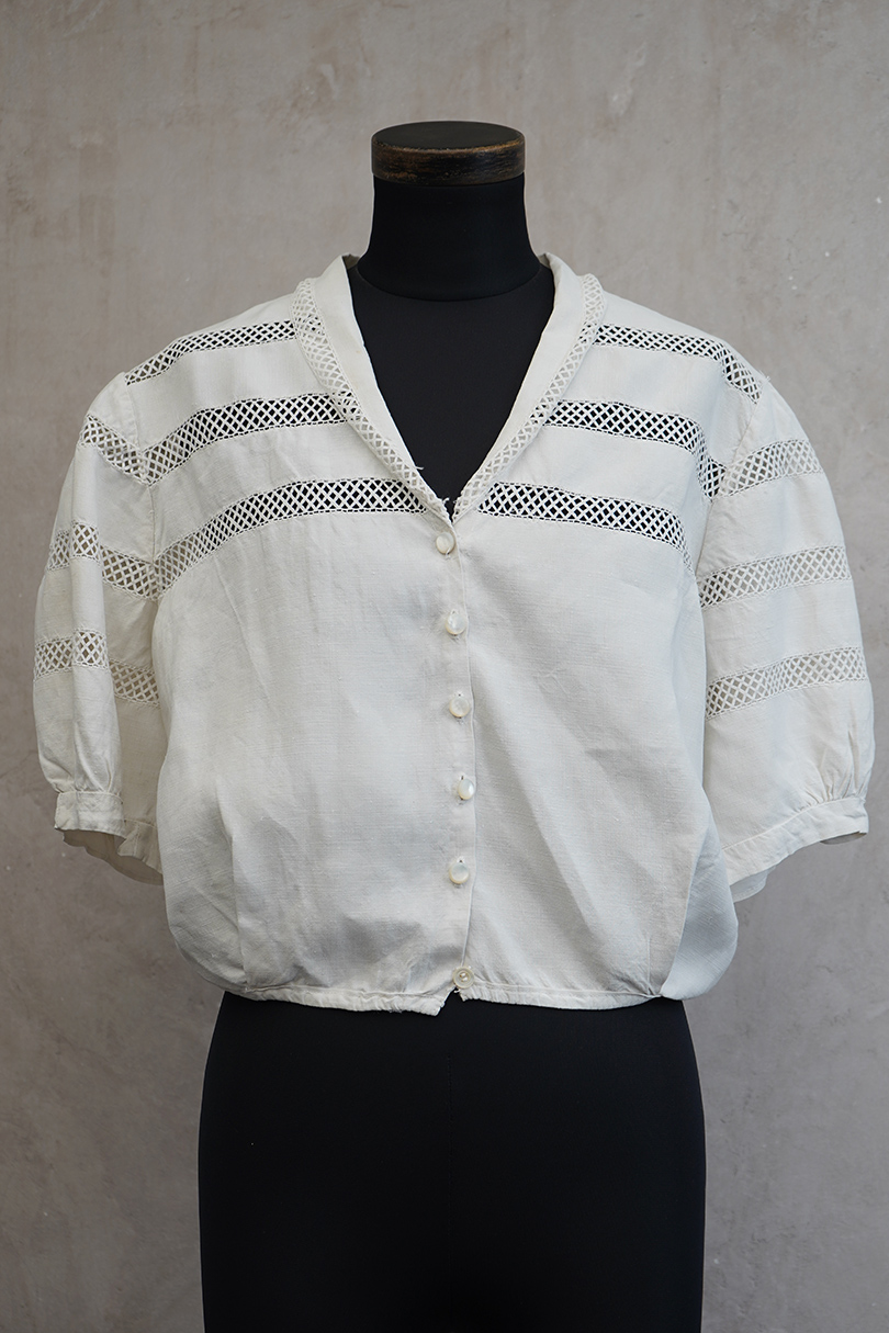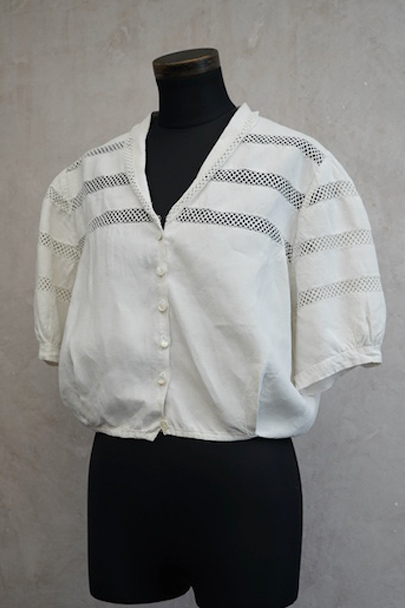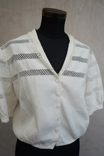 1930年代頃につくられた半袖ブラウス。目の詰まった良いリネン地が使用されています。小さなショールカラーにレース使い、厚みのあるシェルボタンなど良いディテールです。手縫いのボタンホールも素朴で良い印象です。糸のほつれなど若干の使用感がありますが、状態は良いと思います。