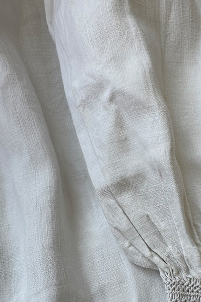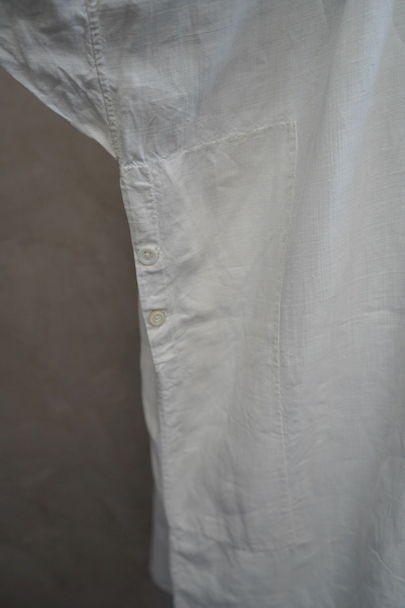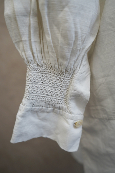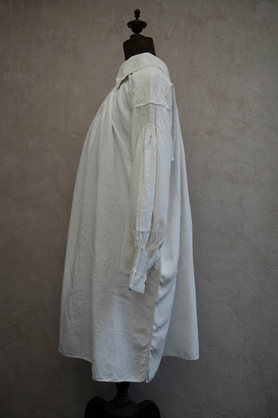 19世紀につくられたリネンのシェパーズ・スモック。比較的薄手で肌触りの良いリネン素材が使われ、身頃上部と肩とカフ部分にスモッキングが施されたシンプルで上品な品、前後全く同じ仕様、手縫いで丁寧につくられています。プルオーバー・タイプ、前後上部についた各3つのシェル製のボタンで開閉します。腰の両サイドにボタン留めのポケット付き。若干シミや小さい穴等はありますが、全体的な状態は良いです。元々は男性用ですが、女性にもお勧めです。採寸は平置きで広げずに計測しています。