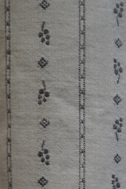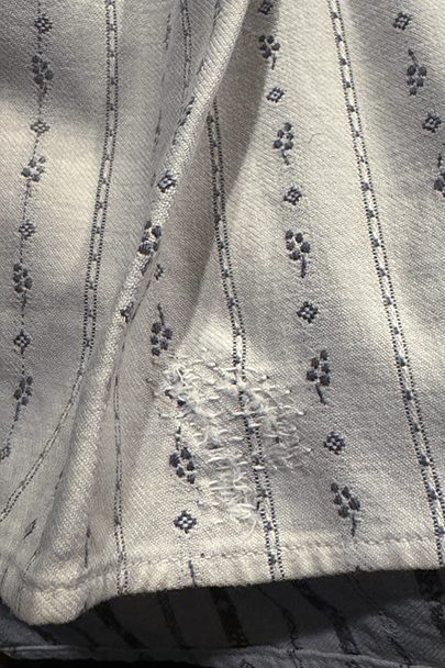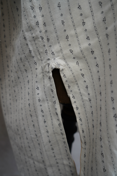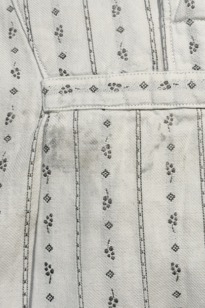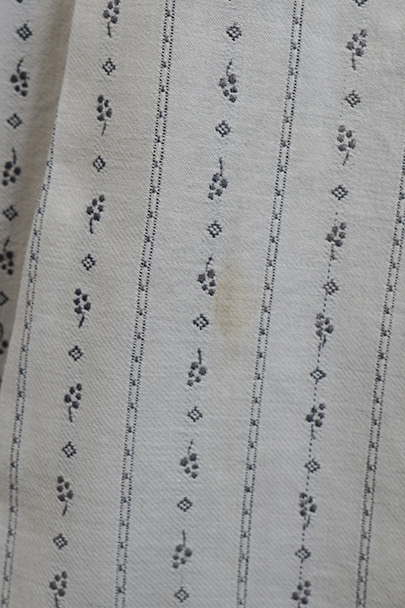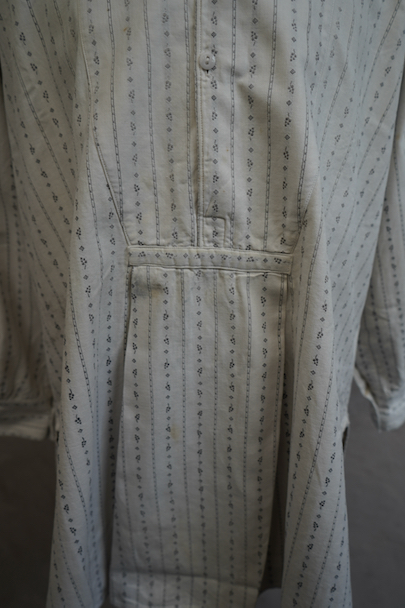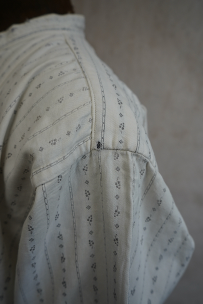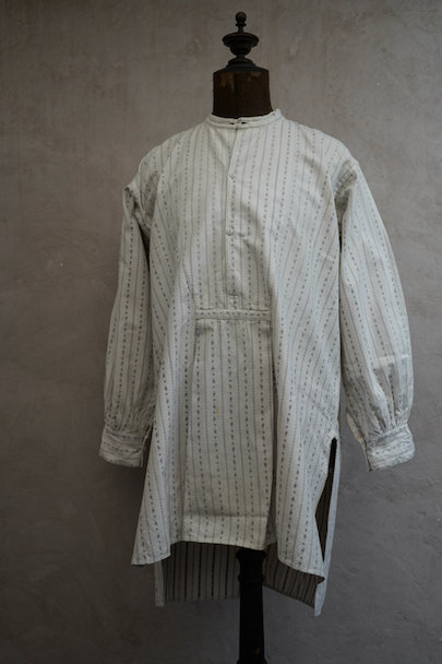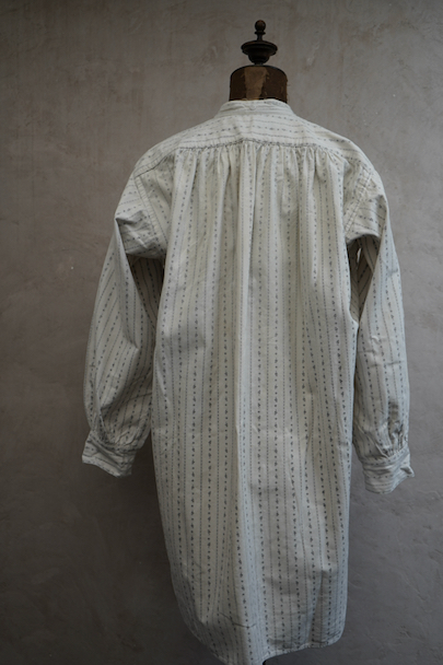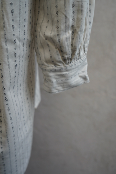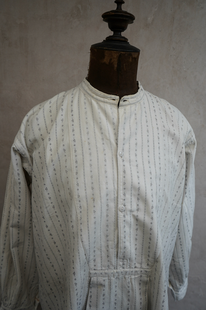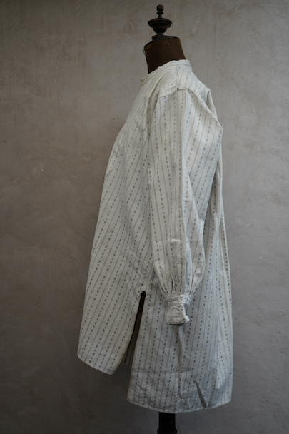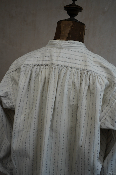 20世紀初期頃のシャツ。白いストライプに葡萄でしょうか、木の実の柄が入った味わいのあるコットン素材です。バックのヨーク下やカフ部分に細かいギャザー、フロントの胸当てとヨーク部分は二枚布になっています。ボタンはガラス製。ネック周りに手縫いの直し痕が多くあります。フロント裾に直し痕、肩からネック周りとカフ部分などに擦れたダメージと直し痕があります。その他、フロント下方などに薄いシミがあります。ダメージを気にされない方にお勧めします。