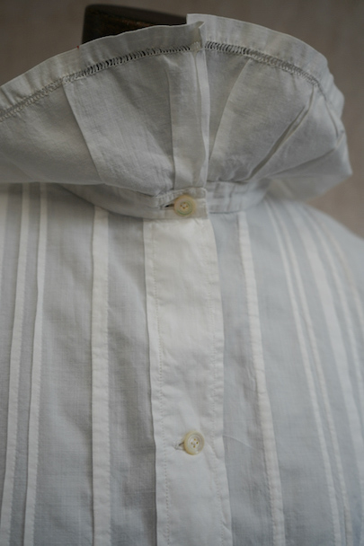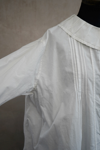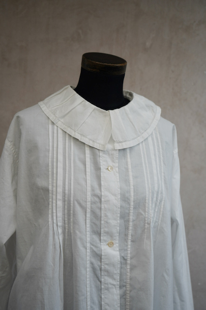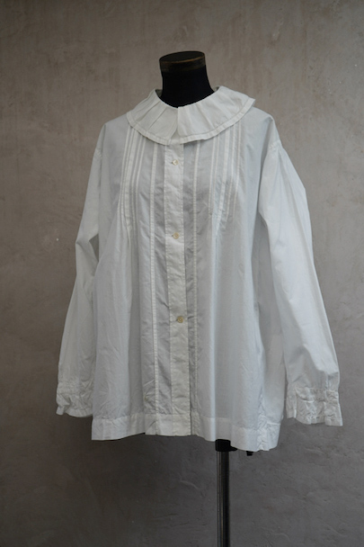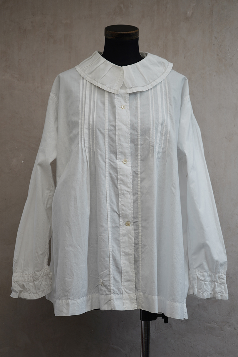 20世紀初期頃につくられたフリル襟のブラウス。薄手のコットン素材です。細かいミシンの縫い目や、手作業の細かく丁寧な縫い目が美しい良い品です。ボタンはシェル製。ボタンホールは手縫いです。フロント上部に手縫いのピンタック、裾部分のイニシャル刺繍も綺麗です。状態は良いです。