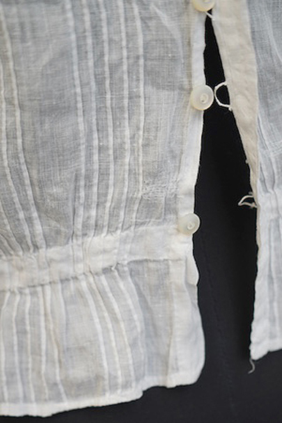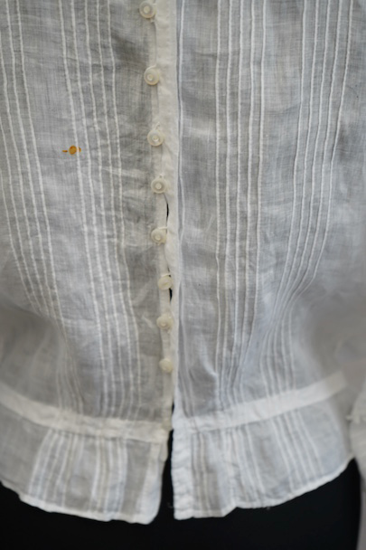 20世紀初期頃につくられたレースブラウス。ベースは薄手のリネン地で、ピンタックやレース使いが美しい、手の込んだ品です。リネンのテロンとした滑らかな質感、フロント部分に施されたボリュームのある植物刺繍も素晴らしいです。バックボタンで留める仕様で、ボタンはシェル製。ボタンホールはループでできています。バックやネック周りに錆染み、その他手縫いの直しや小さな穴など経年の傷みが多数見られます。ダメージを気にされない方にお勧めします。