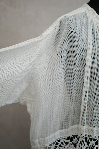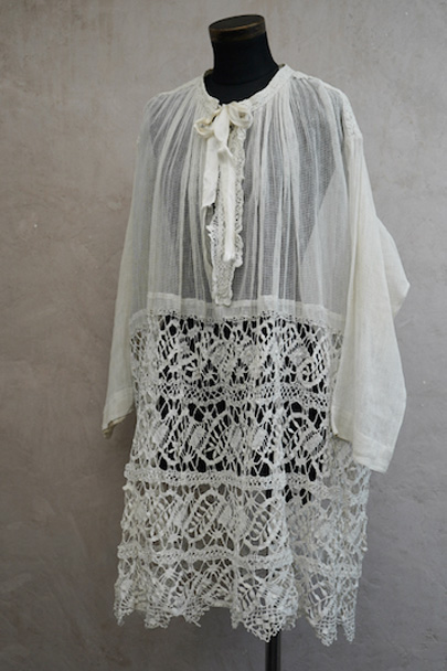 20世紀初期頃につくられた教会用のレース・チュニック。上部のネットレースはコットン、下はリネン糸のレースです。上部も前立てやヨーク、ネックまわりはリネン糸のレースが飾られています。フロントトップのリボンは後の時代に付け替えられています。若干の染みや黄ばみ、糸のほつれ、小さな穴など経年の傷みがありますが良い品です。
