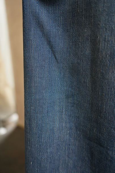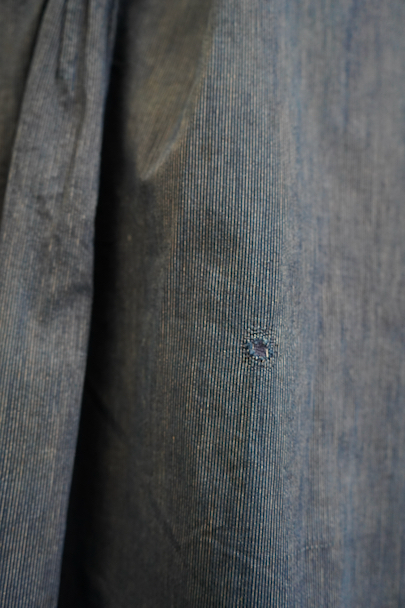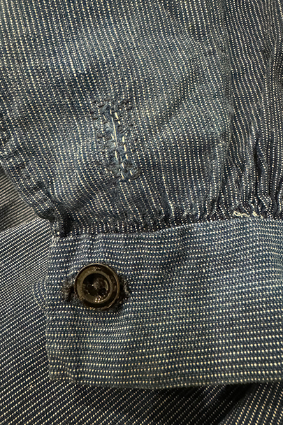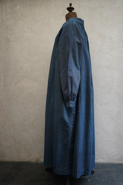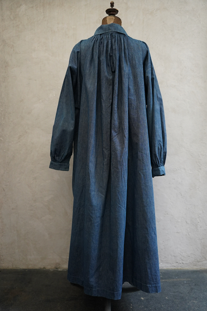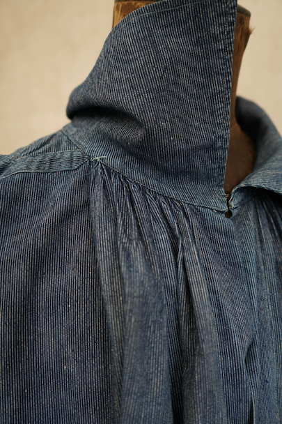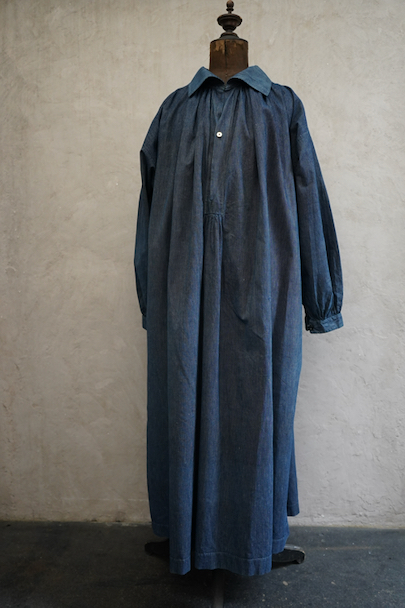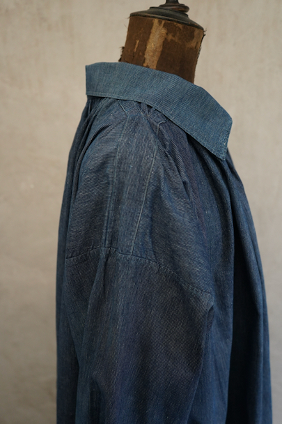 20世紀初期頃につくられたストライプ織り柄のインディゴ・コットン素材のスモックです。プルオーバー・タイプ、ネック周りとカフ部分に細かいギャザーが入ったボリュームのあるシルエット、着丈はかなり長めです。プルオーバーのロング丈スモックは独特の雰囲気があります。フロントのトップはホック留め、その下はボタン留め、ボタンは黒蝶貝、ボタンホールは手縫いです。肩にY字のヨーク。ウエスト左右にスモック内部にアクセスするためのスラッシュがあります。全体的に直し痕があります。擦れ、小さい穴、シミが多少あります。