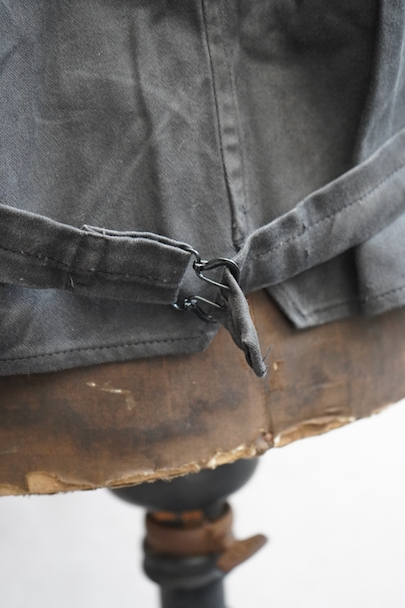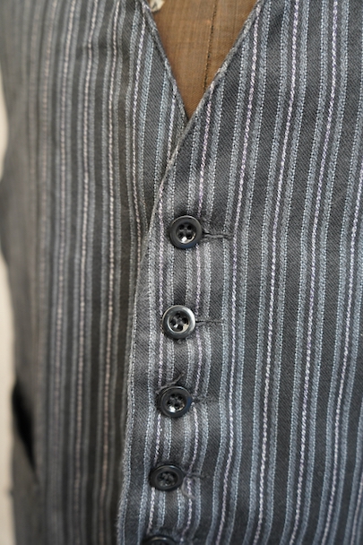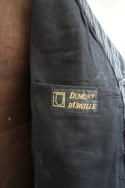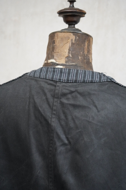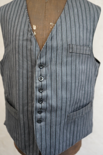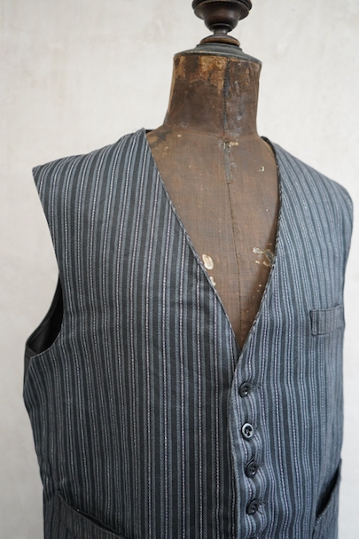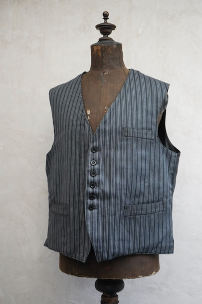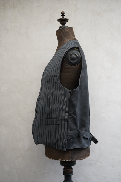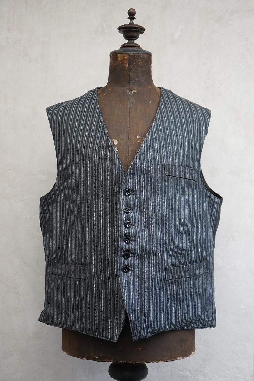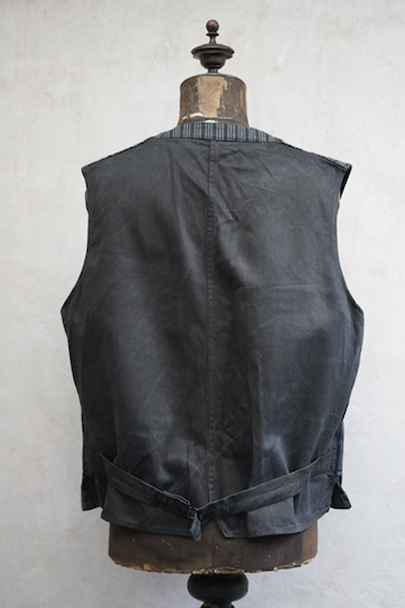 1950年代から1960年代頃につくられたコットン素材のワーク・ジレ。"Dumont d'Urville"のもの、デッドストックを一度洗濯しています。前身頃はダークグレーに水色系のストライプ織り柄のコットン素材、後身頃はブラック・ライト・モールスキン、裏地はコットン素材です。フロントに3つのポケット、内ポケットが1つ。バックシンチで身幅の調節ができます。多少のアタリは見られますが、保管中の傷みはなく状態は良いです。希少な大きめのサイズです。