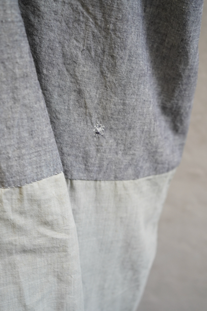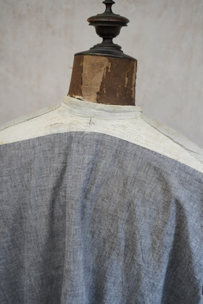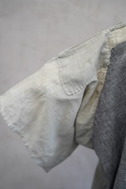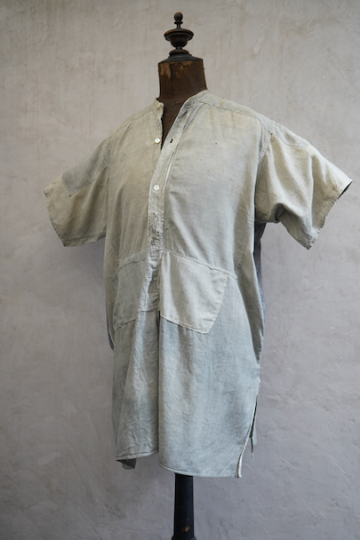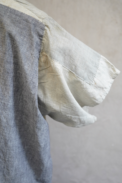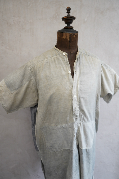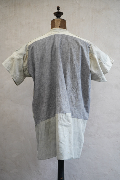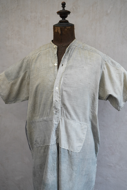 1940年代頃までにつくられた半袖シャツ。コットン素材です。パッチワークや手縫いの直しなど、使い込まれてきた風合いが素晴らしい品です。穴や擦れ、シミ、薄くなっている所など、かなり使用感があります。