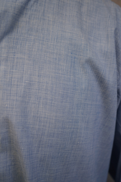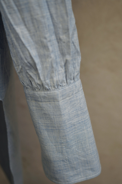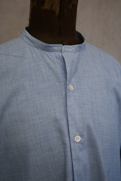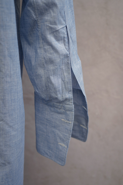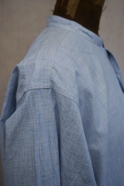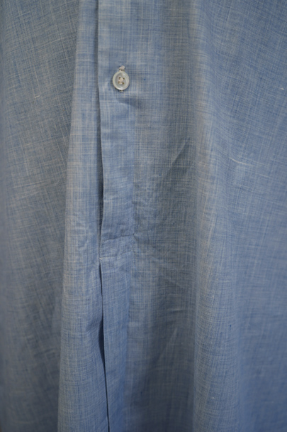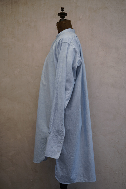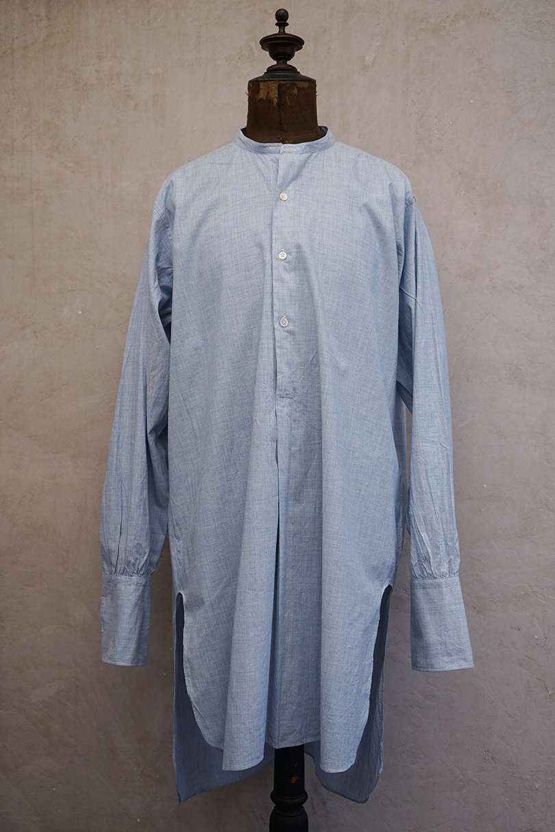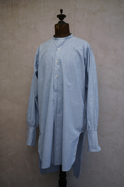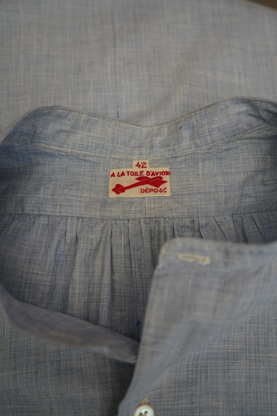 1930年代頃につくられたプルオーバー・シャツ。未使用品を一度洗濯しています。インディゴのコットン・シャンブレー、涼しい色、軽い素材感の良い布地です。ボタンはシェル製、トップはスタッズで留める仕様、袖口はダブルカフで、伸ばした状態では袖丈69cmになります。赤い飛行機のタグが可愛らしいです。表記サイズは42です。