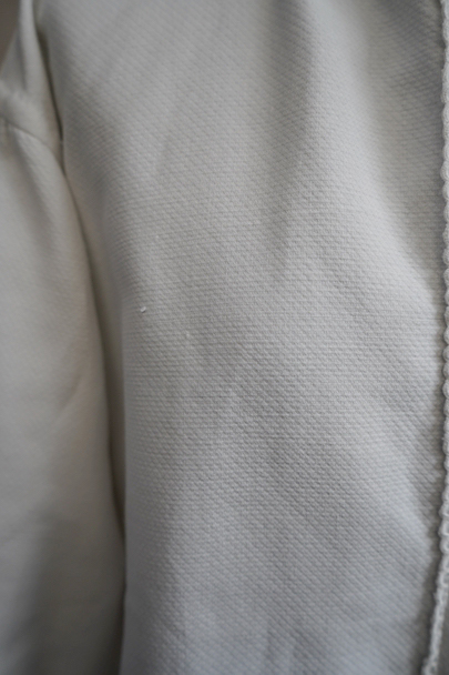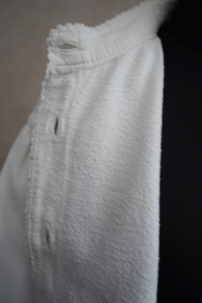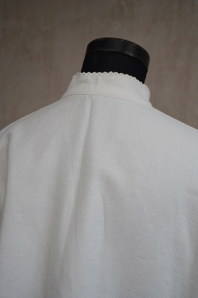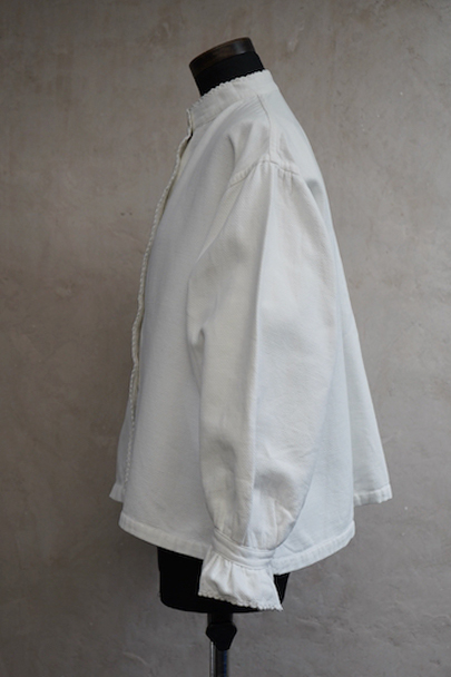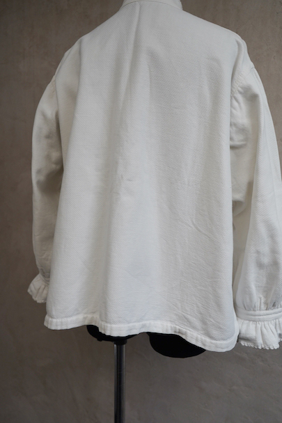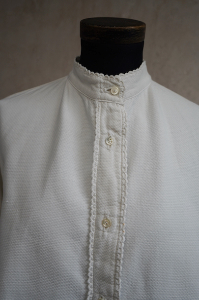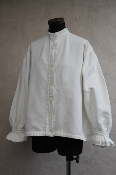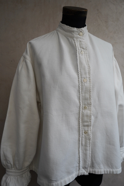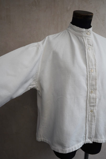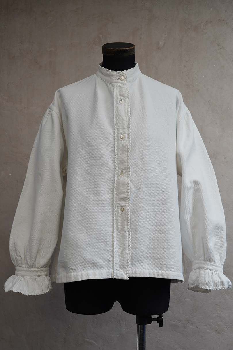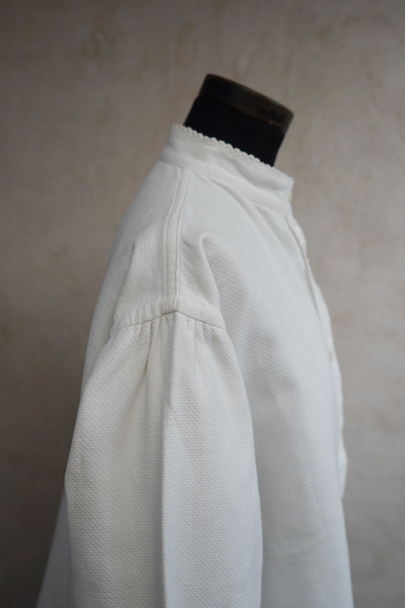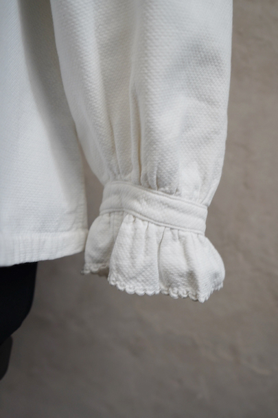 20世紀初期頃につくられたブラウス。裏起毛で厚みのあるコットン素材で、細かく浮きだした柄が良い風合いです。肩の落ちるつくりです。ネックや袖口に手縫いのスカラップ刺繍、手縫いのボタンホール、ボタンはシェル製です。シミがありますが、状態は良いと思います。