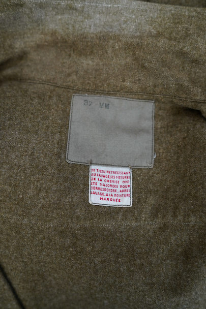 1940年代のフランス軍のカーキ・ウール・シャツ。60年代頃のものと比べて良い素材感です。両胸にボタン留めフラップのついたプリーツ・ポケット、肩にはエポーレット。ボタンはガラス製です。肩から襟にかけて擦れて起毛がなくなった部分があり、裾に小さい穴があります。