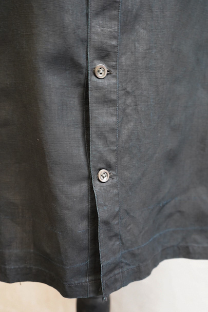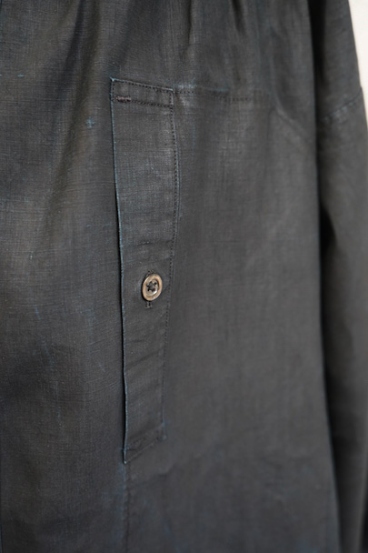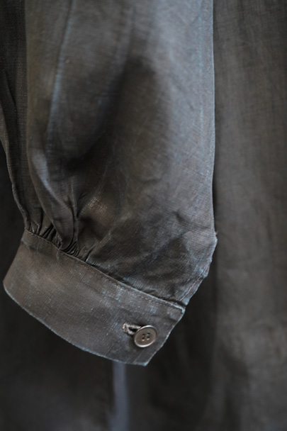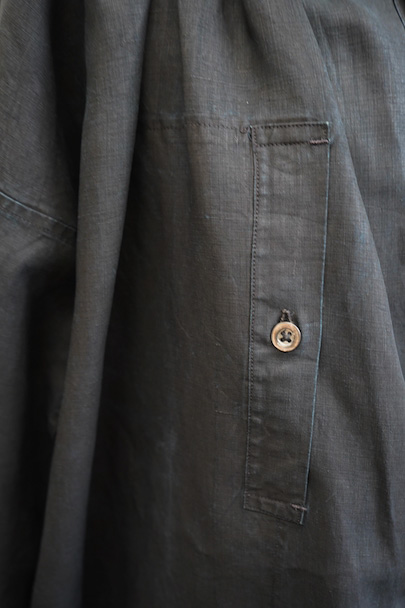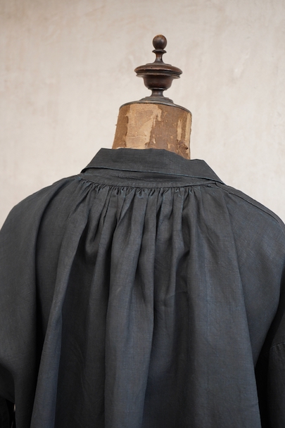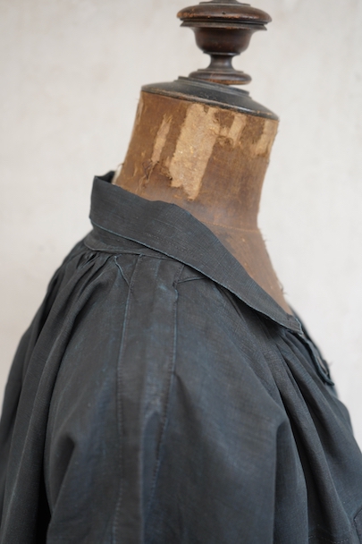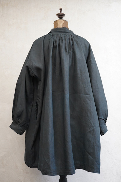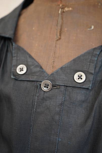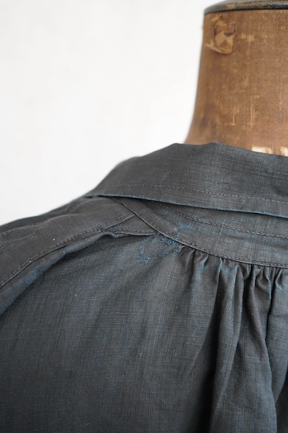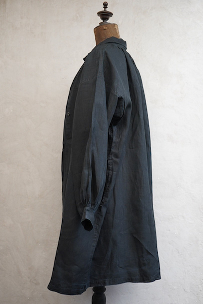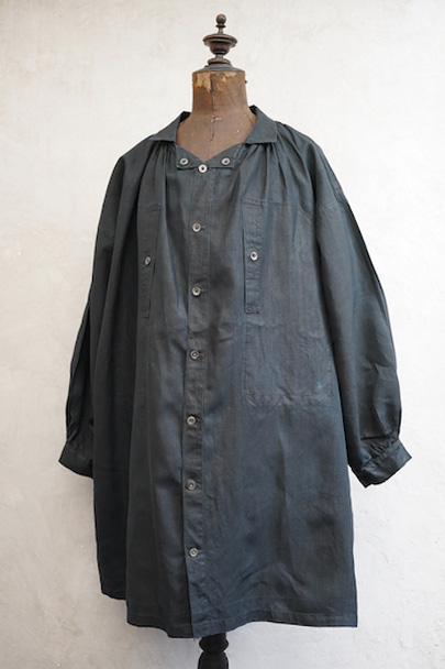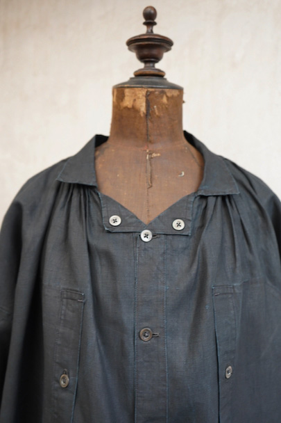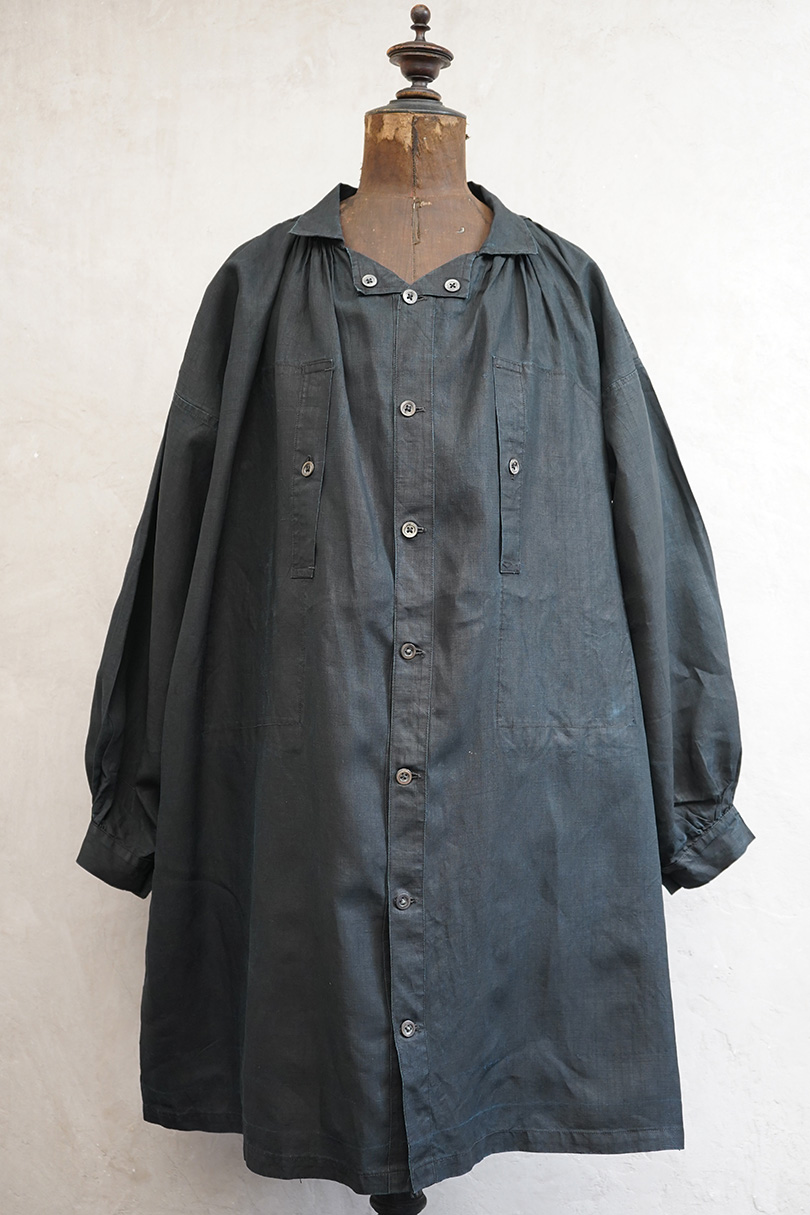20世紀初期頃までにつくられたインディゴ・リネンスモックマキニョンという家畜の仲買人などが仕事着として着たものです。こちらはフロントが全開するタイプで、コートのように羽織って着ることができます。ボタン留めラペルの広めのネックライン、両胸についたボタン留めの大きなポケット、ネックと袖口に入ったギャザー、サイドには中に手を入れるためのあけがあります。深くインディゴ染めされたリネン地は薄手で目が詰まった、ハリと柔らかさを兼ね備えた良い風合いです。ボタンは貝製ですが、袖口のひとつがプラスチックに替えられています。小さな穴やスレなどはありますが、全体的に状態は良いです。採寸は平置きで身幅は広げずに計っています。