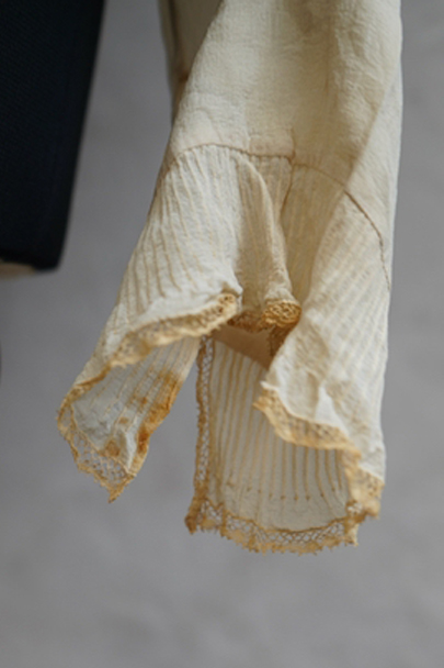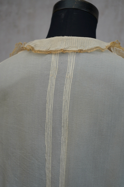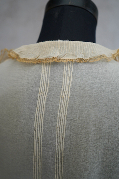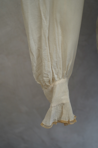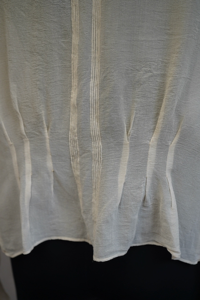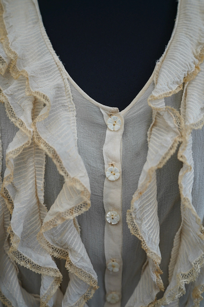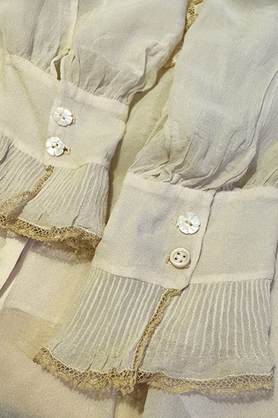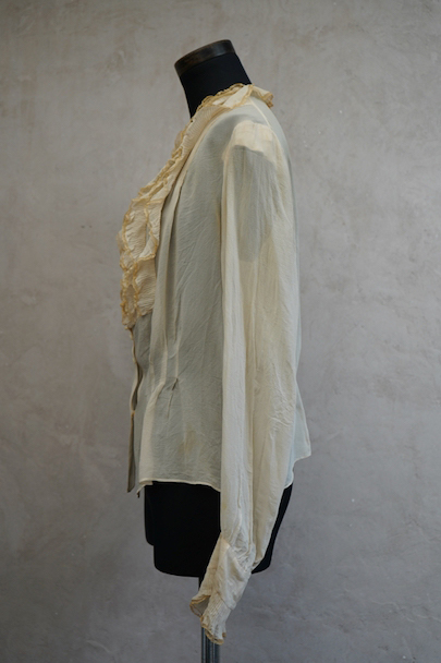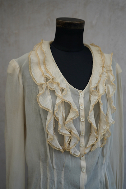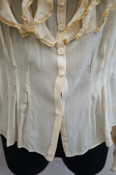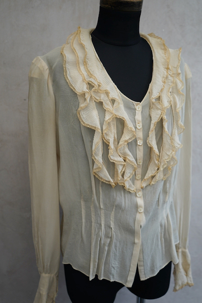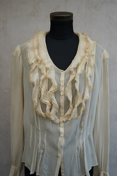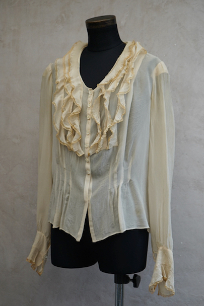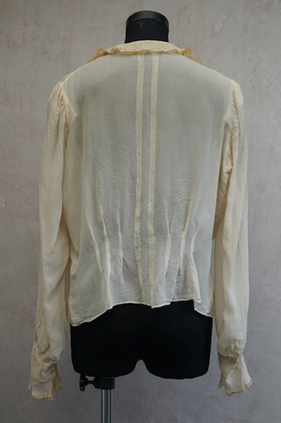 1930年代頃につくられたシルクシフォン・ブラウス。透け感のある滑らかな質感のシルク地で、フリルや身頃には細かい手縫いのタックが入るなど、とても手の込んだつくりです。多少の染みや小さな穴、シェル・ボタンが付け替わっている所がある等、経年の傷みがありますが、つくりの美しさに圧倒される素晴らしい品です。ダメージを気にされない方にお勧めです。