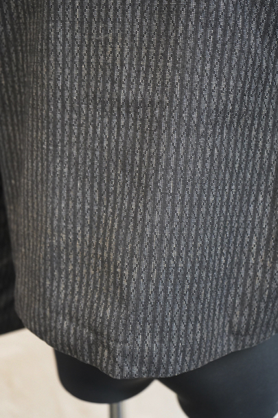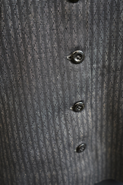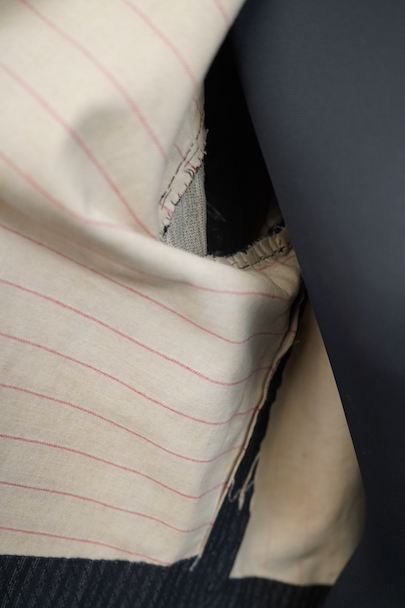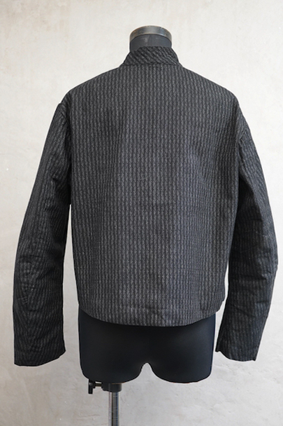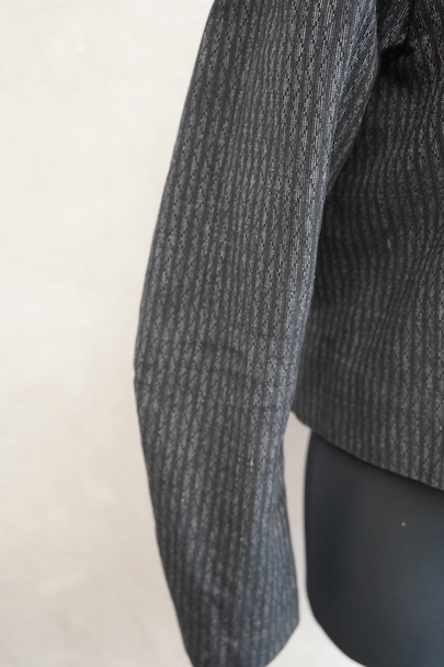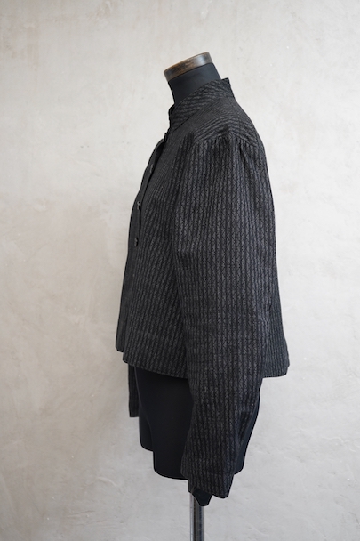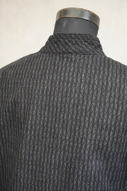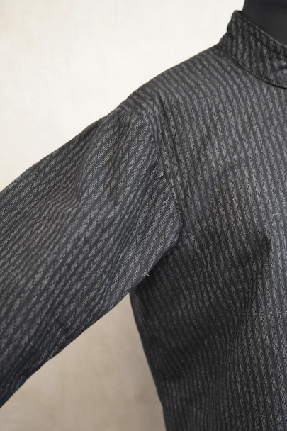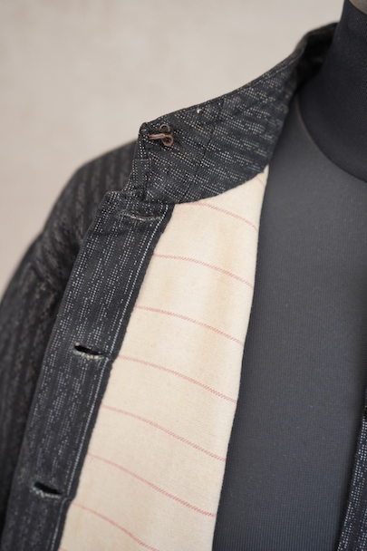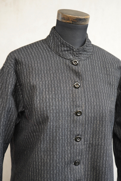 20世紀初期頃につくられたコットン・ブラウス/ジャケット。大部分が手縫いでつくられた素朴な雰囲気のある品です。表地はストライプの織り柄の入った綺麗な布地が使用されていますが、裏地には使い古しの様々な布地がパッチワークのように縫い付けられています。裏地に色褪せや染みなど経年の傷みがありますが、表地は綺麗です。ボタンはガラス製です。バックの裾が跳ねるようなシルエットが綺麗です。