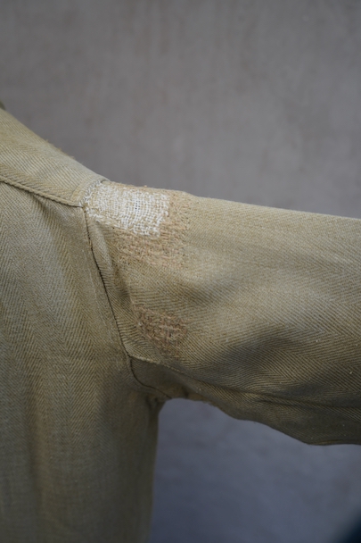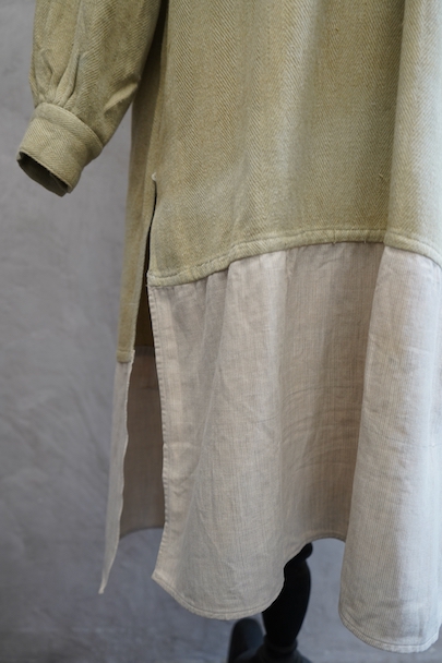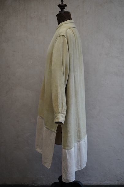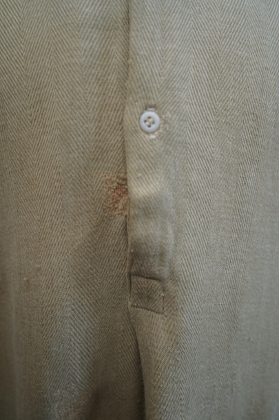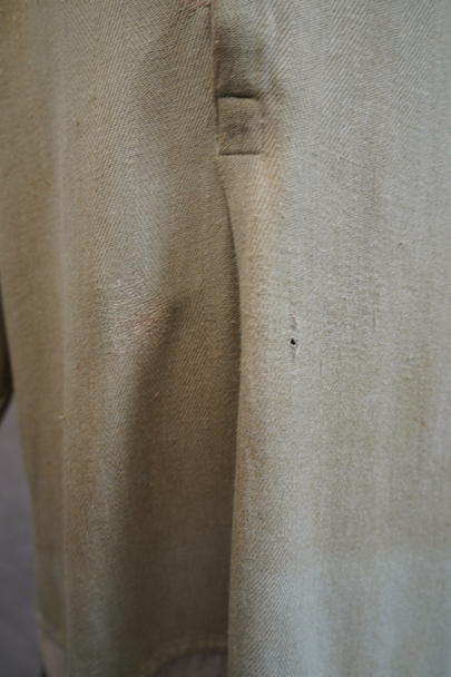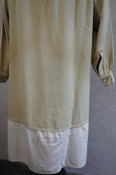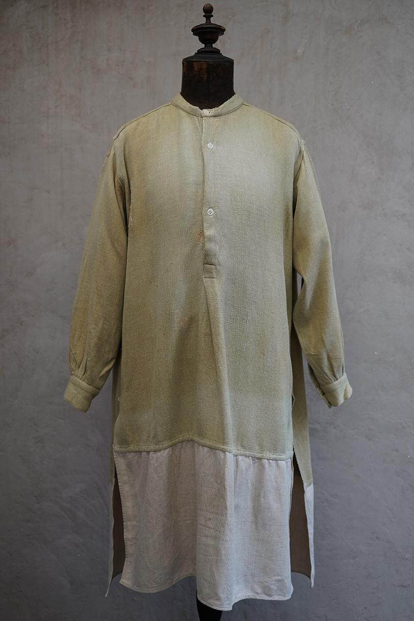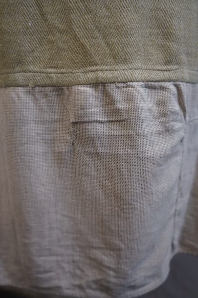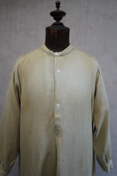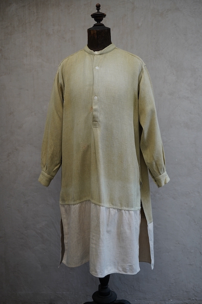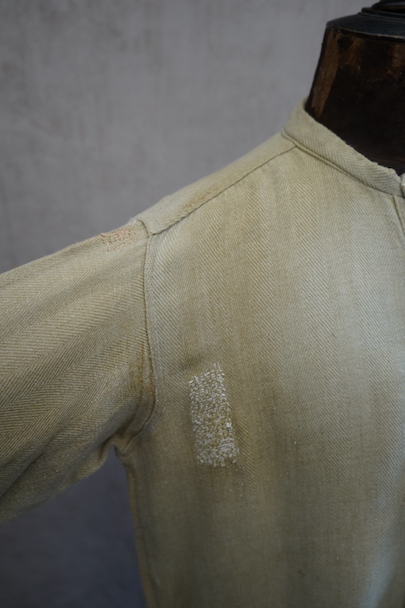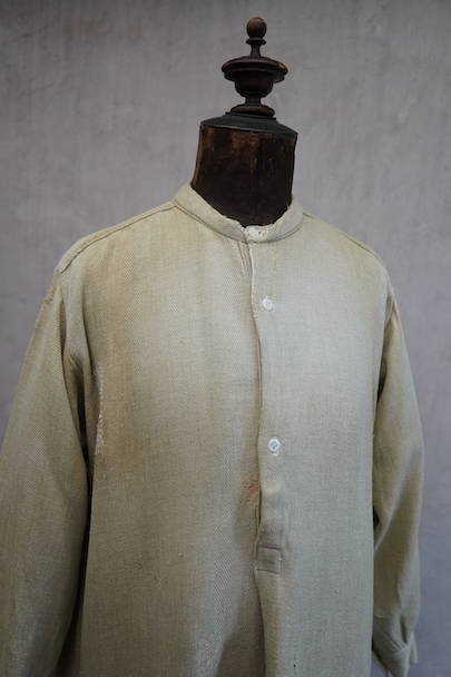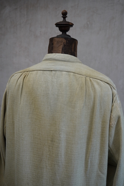 1930年代頃までにつくられたシャツ。ベージュのヘリンボーン織りのリネン・コットン地だと思いますが、やや厚手の柔らかさのある布です。裾部分にコットンの別布が接いであります。プルオーバー・タイプ。ボタンはガラス製、ボタンホールは手縫いです。全体的に色褪せやシミがあり、色むらがあります。右肩に手縫いの直し痕が多数、見頃にも直し痕があります。バックの裾に足された布部分に大きくL字の裂けなどの直し痕があります。その他、穴や擦れ、ほつれなどの経年の傷みがありますが、良い風合いです。