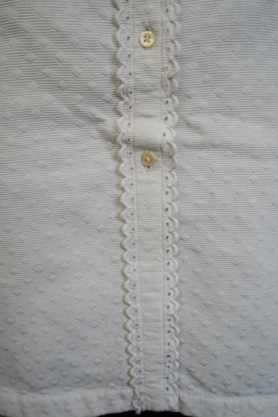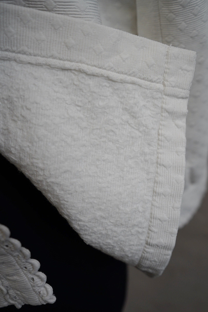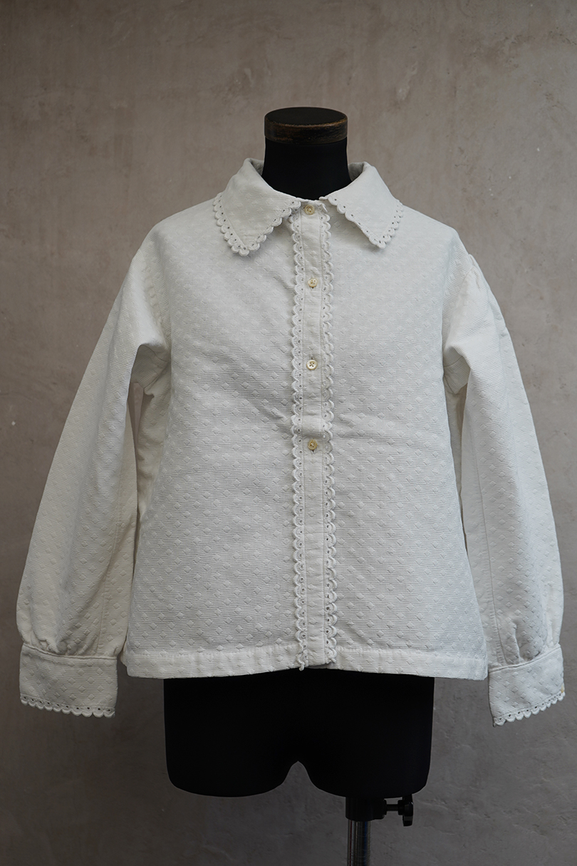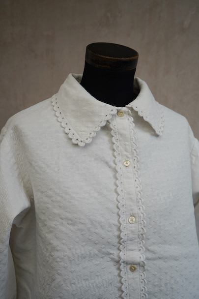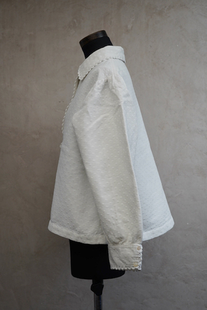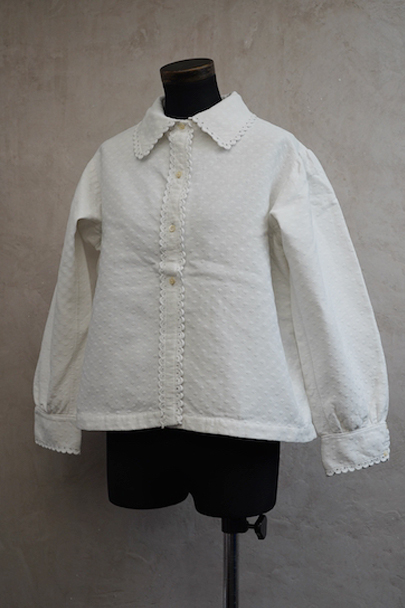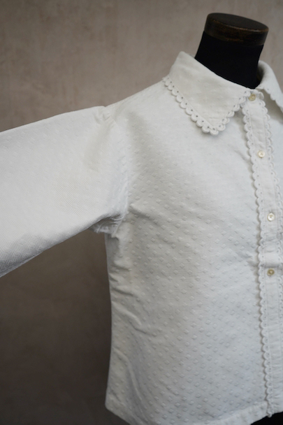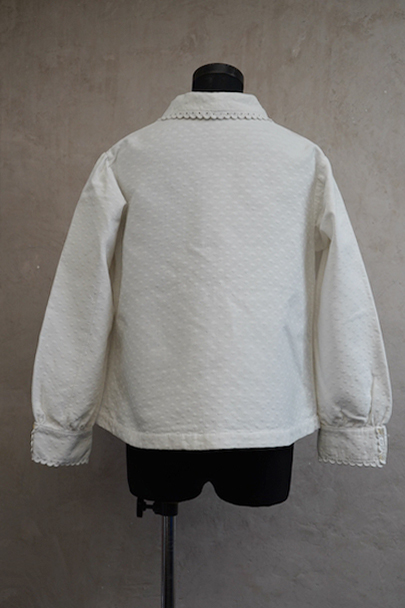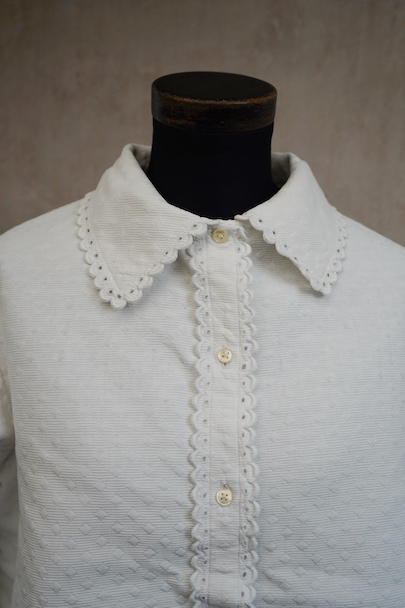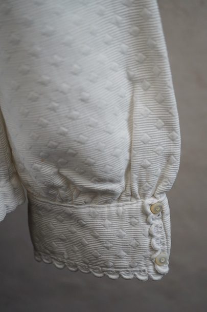 20世紀初期頃につくられたブラウス。厚みのあるダイヤ柄の良いコットン・ピケ素材が使われ、襟や前立てはボリュームのある手縫いのスカラップ刺繍で飾られた美しい品です。ボタンはシェル製、ボタンホールは手縫い。右袖口近くに点のようなシミが数箇所ありますが、その他は状態は良いです。 裏起毛しています。