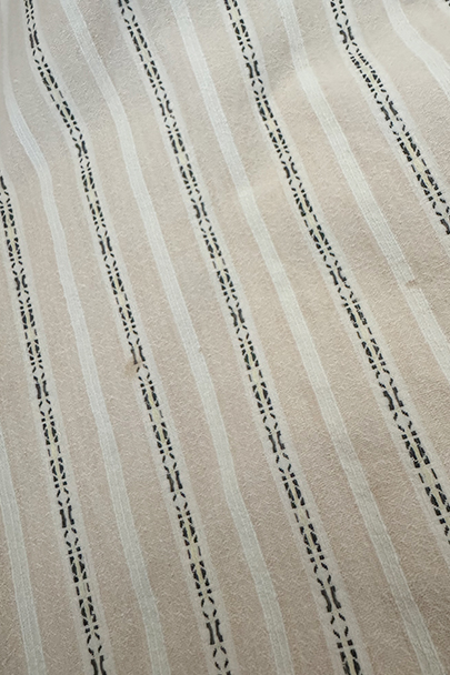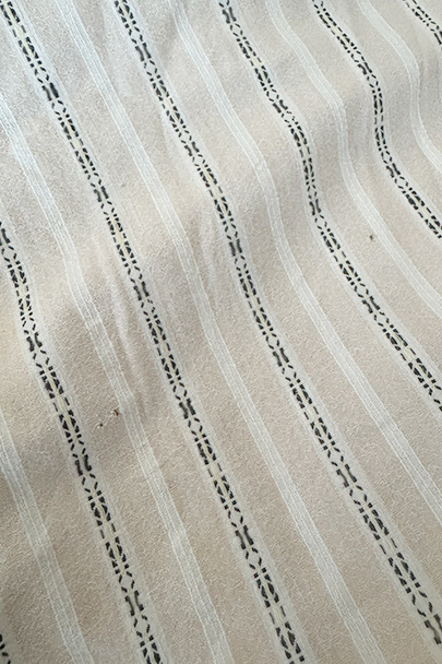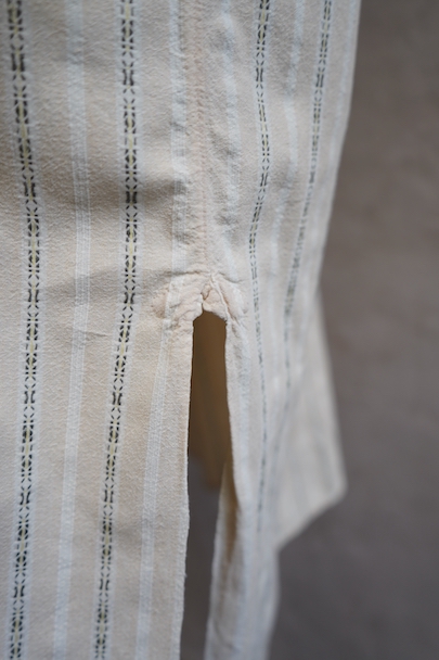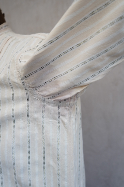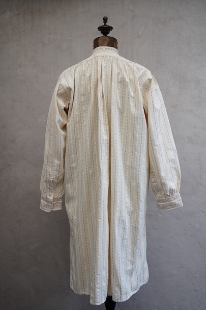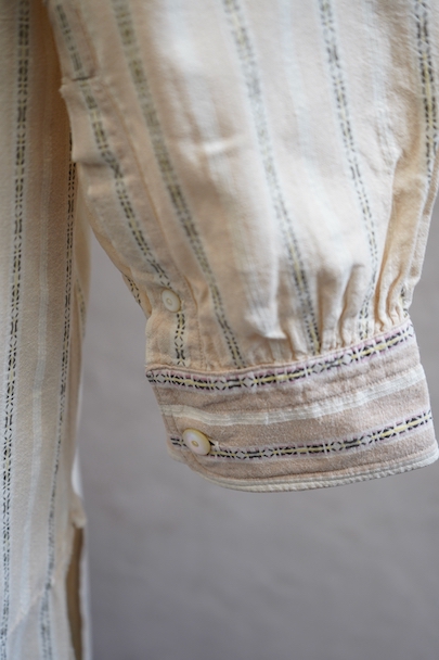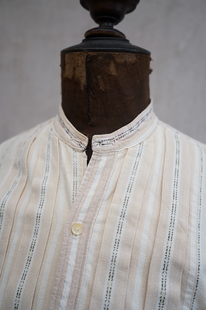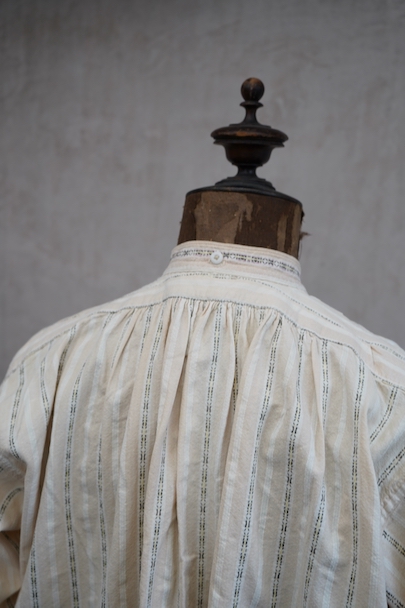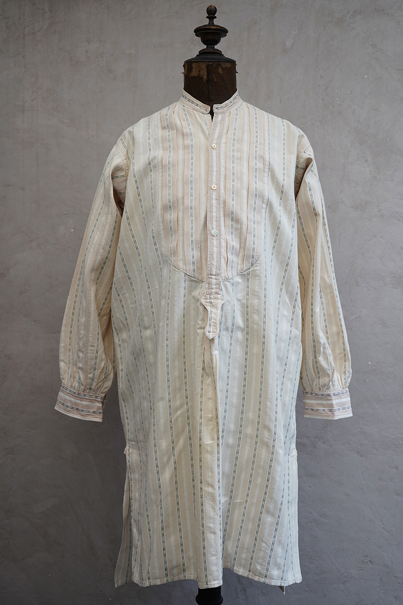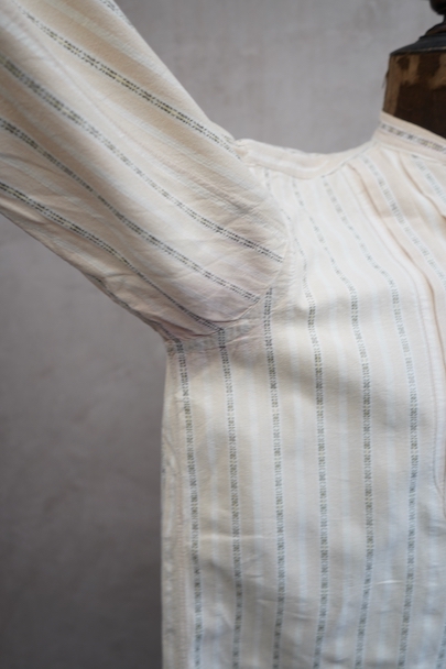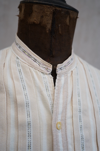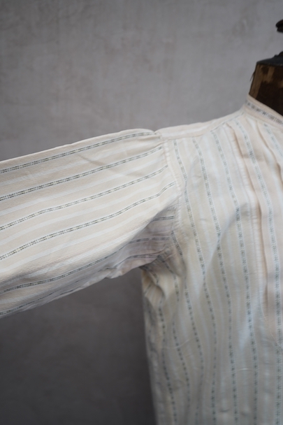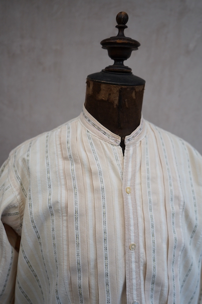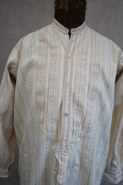 1930年代頃までにつくられたシャツ。ベージュ系の凝ったストライプ織り柄の入ったコットン素材布地です。フロントのトップはスタッズで襟と留める仕様、その下は3つボタン留めのプルオーバー・タイプです。胸当て部分にプリーツが入り、その部分とヨークは2枚仕立てです。バックのヨーク下とカフ部分に細かいギャザーが入っています。ボタンはシェル製、ボタンホールは手縫い。脇に黒ずみが見られます。その他の小さい穴や小さいシミがあります。
