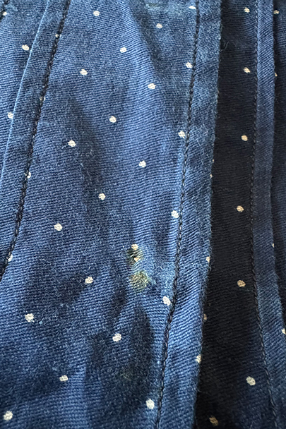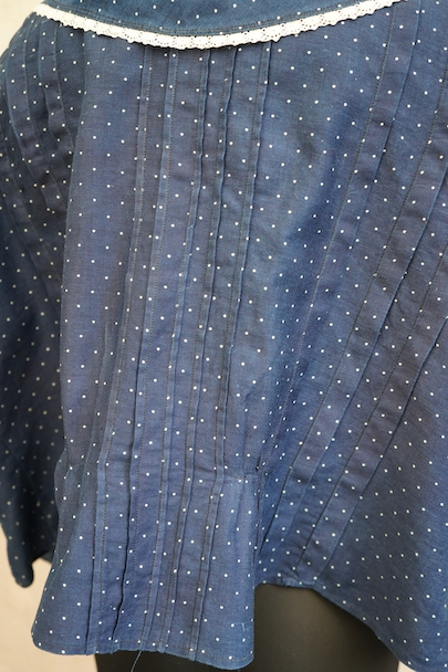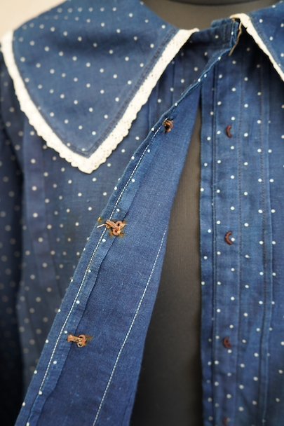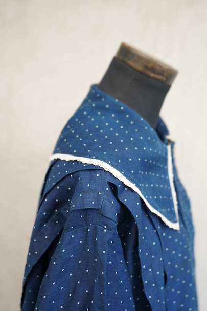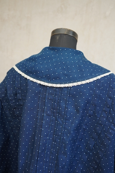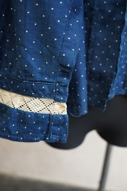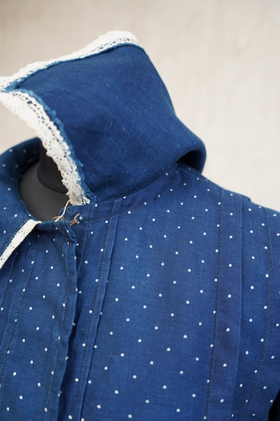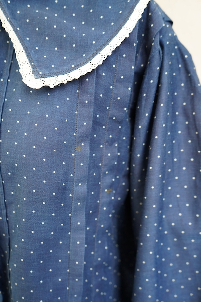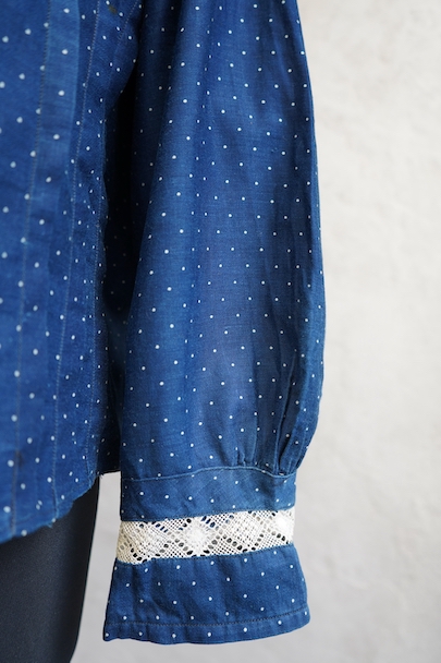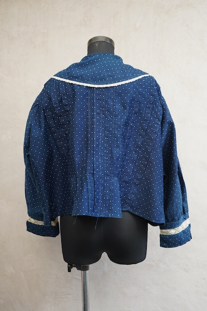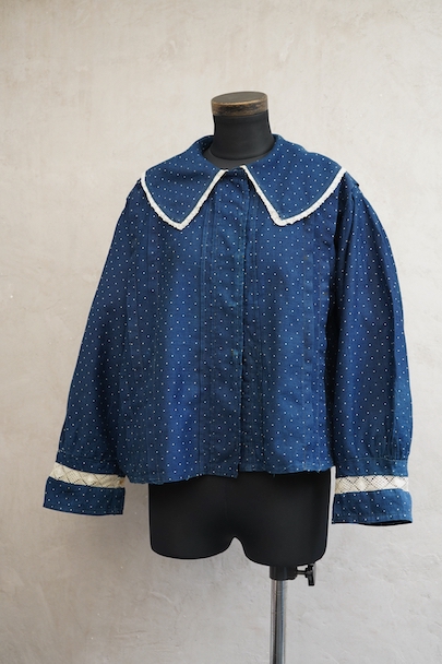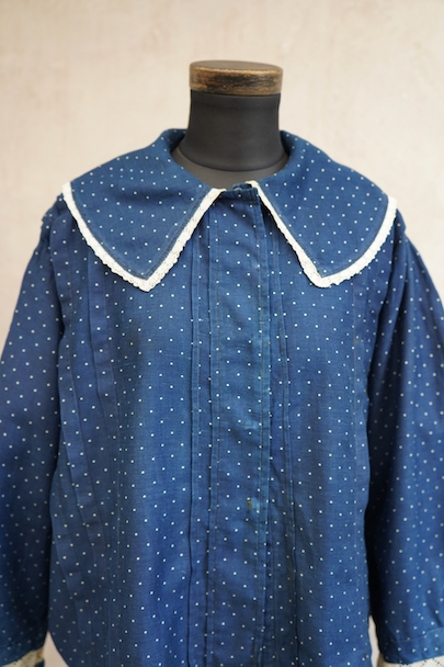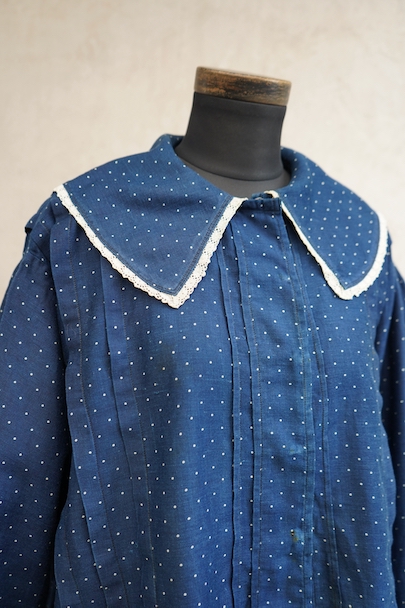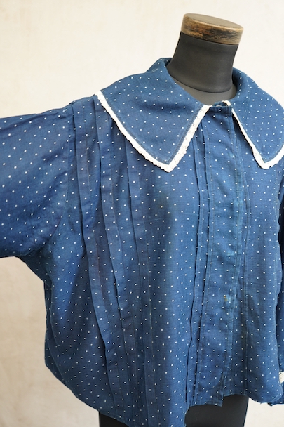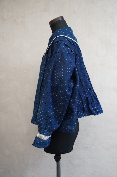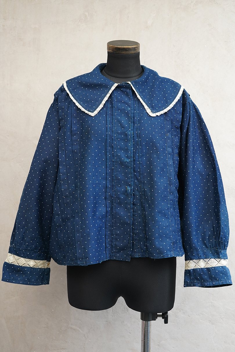 1920年代から1930年代頃につくられたブラウス。ドット柄プリントのインディゴ・コットン素材、とても美しい布地です。目を惹く大きな襟は白いレースで縁取りされ、フロントとバック共にプリーツが施されています。カフ部分にもレースがあしらわれています。広い身幅で短丈です。フロントはホック留めです。前立てのホックにサビ、その周辺や右袖口レース部分などにサビ染みが少々見られます。全体的に使用感は少なく、状態は良いです。