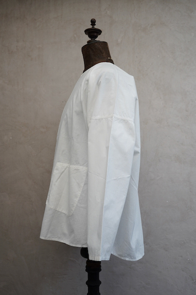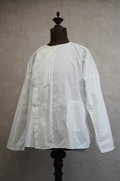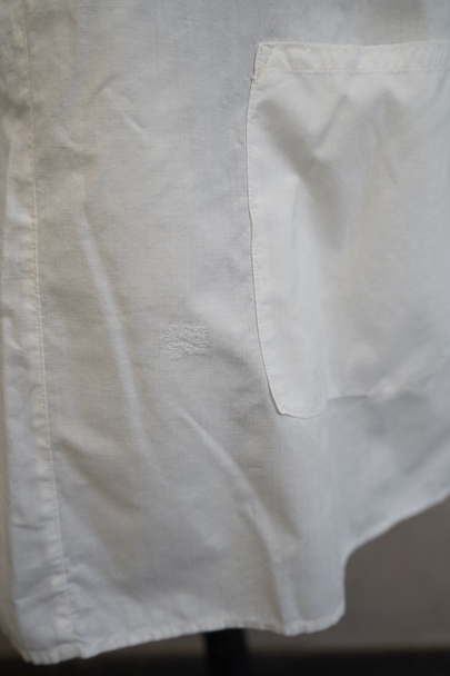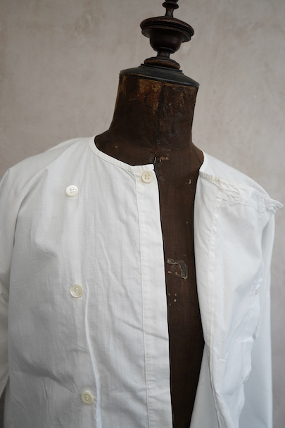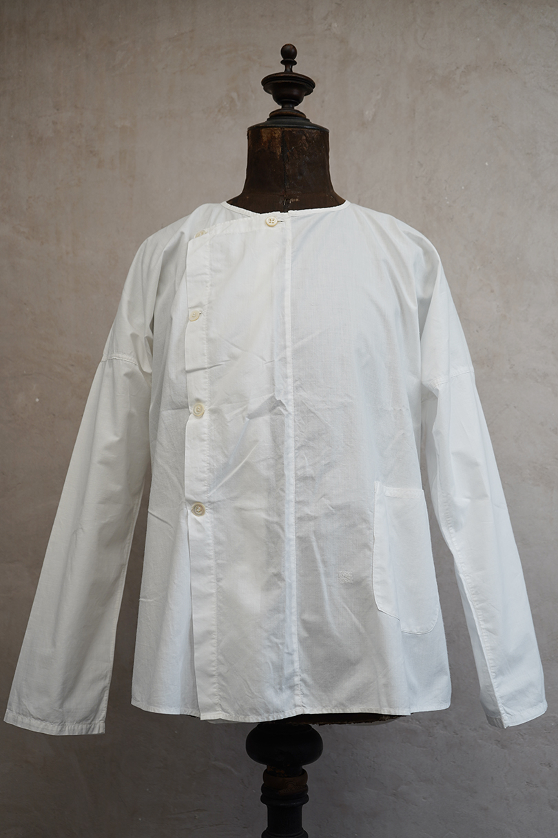 フロント右側でボタン留めになったシャツ、1930年代頃につくられたものだと思います。短い着丈、広い肩幅で肩が落ちる形、平面的ですが曲線が使われたつくりで面白い形状です。フロント左下にパッチ・ポケットがついています。ボタンはシェル製、ボタンホールは手縫いです。ポケット横に2cm弱の手縫いの直し痕があります。その他の状態は良いです。
