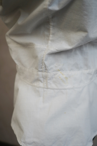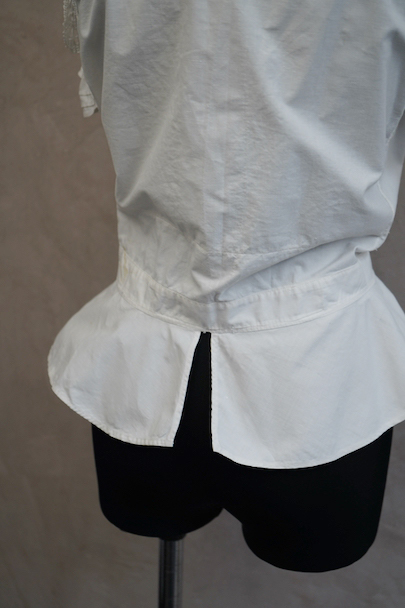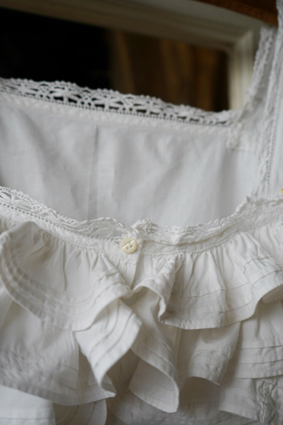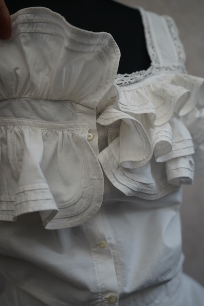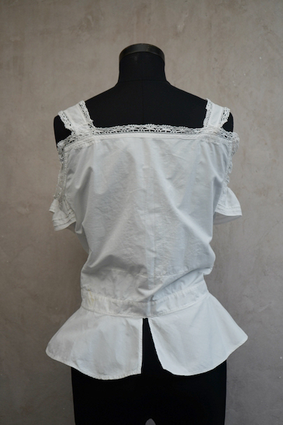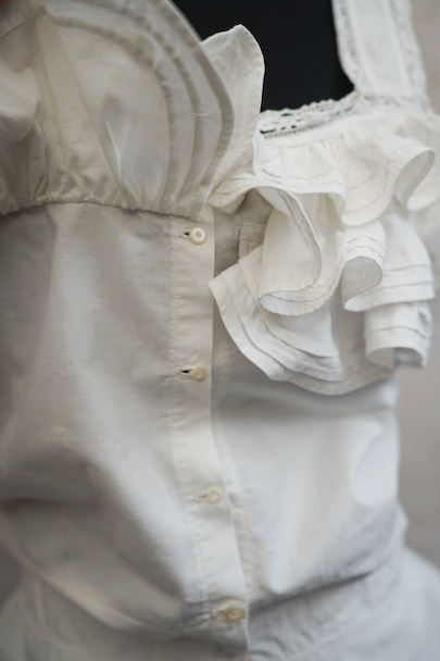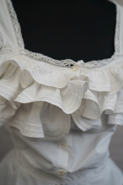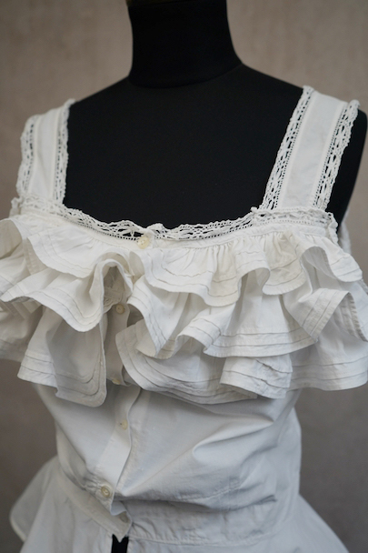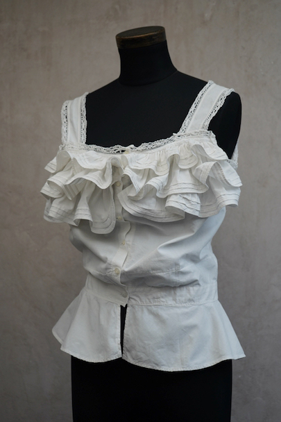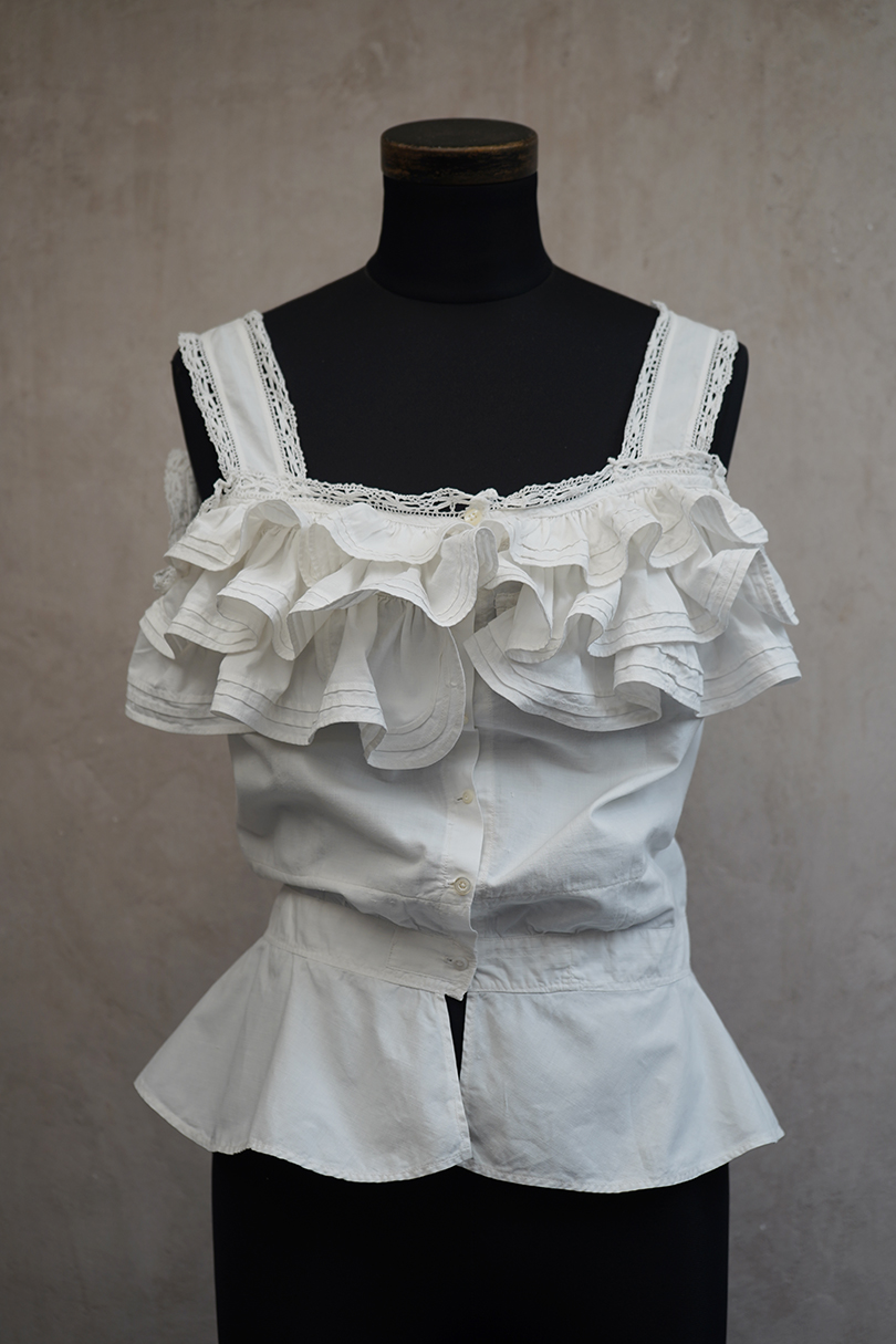 20世紀初期頃につくられたコットンのスリーブレス・トップ。胸に3段のフリルがあしらわれた珍しいデザインです。上部やショルダー・ストラップにはレースがあしらわれています。フロントにとても小さな貝ボタン(一部ガラスボタン)、ボタンホールは手縫いです。下方右側に接着剤のほうなものが乾いた薄いシミがあります。