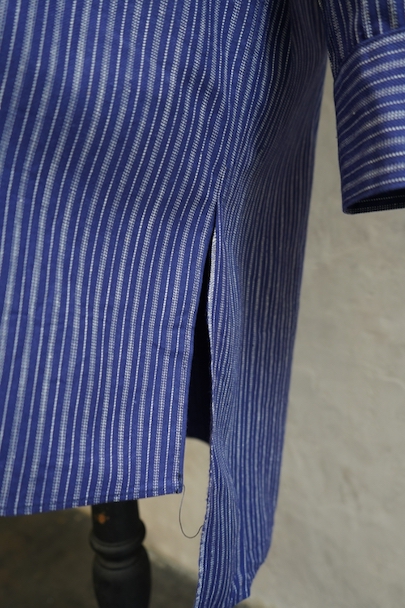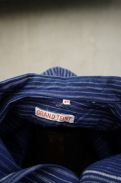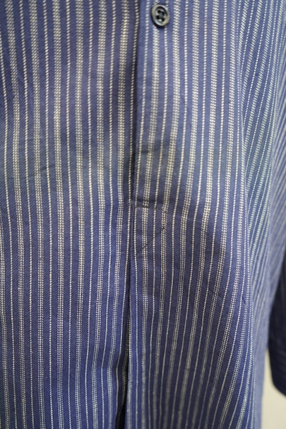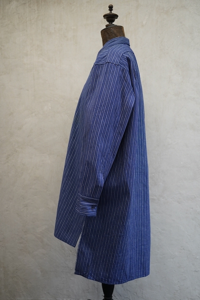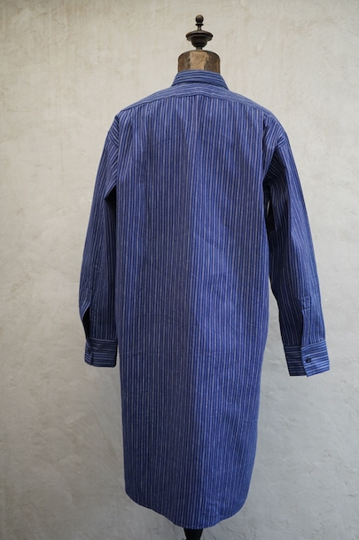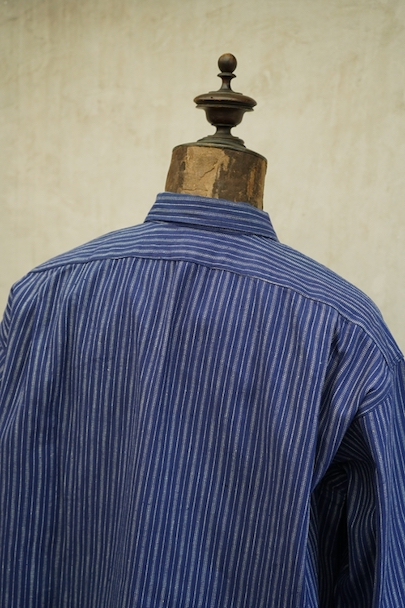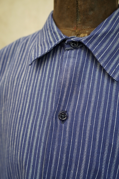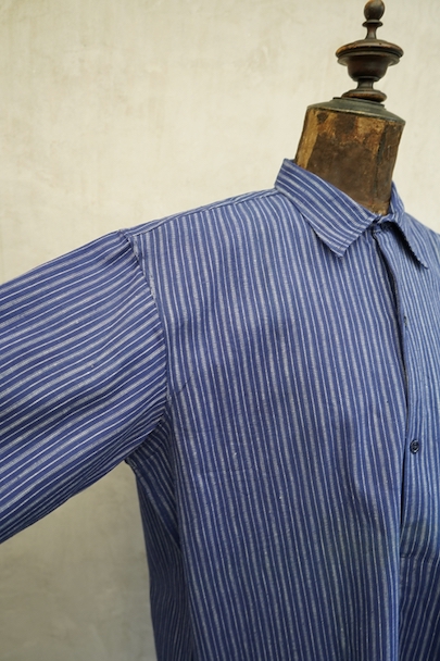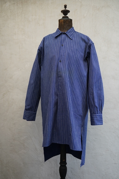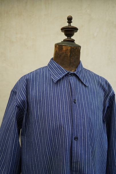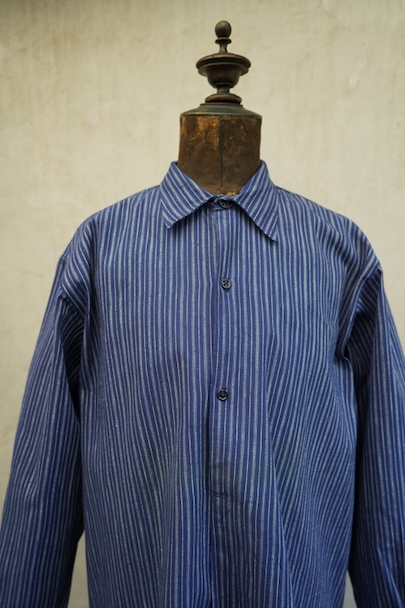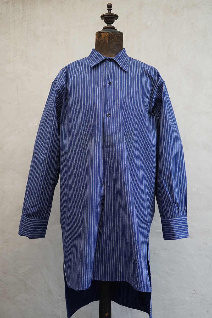 1940年代頃につくられたプルオーバー・シャツ。デッドストックを一度洗濯しています。ストライプ織り柄のネイビー・カラーのコットン素材、少し裏起毛しています。ボタンはガラス製。表記サイズは41です。保管中の傷みはなく状態は良いです。