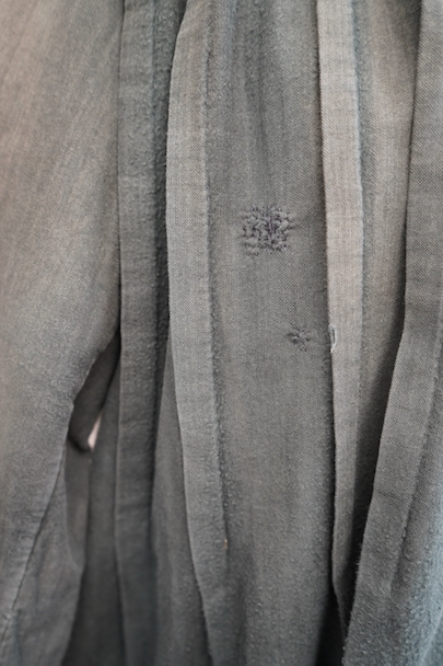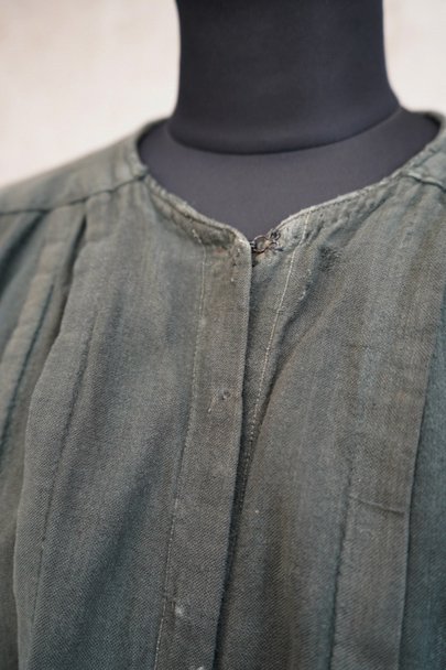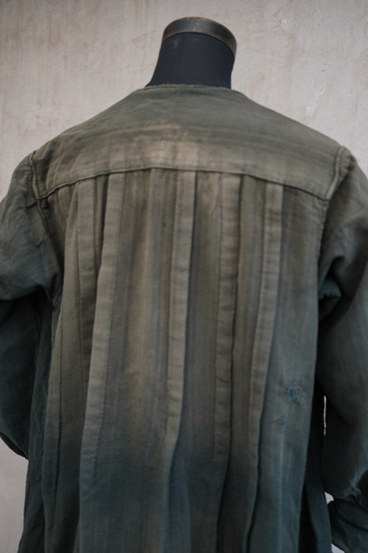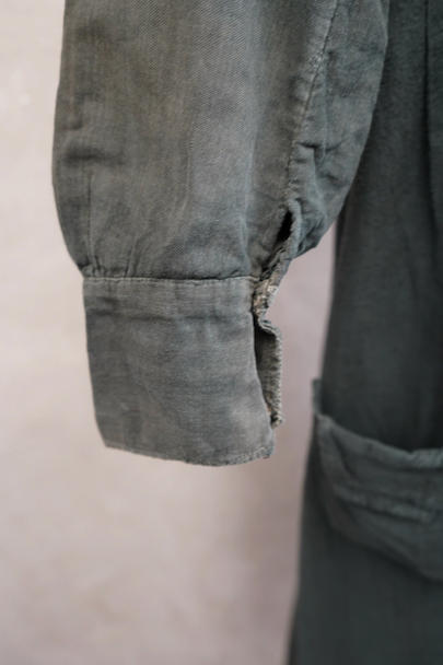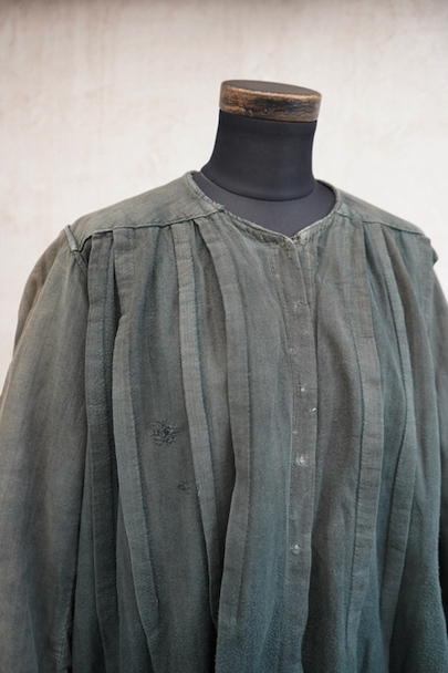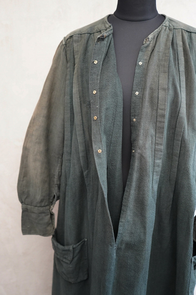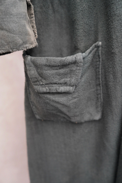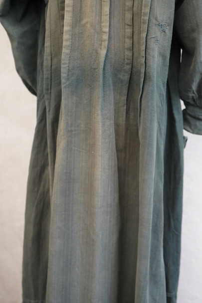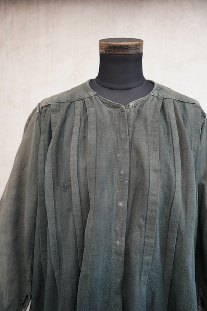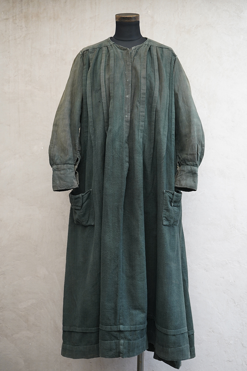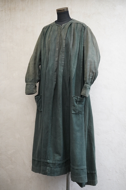 1910年代から1930年代頃につくられた古く良い存在感のあるスモック/ドレス。若干起毛した中厚手のコットン素材です。色褪せや手縫いの直し痕が良い風合いとなって、独特な雰囲気があります。全体的に色やけ、手縫いの直し痕や擦れ、シミなどかなり使用感があります。フロントはと袖口はスナップボタン留めです。