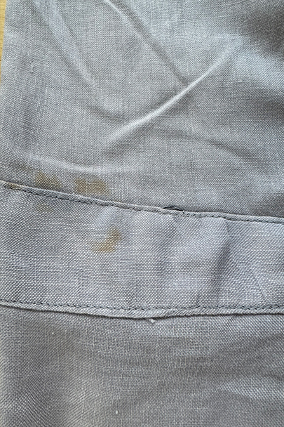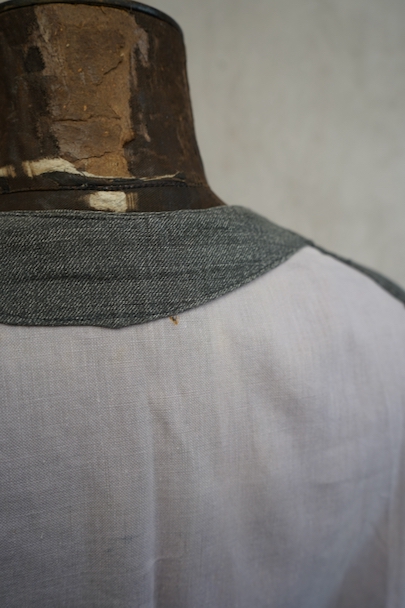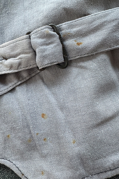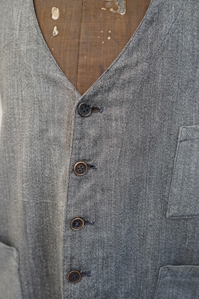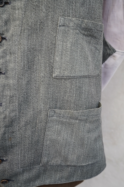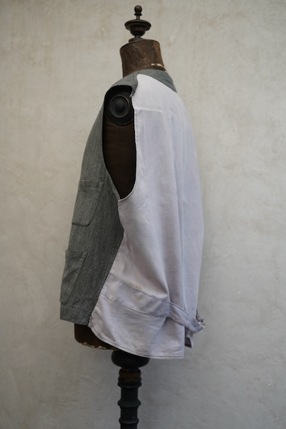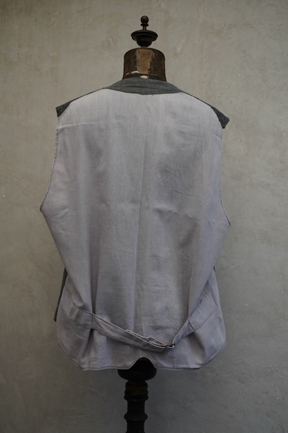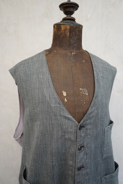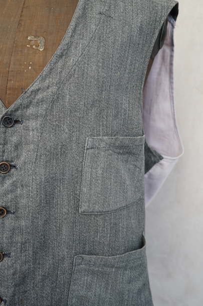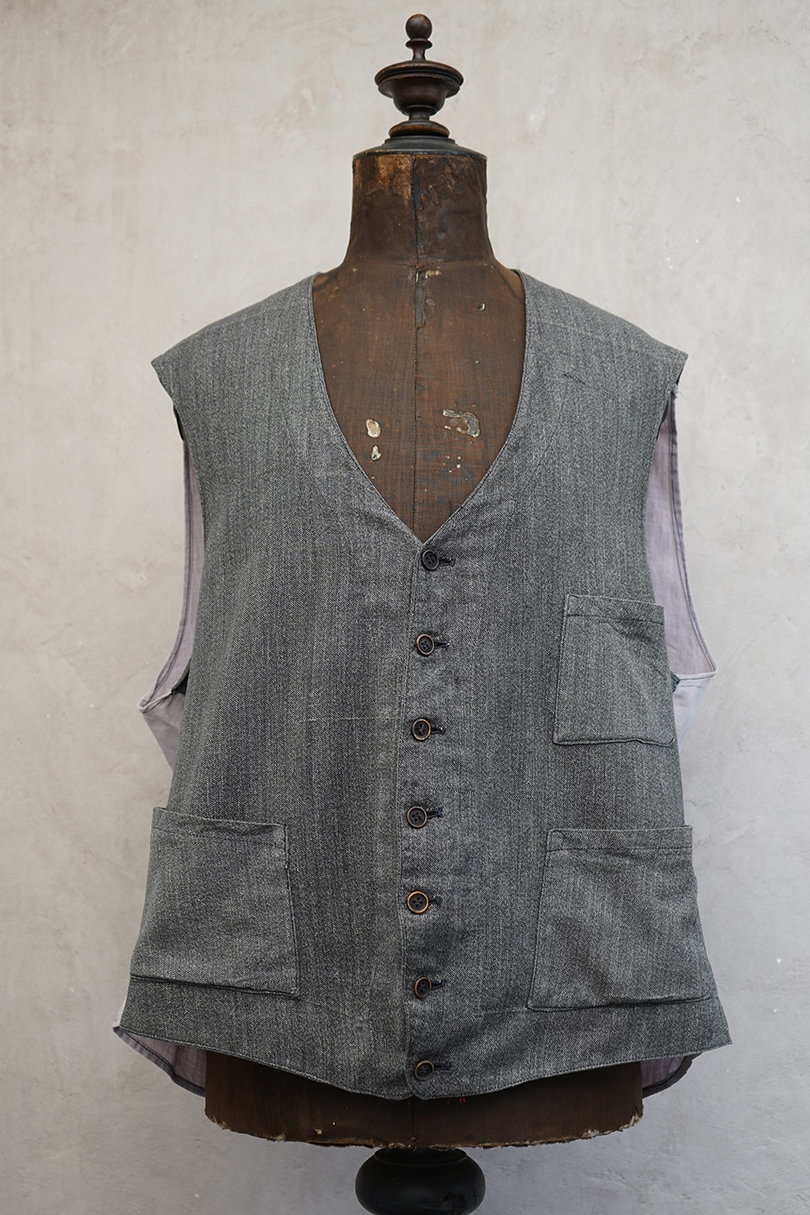 1930年代から1940年代頃につくられたワーク・ジレ。前身頃はかなり薄手のごま塩コットン素材、後ろ身頃も薄いコットン素材が使われ、とても軽いです。フロントに傾斜のついた3つのパッチポケット。前立てにはウッド・ボタンがついています。バックシンチで身幅の調節ができます。後ろ身頃を中心に薄いシミ、バックシンチ周辺にポツポツとサビ染み、後ろの首元にサビ染みと小さい穴があります。