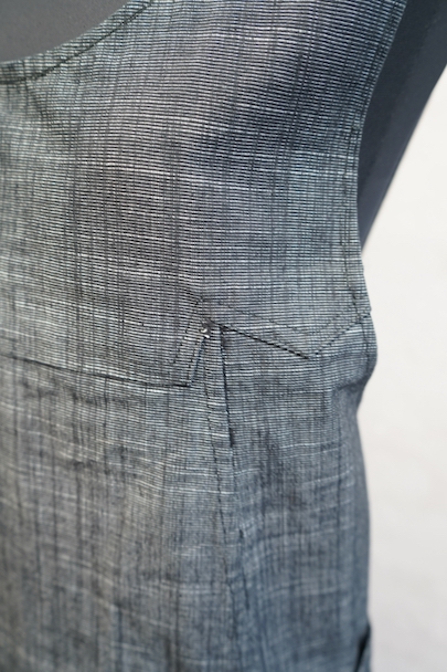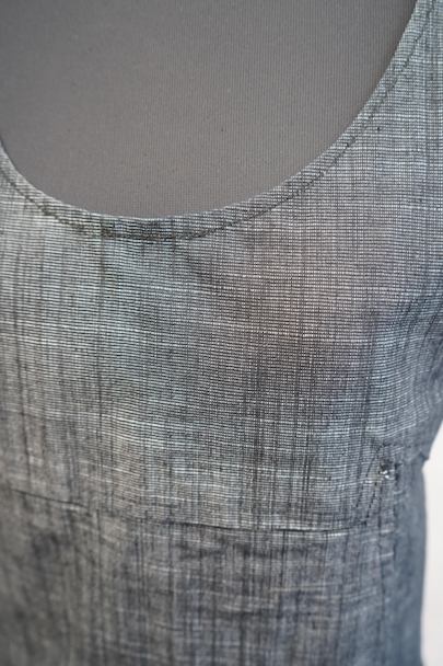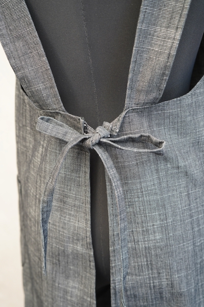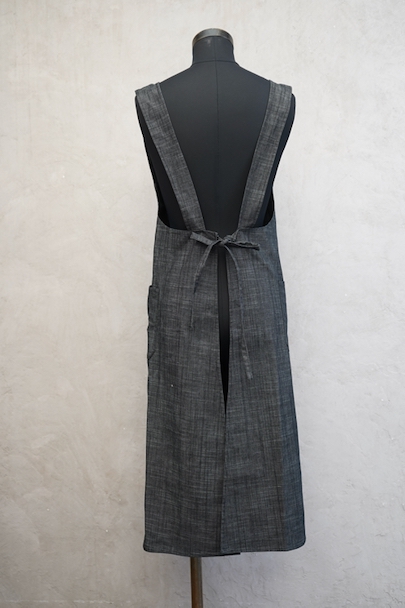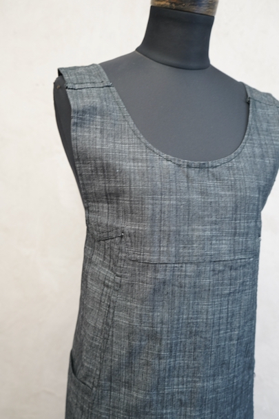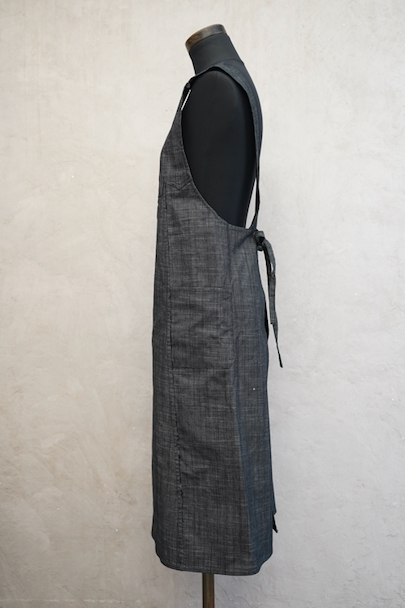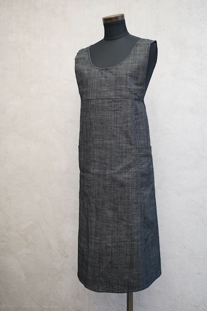 1930年代から1940年代頃につくられたエプロン・ドレス。未使用品を一度洗濯しています。ハリのあるブラック・シャンブレー生地、程よく厚みがある良い布地です。左右にポケット付き。糸の出ているところがあるなど縫製に荒さが見られますが、保管中の傷みはなく状態は良いです。