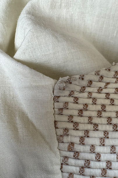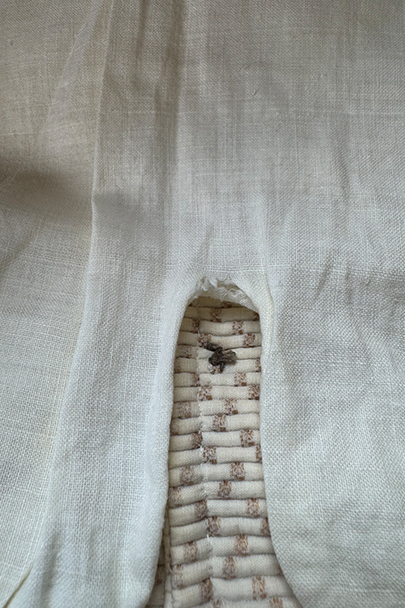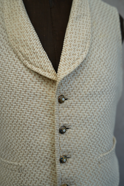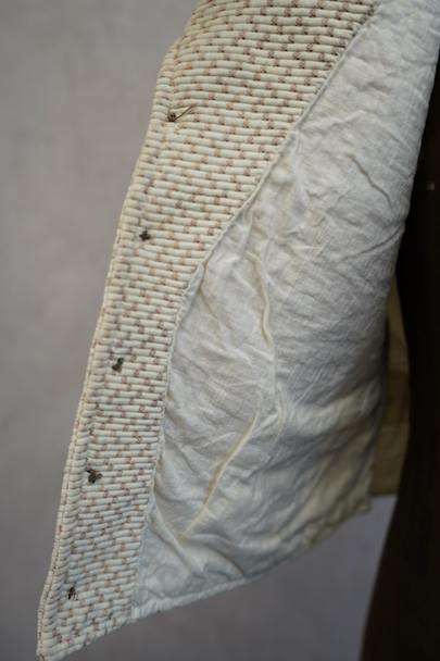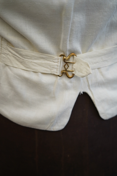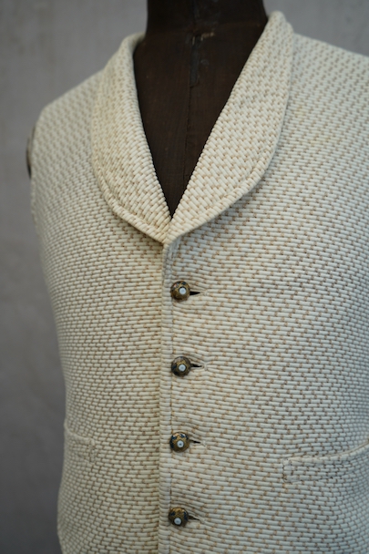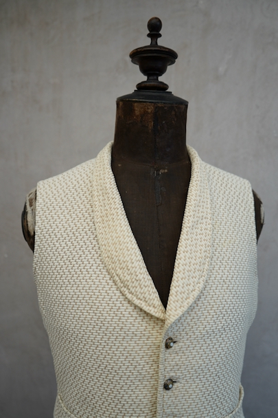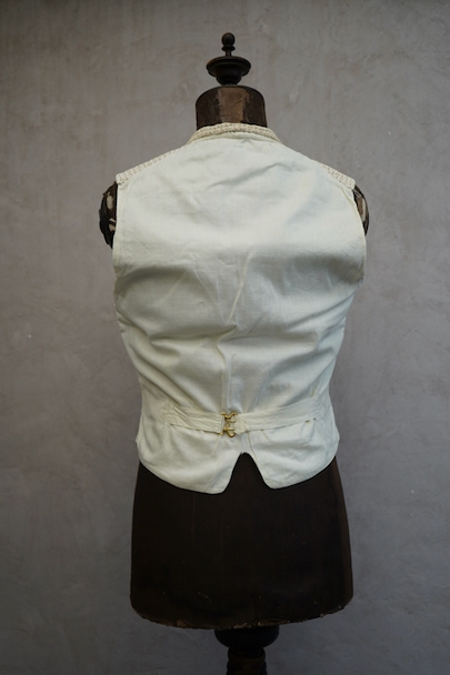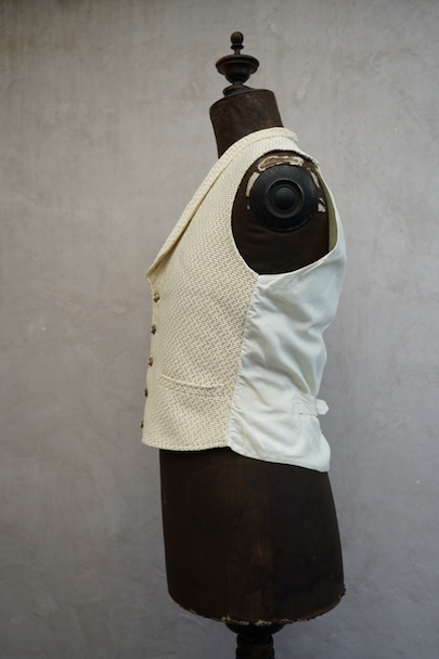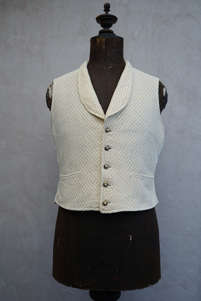 20世紀初期頃までにつくられたショール・カラー・ジレ。前身頃にベージュのドット柄が入ったコットン・ピケの珍しい布地が使われ、後ろ身頃と裏地にはガーゼのような薄い布地が使われています。フロントの5つのボタンは細かい装飾のメタルボタン、元々の青いペイントが所々残っている状態です。バックシンチで身幅の調節ができます。珍しいデザインの2本挿のバックルがついています。多少の擦れやほつれはありますが、状態は良いです。小さいサイズのため女性におすすめします。