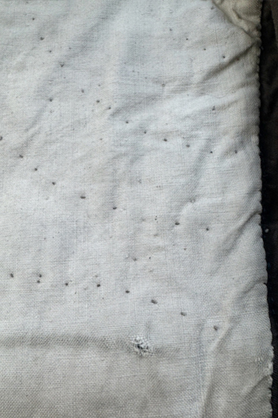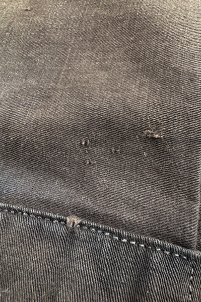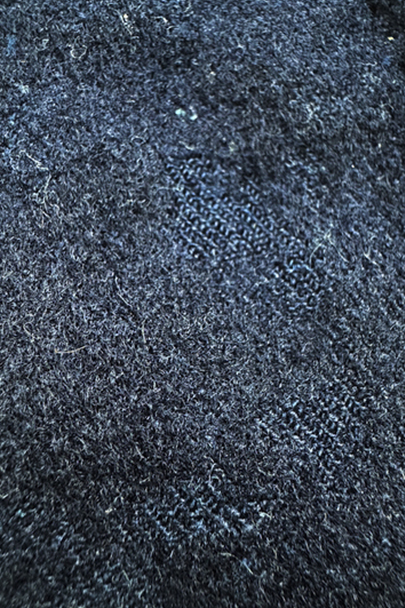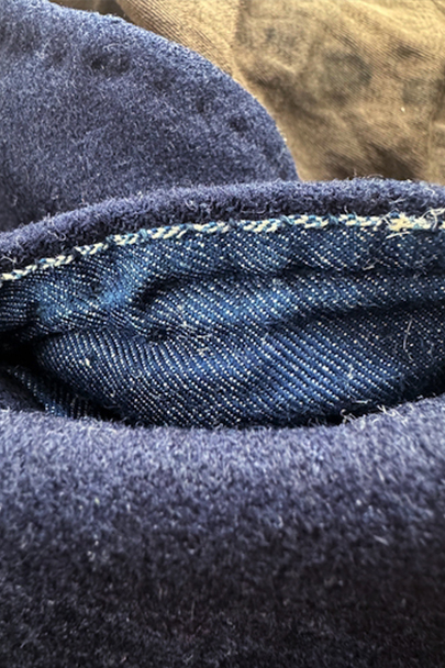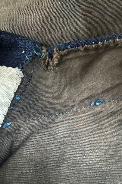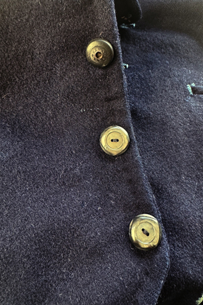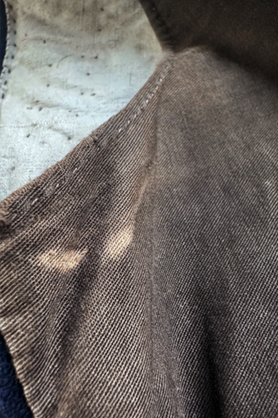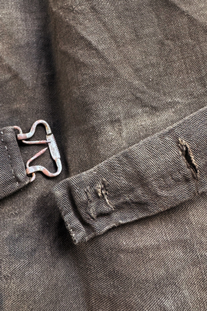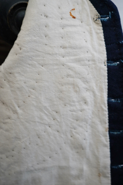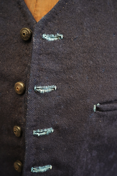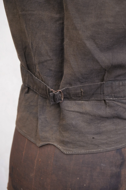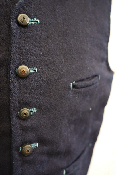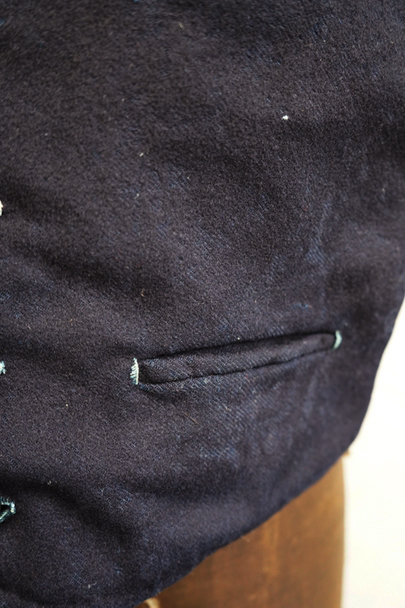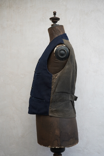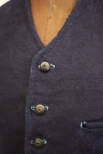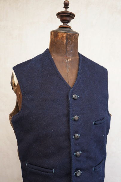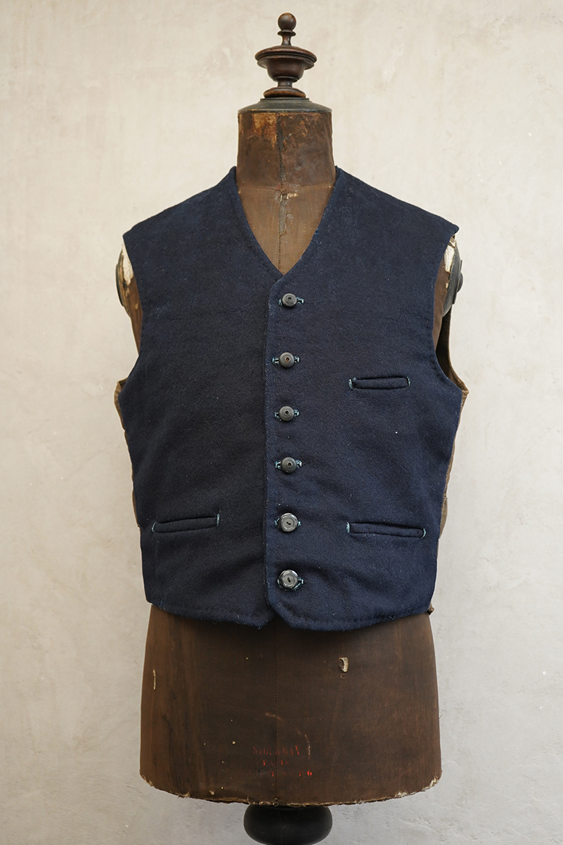 20世紀初期頃までに全て手縫いでつくられたジレ。前身頃はインディゴ染めウール素材、厚みのある味わい深い布地です。左胸にとても小さなポケット、左右の2つのポケットの内側には初期のデニムとも言えるインディゴ染めサージ素材が使われています。フロントのボタンはホーン製でしょうか、とても風合いの良いものがついています(下方の2つはつけ替わっています)。ボタンホールは手縫い。前身頃の裏地はリネン製。フロント部分の布地全体的に起毛がなくなった部分があり、バックのストラップなどに穴、擦れやほつれがあるなど、経年の傷みはありますが、素材や年代を考えると状態は良いです。小さめで女性におすすめのサイズですが、素材のサンプルとしても価値がある品です。