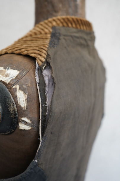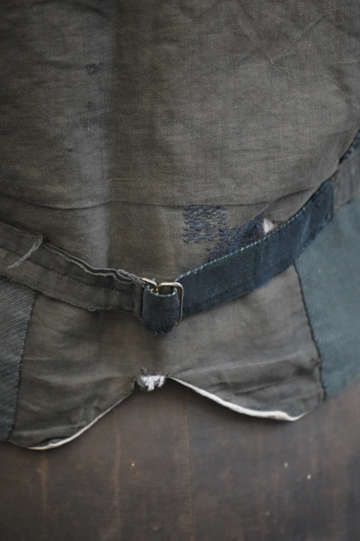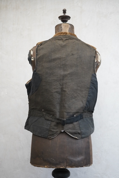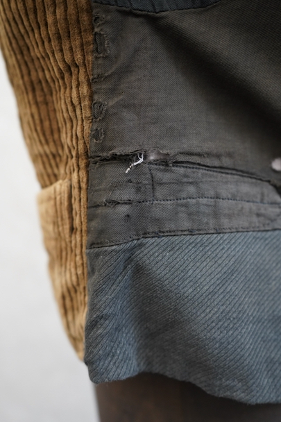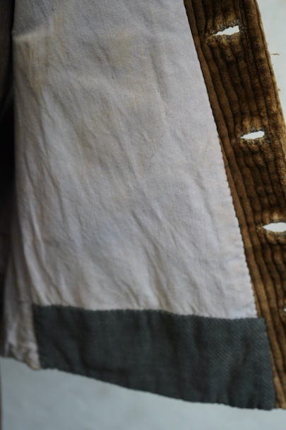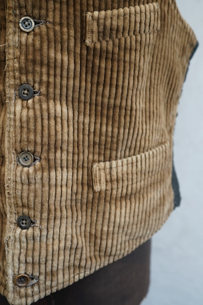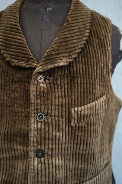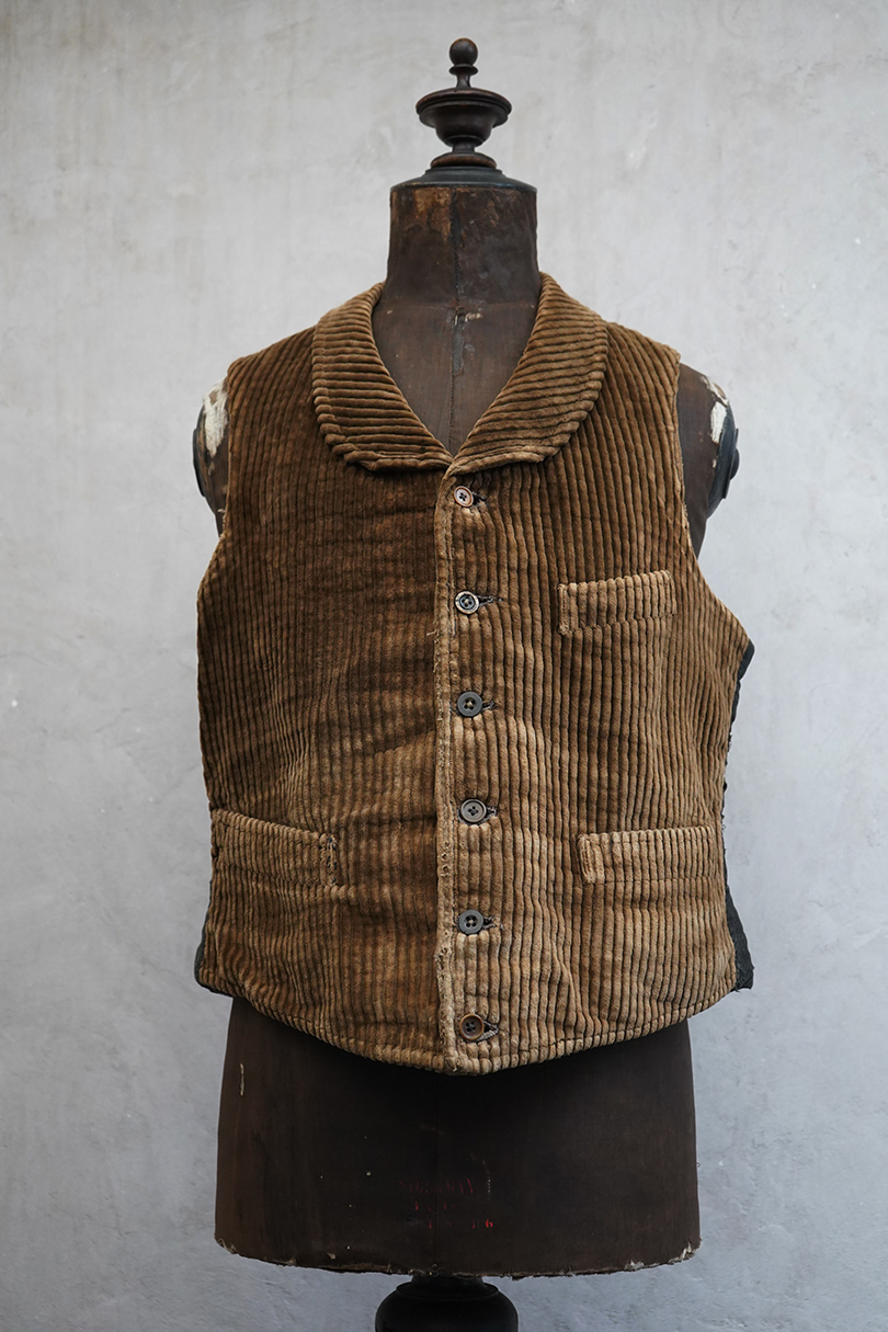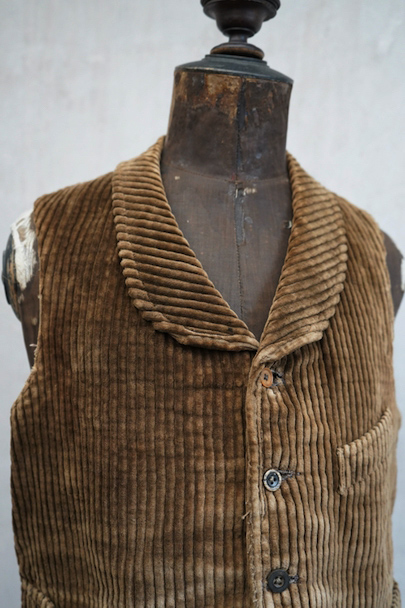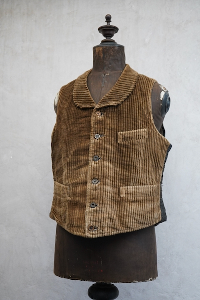 1930年代頃までにつくられたショールカラー・ジレ。前身頃のブラウンのコーデュロイはかなり太畝で存在感のある布地です。フロントに3つのセットイン・ポケット、バックシンチで身幅の調節が可能です。後ろ身頃は穴や擦れなどのダメージが多いですが、布が当てられたり、ダーニングの直しがされていたりと良い味わいがあります。全体的に擦れやほつれ、裏地に破れやシミがあるなど、経年のダメージがあります。