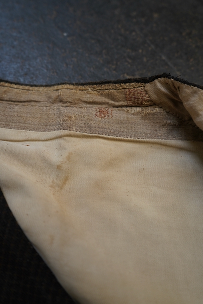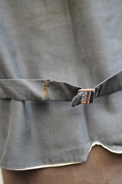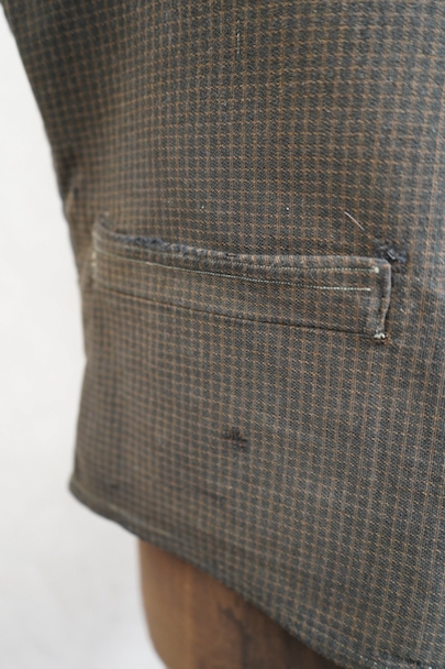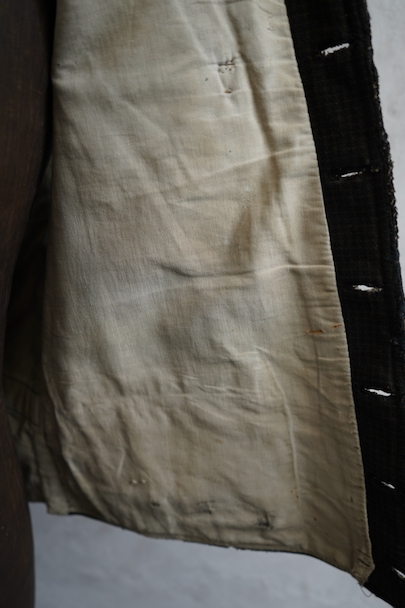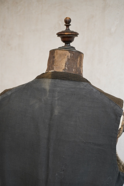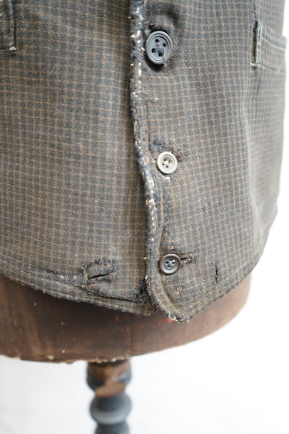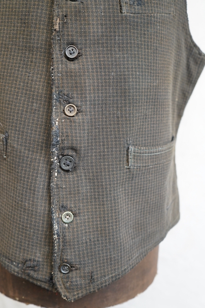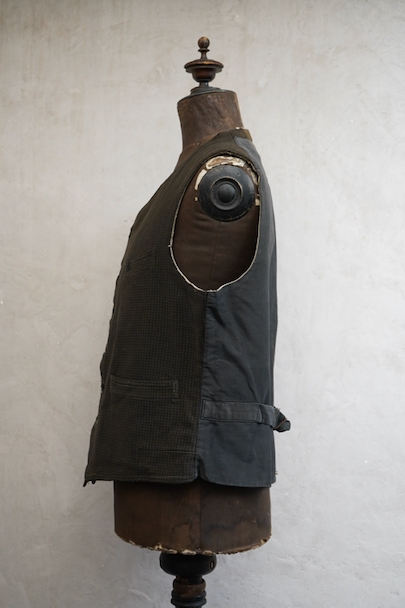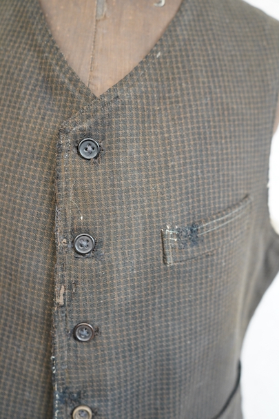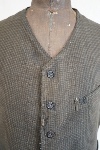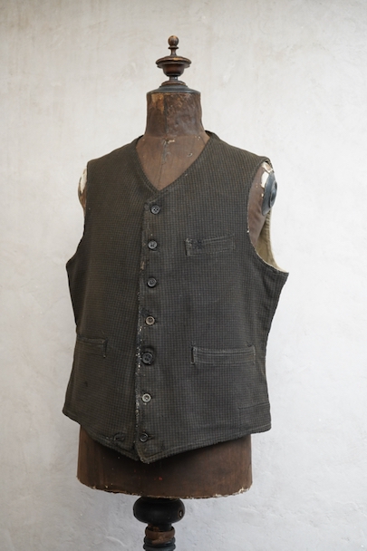 1930年代頃までにつくられたジレ。前身頃がブラウンのチェック柄のウール素材、詰まったネックラインの形と相まって、良い味わいがある品です。ボタンは色々なものにつけ替わっています。バックシンチで身幅の調節が可能。前立てを中心に擦れた痛み、穴、直し痕が多くあり、しみ、ほつれ等、かなり使用感があります。