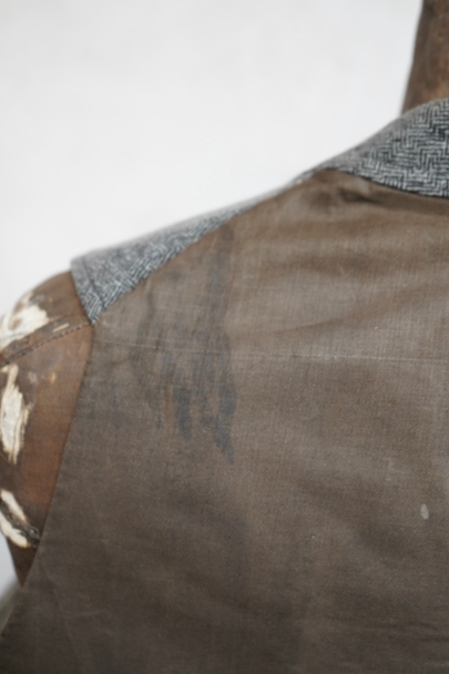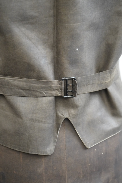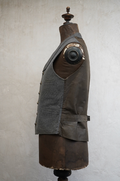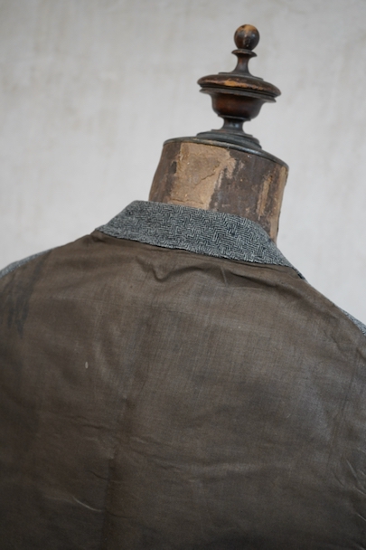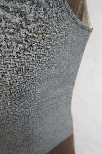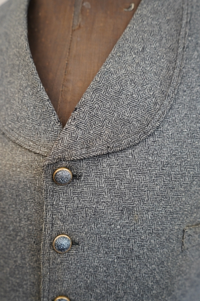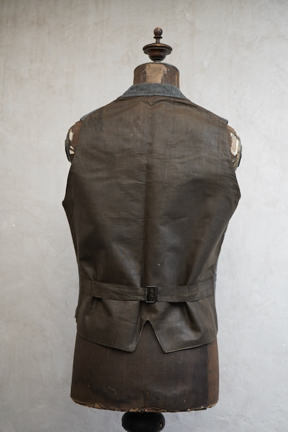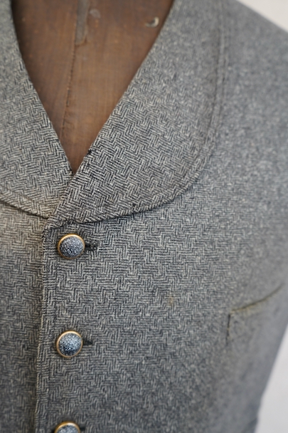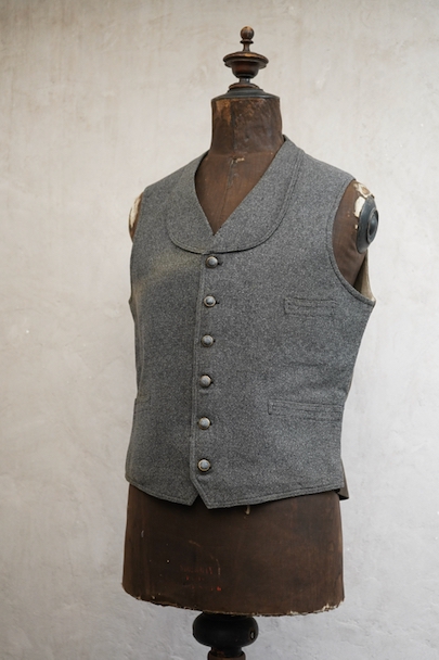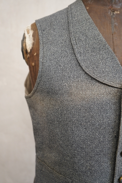 20世紀初期頃につくられたジレ。細かい柄の入った織りのウール素材がフロントに使われ、それに合わせて美しいボタンが配された品。ショールカラー、3つのポケット。バックシンチで身幅の調節ができます。使用感はないのですが、フロント中央あたりに薄く畳焼けがあり、バックなどにシミ、襟部分などウール地に小さな穴がいくつか見られます。