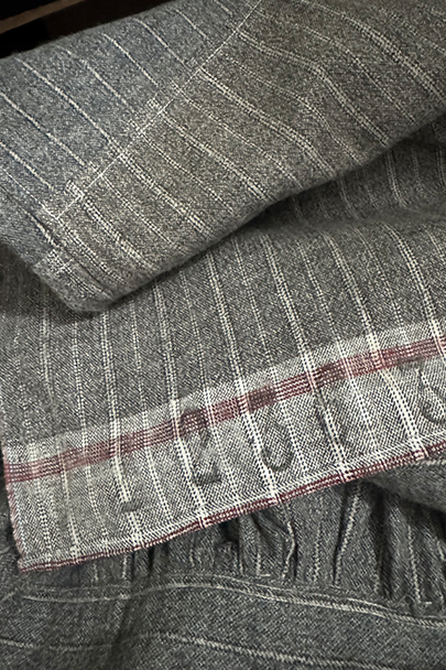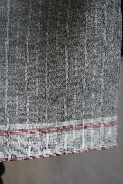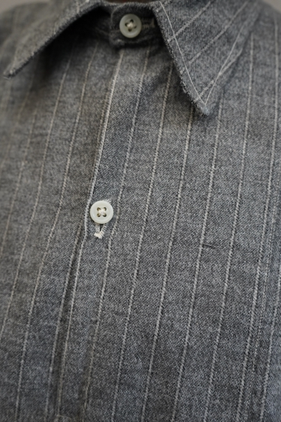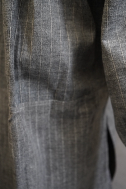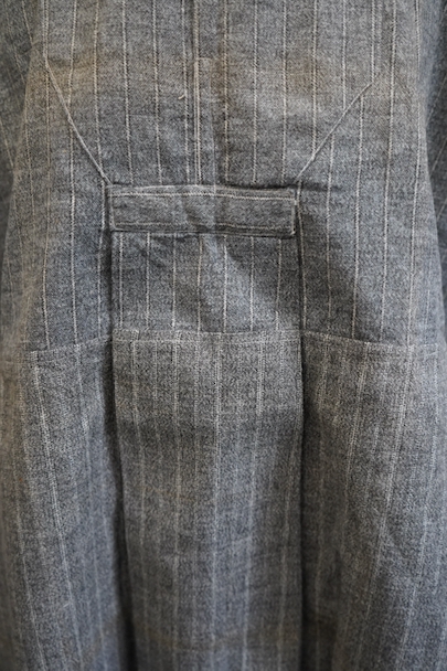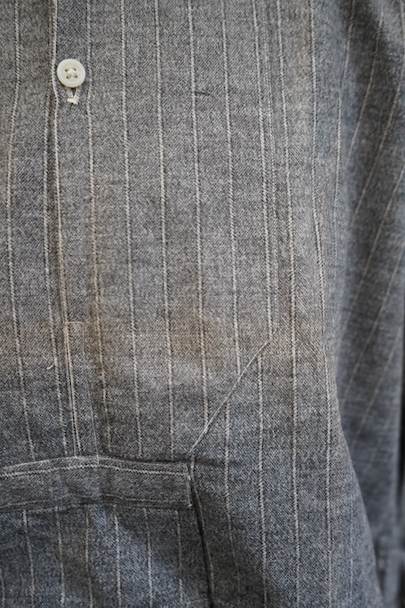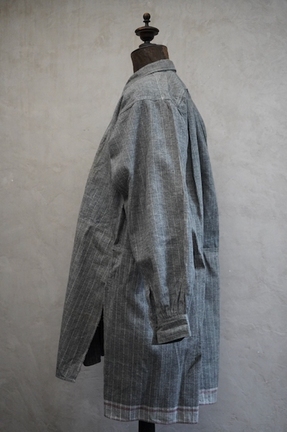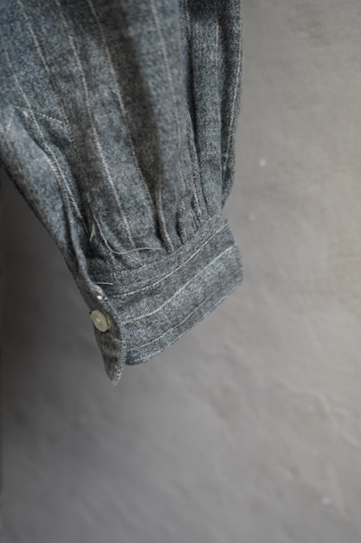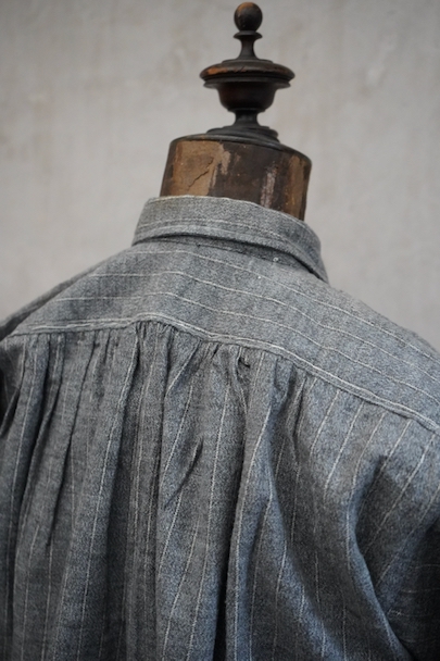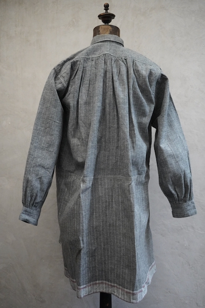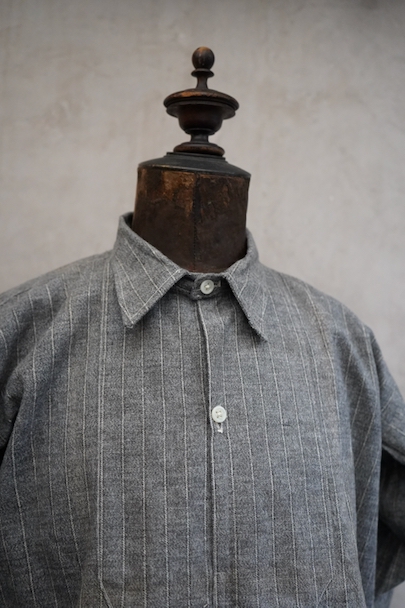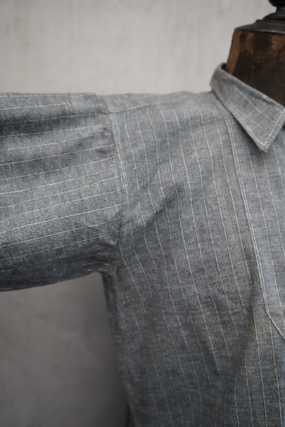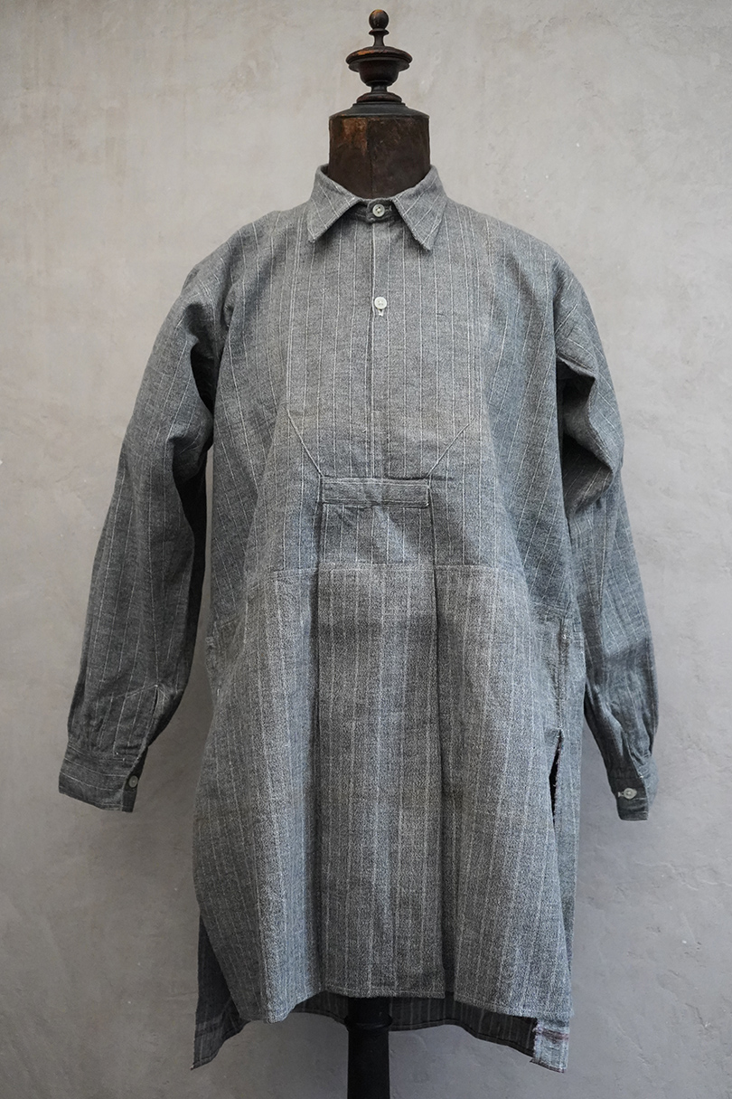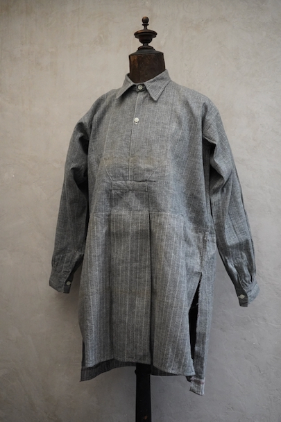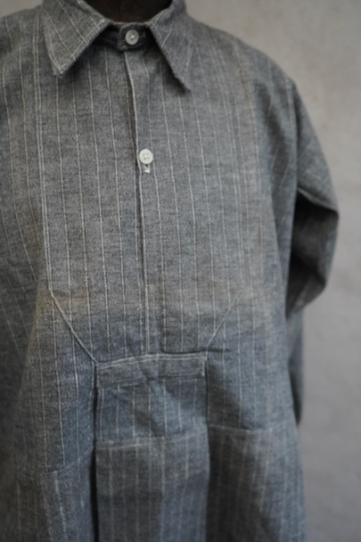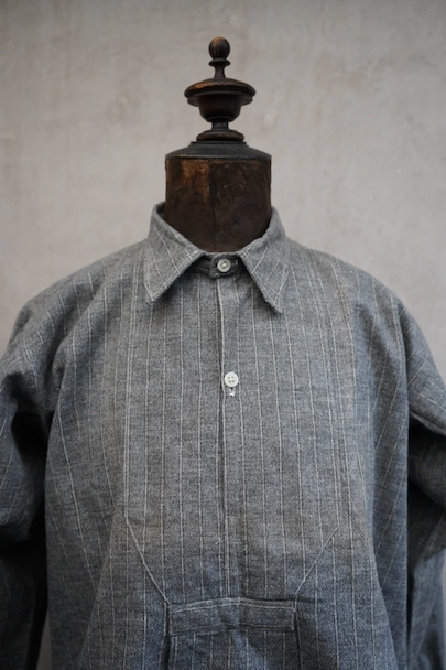 1930年代頃までにつくられたプルオーバー・シャツ。グレーに細いストライプが入ったコットン素材、身頃中央部で別布を接いでいます。裾部分にスタンプの入った耳部分が使われているのも味わいがあります。胸当てとヨーク部分は2枚布になっています。バックのヨークしたとカフ部分にギャザーが入り、ゆったりとしたシルエット。ボタンはガラス製、ボタンホールは手縫い。フロント胸部分に保管中についた畳み焼けがあります。その他は特に目立ったダメージはなく状態は良いです。