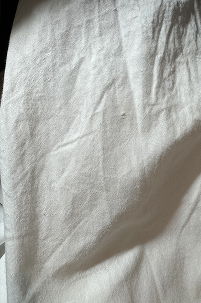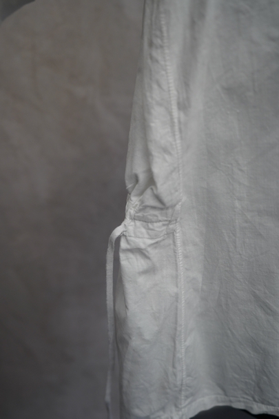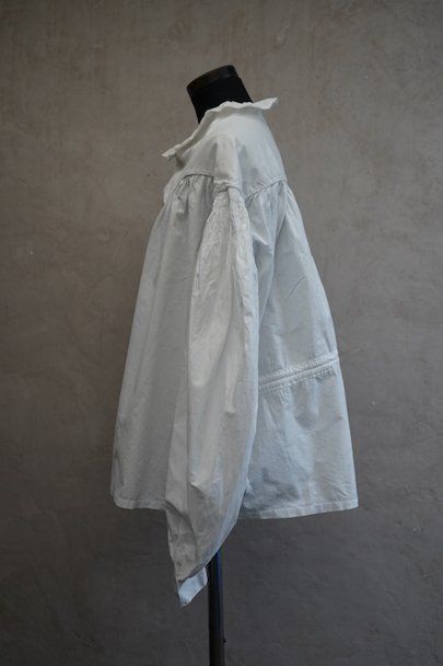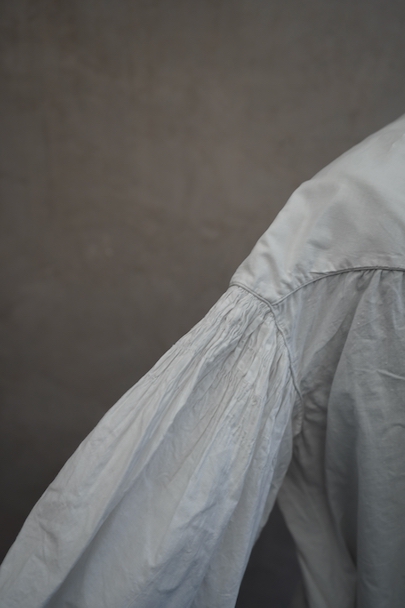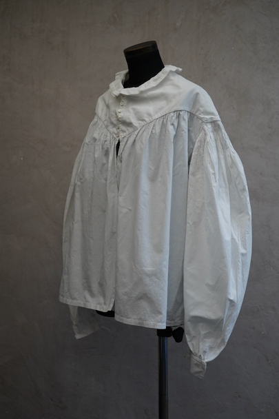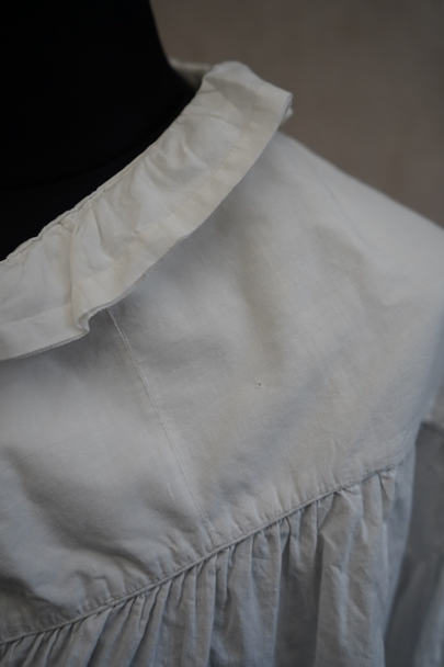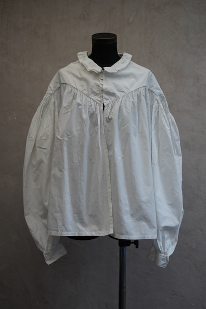 19世紀につくられたギャザーブラウス。コットン素材です。肩の落ちるつくりで、袖やヨーク下に細かく施されたギャザーがとても美しい品です。全て手縫いでとても丁寧なつくりです。袖口周りに擦れや直し痕がありますが、直し痕は一見わからない程度の丁寧なものです。その他小さな染みや点のような穴があります。とても良い品なので、古いものが好きな方やダメージを気にされない方にお勧めです。