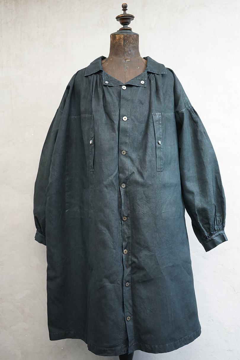 20世紀初期頃までにつくられた"biaude"というインディゴ染めリネン・スモック。フロントが全開するコートタイプです。家畜の仲買人、農民などに着られた目の詰まった薄手のリネン素材の美しいワークウエアです。生地やシルエットは勿論、ネックに入った細かいギャザーや肩のY字のヨーク、ボタン留めのラペル、大きな胸ポケットなど細部に至るまでアンティークの良さがつまった品です。黒蝶貝のボタン、手縫いのボタンホール。腰の両サイドに内部にアクセスできる開きがあります。バックなどに若干の汚れはありますが、穴などのダメージが一切ない非常に良い状態です。元々は男性用ですが、女性がオーバーサイズで着るのもお勧めです。