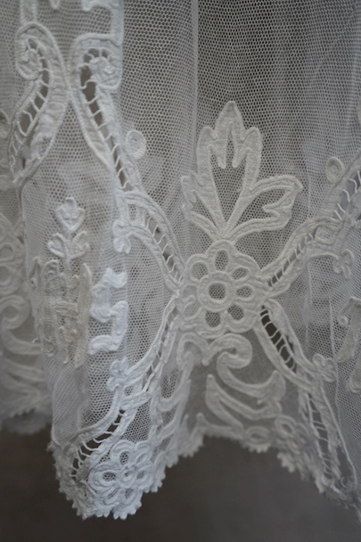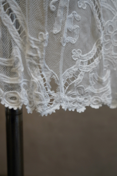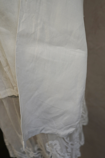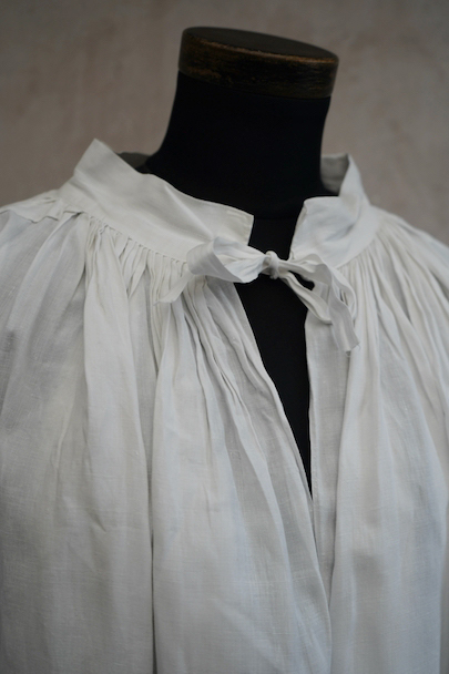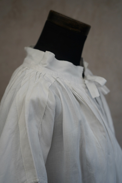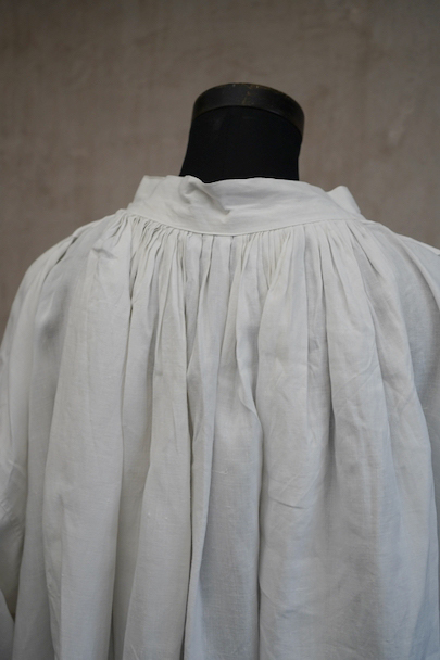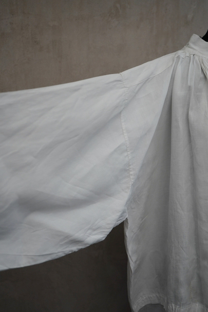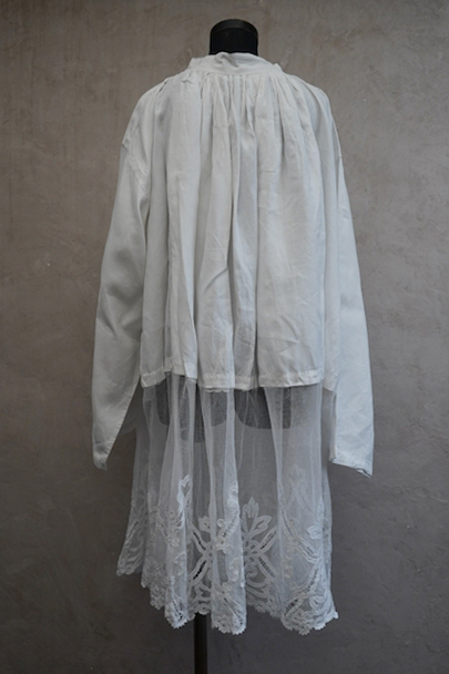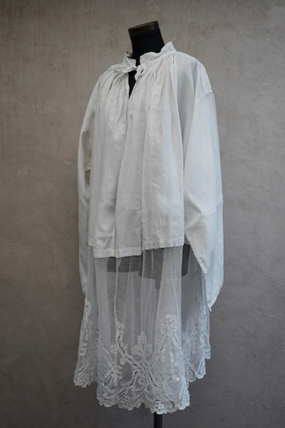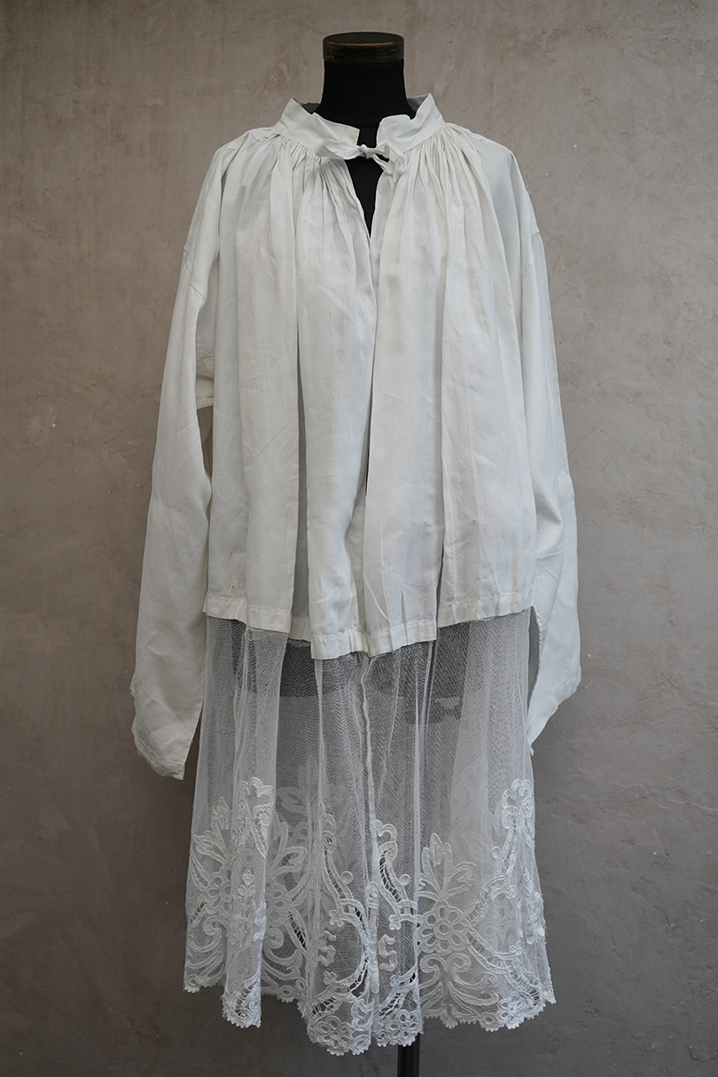20世紀初期頃につくられたチャーチ・スモック/チュニック。上部はリネン素材、レース部分はコットンです。ネック周りに細かいギャザーが入り、ボリュームのあるシルエット。レースに大小の穴が多数あります。リネン地にも直し痕がありますので、ダメージを気にされない方にお勧めします。元々男性用ですが、女性が着ると素敵です。